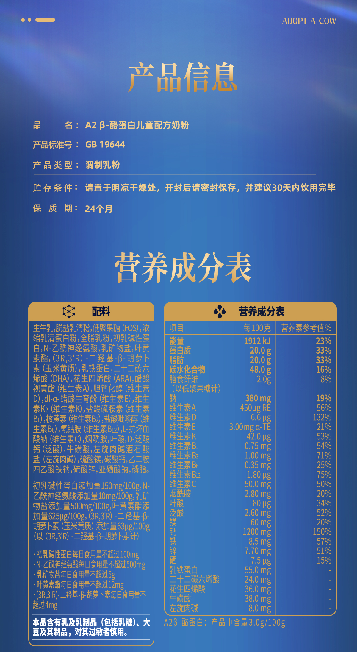 认养一头牛A2 β-酪蛋白儿童奶粉乳铁蛋白CBP成长高钙营养奶粉