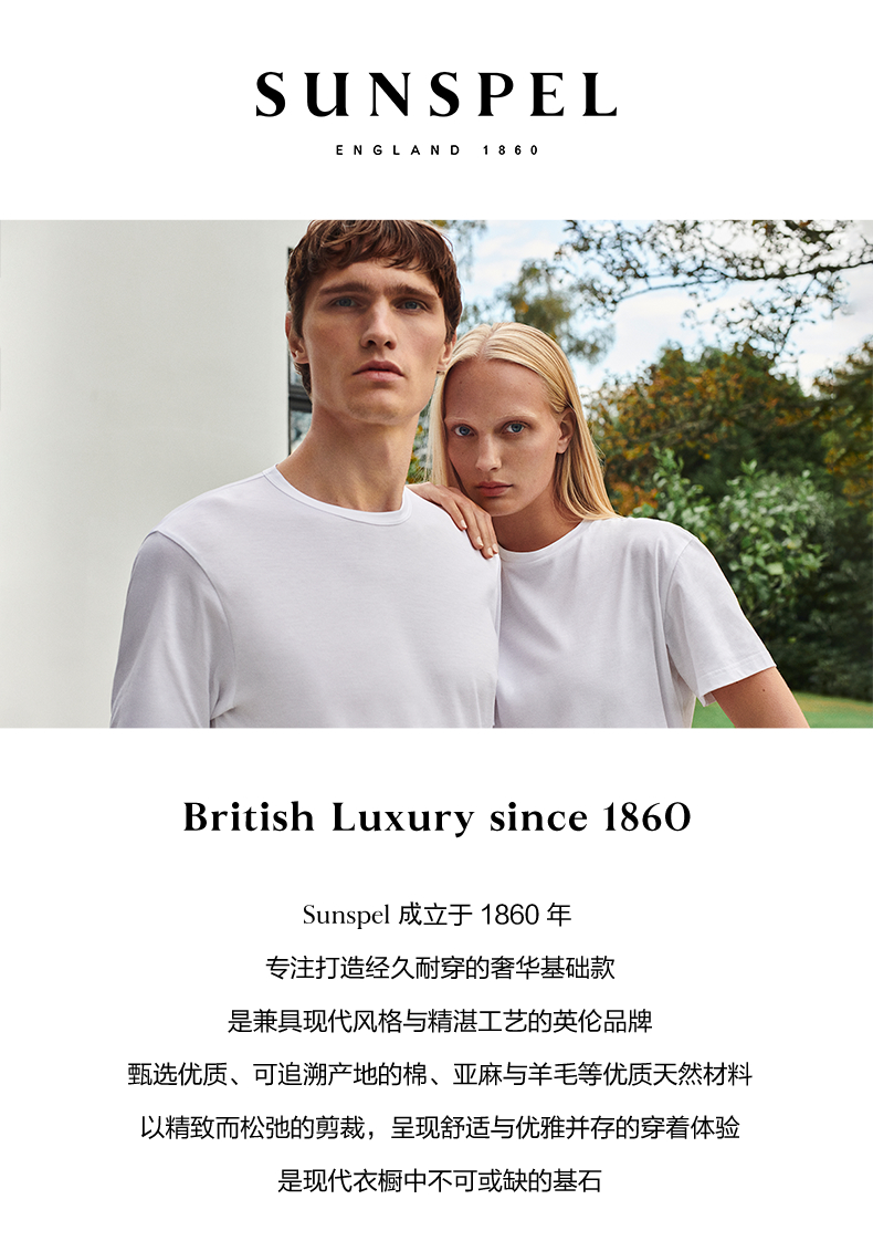 - Sunspel 成立于 1860 年,是具有现代气息的创新英国品牌,专注为客户提供耐穿不过时的基础款,同时满足摩登品味。服饰采用优质的、可追本溯源的原材料 —— 棉、亚麻和羊毛制作。