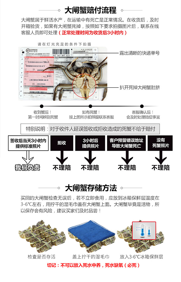 退货地址:生鲜无退货,一旦发出不能拦截,如客户收到货后有死蟹按只赔偿