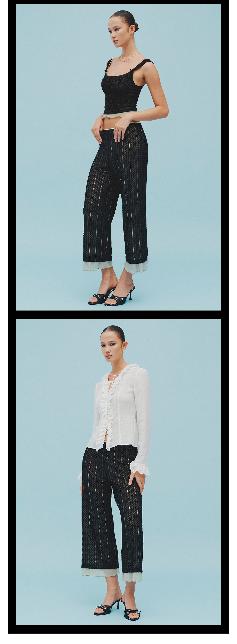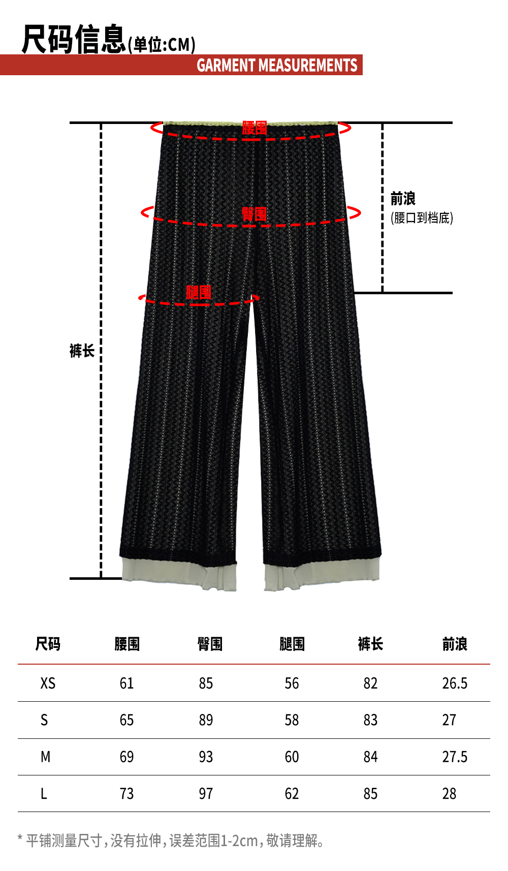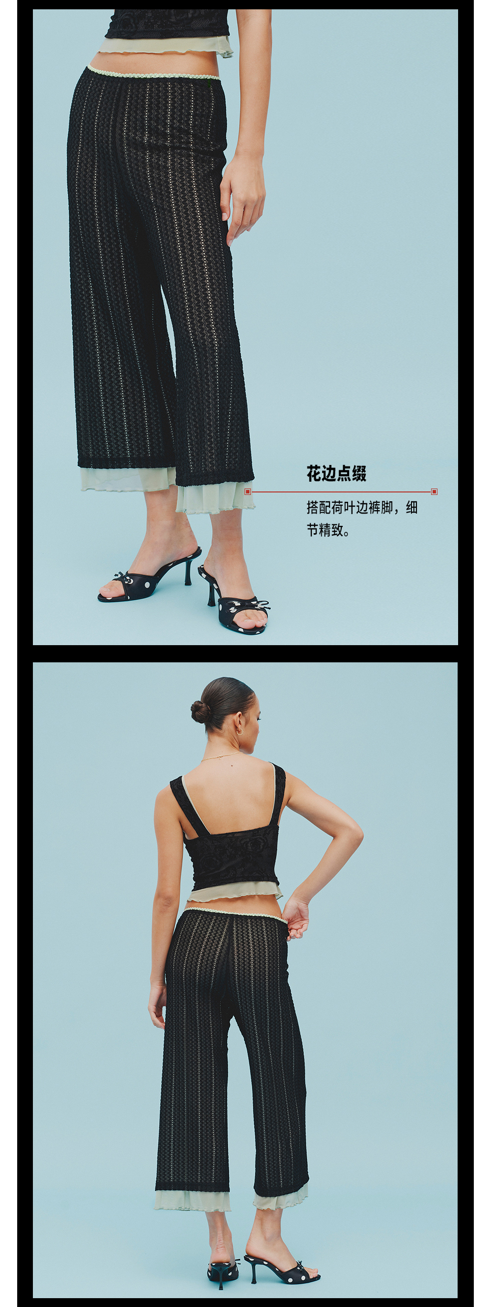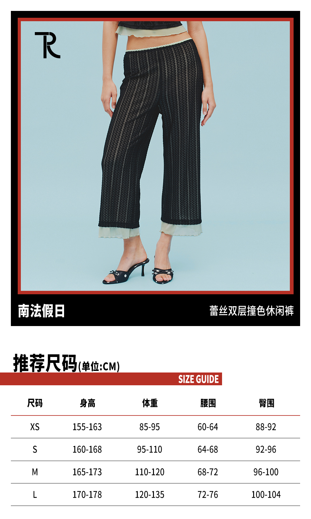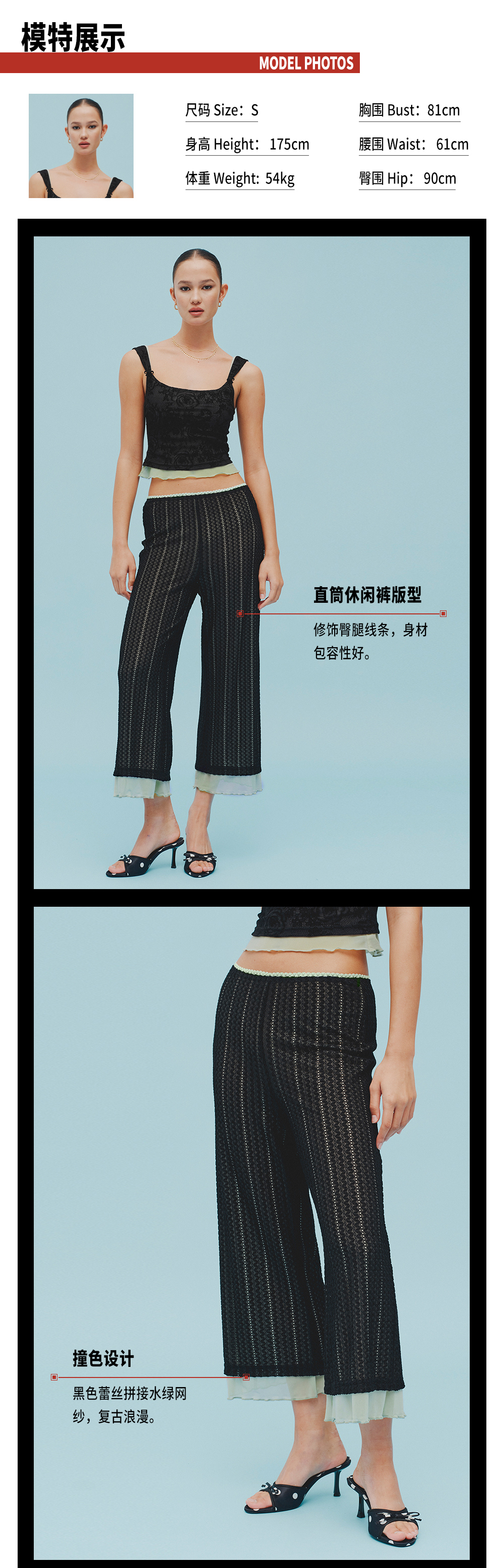 TR她热 南法假日 黑色蕾丝拼接撞色双层镂空复古花边度假感休闲裤