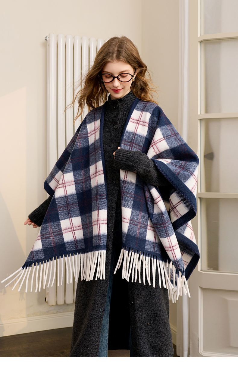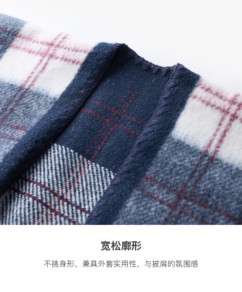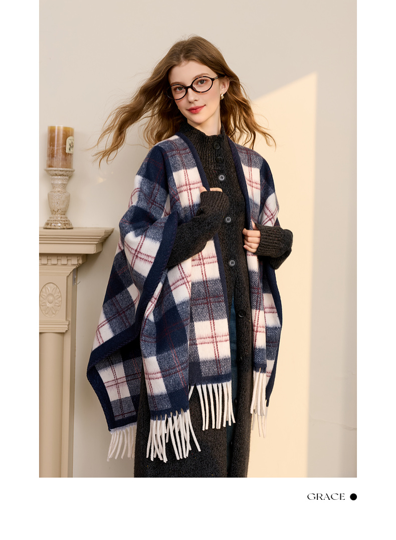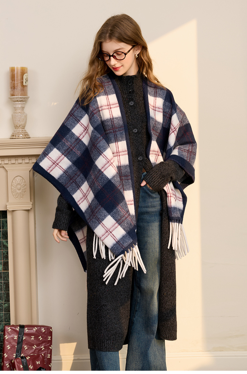 三彩2026新款学院风格纹披肩外搭复古流苏宽松廓形氛围感通勤女