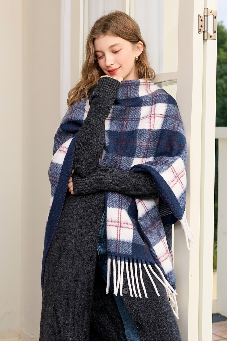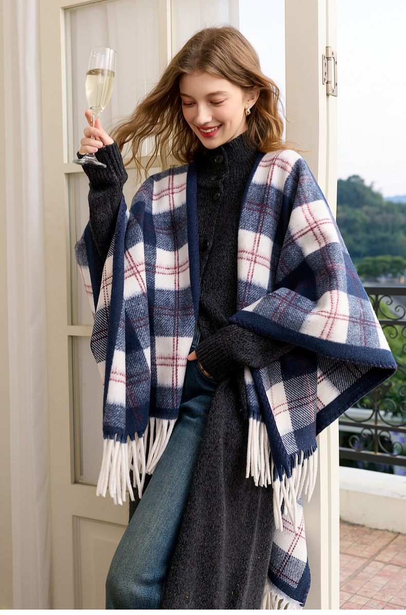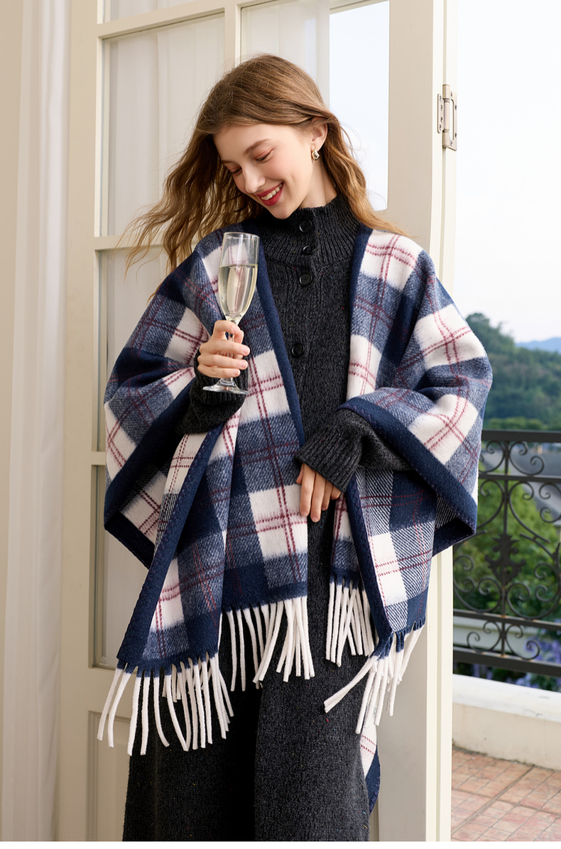 三彩2026新款学院风格纹披肩外搭复古流苏宽松廓形氛围感通勤女