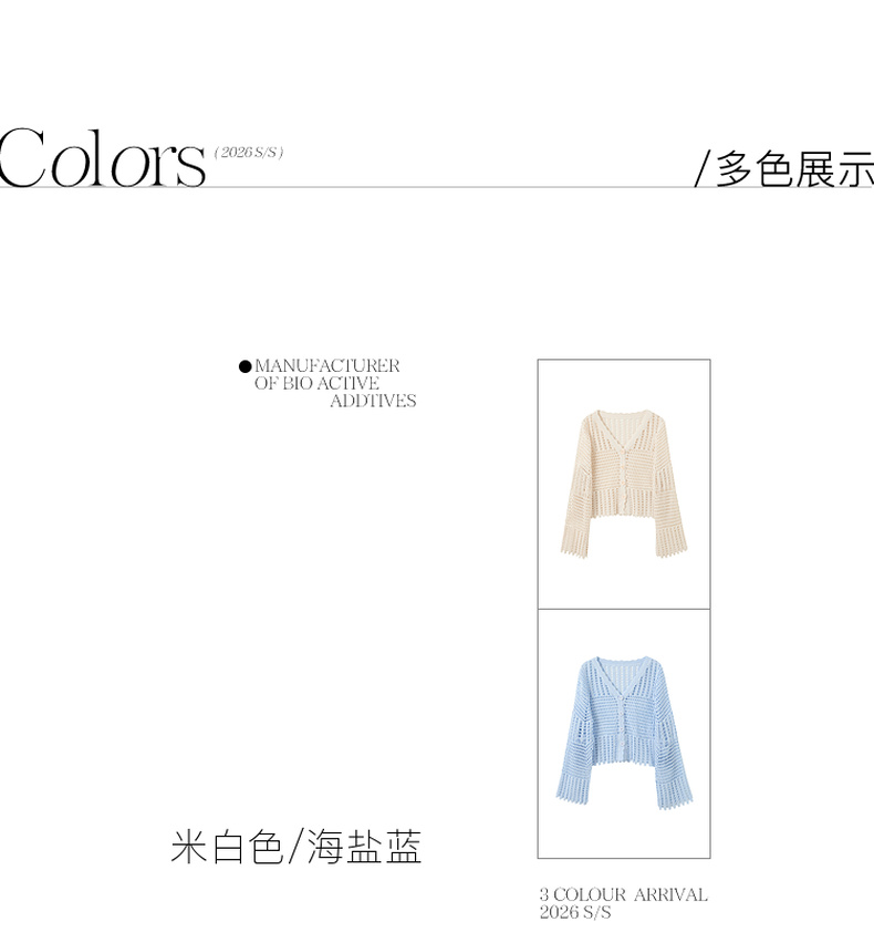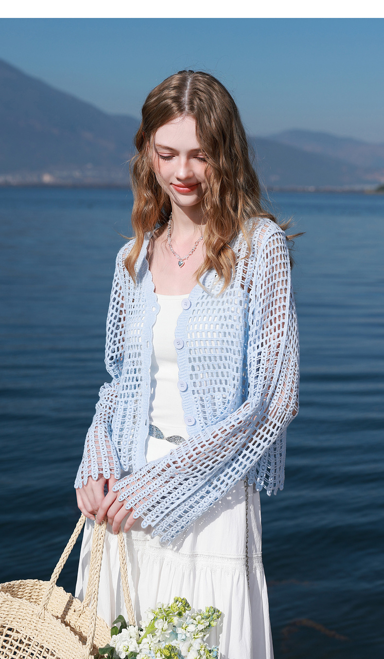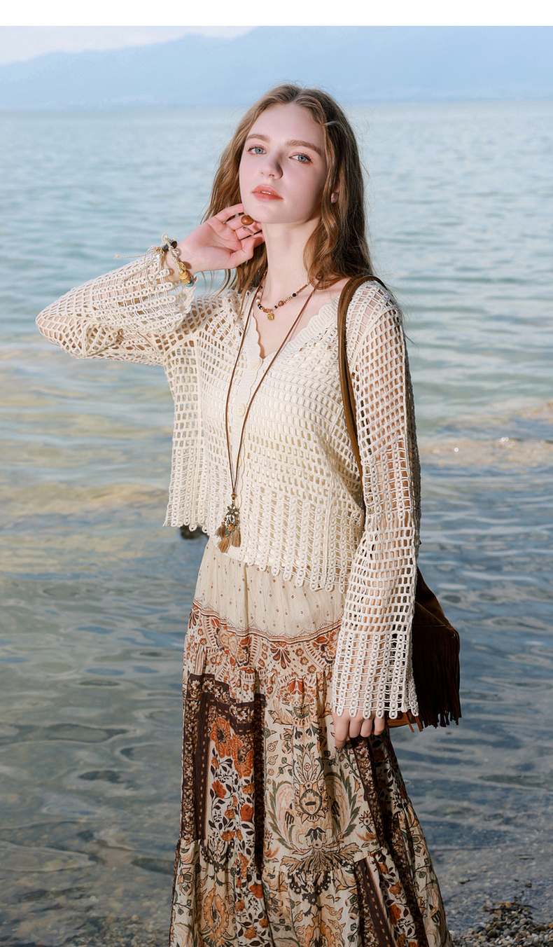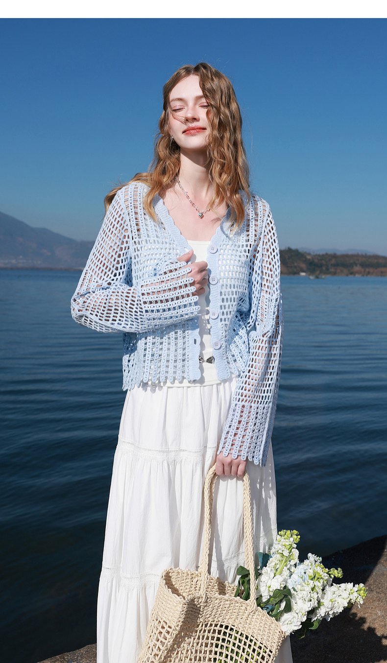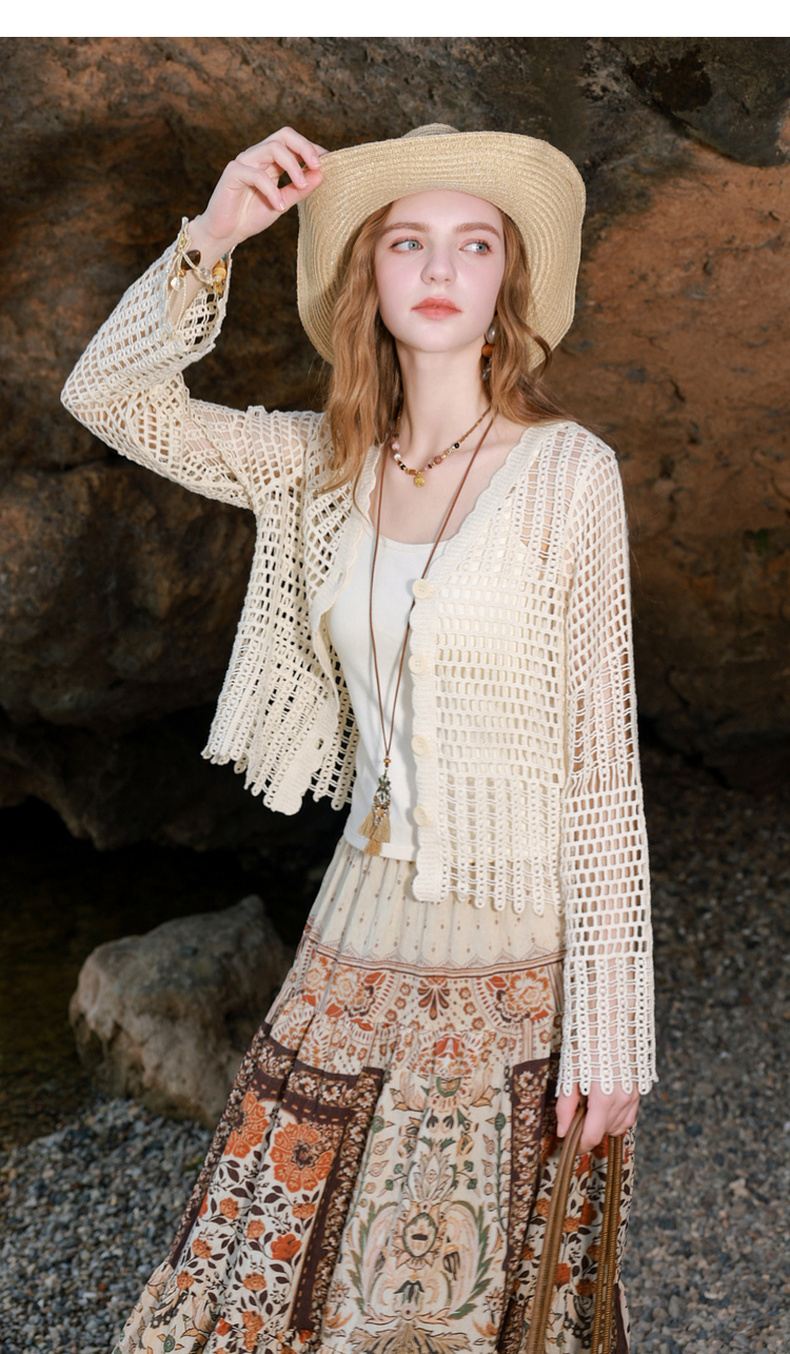 【100棉】三彩2026春季新款V领镂空罩衫针织衫宽松波西米亚开衫M