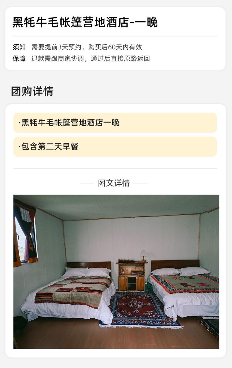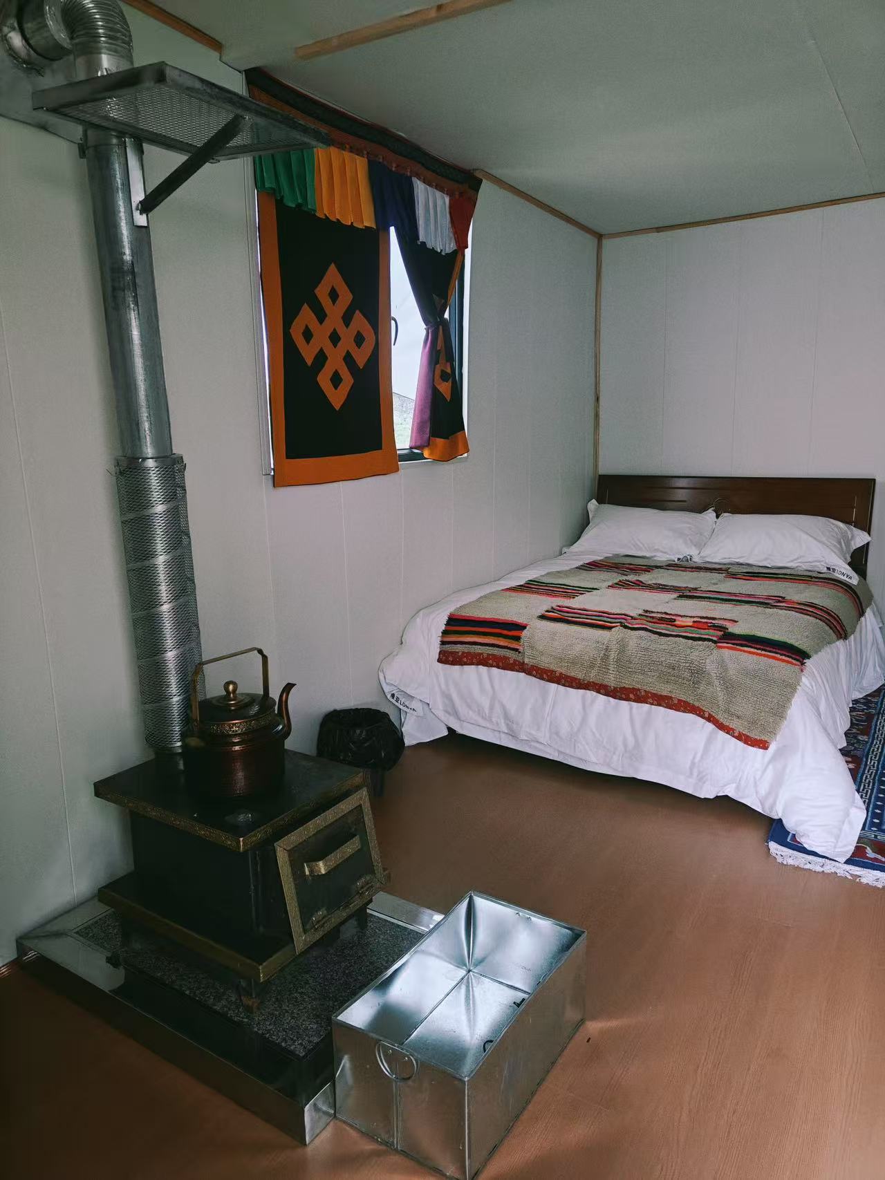 黑牦牛毛帐篷(标间):采用传统牦牛毛手工编织而成,极具藏地风情。每间帐篷配有2张1.5米的床,均配备取暖火炉,既可驱散寒意,也能烧水煮茶,让您在高原夜晚享受温暖舒适的居住体验。