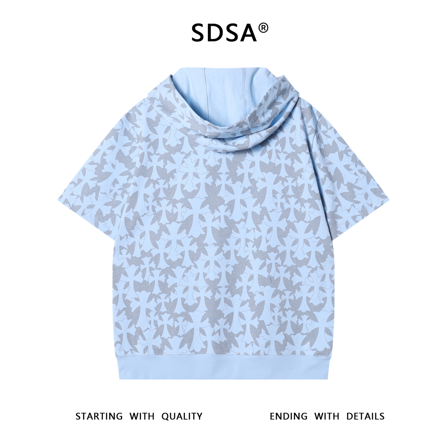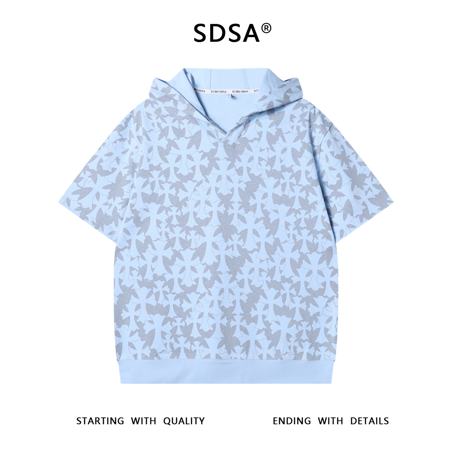 T3516夏季高级感新款男士满天星十字连帽短袖T恤小众设计撞色百搭上衣