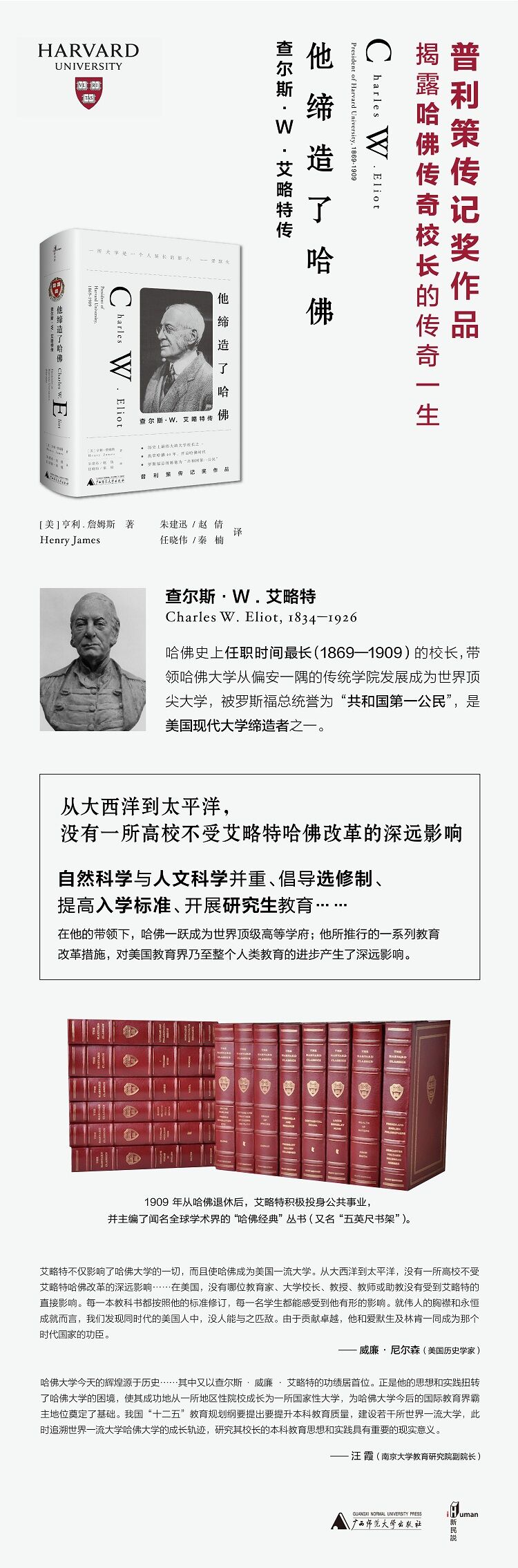 1909年从哈佛退休后,艾略特积极投身公共教育事业,并主编了闻名全球学术界的“哈佛经典”丛书,该丛书在五四时期即被胡适、赵元任等人介绍引进中国,又称“五尺丛书”。