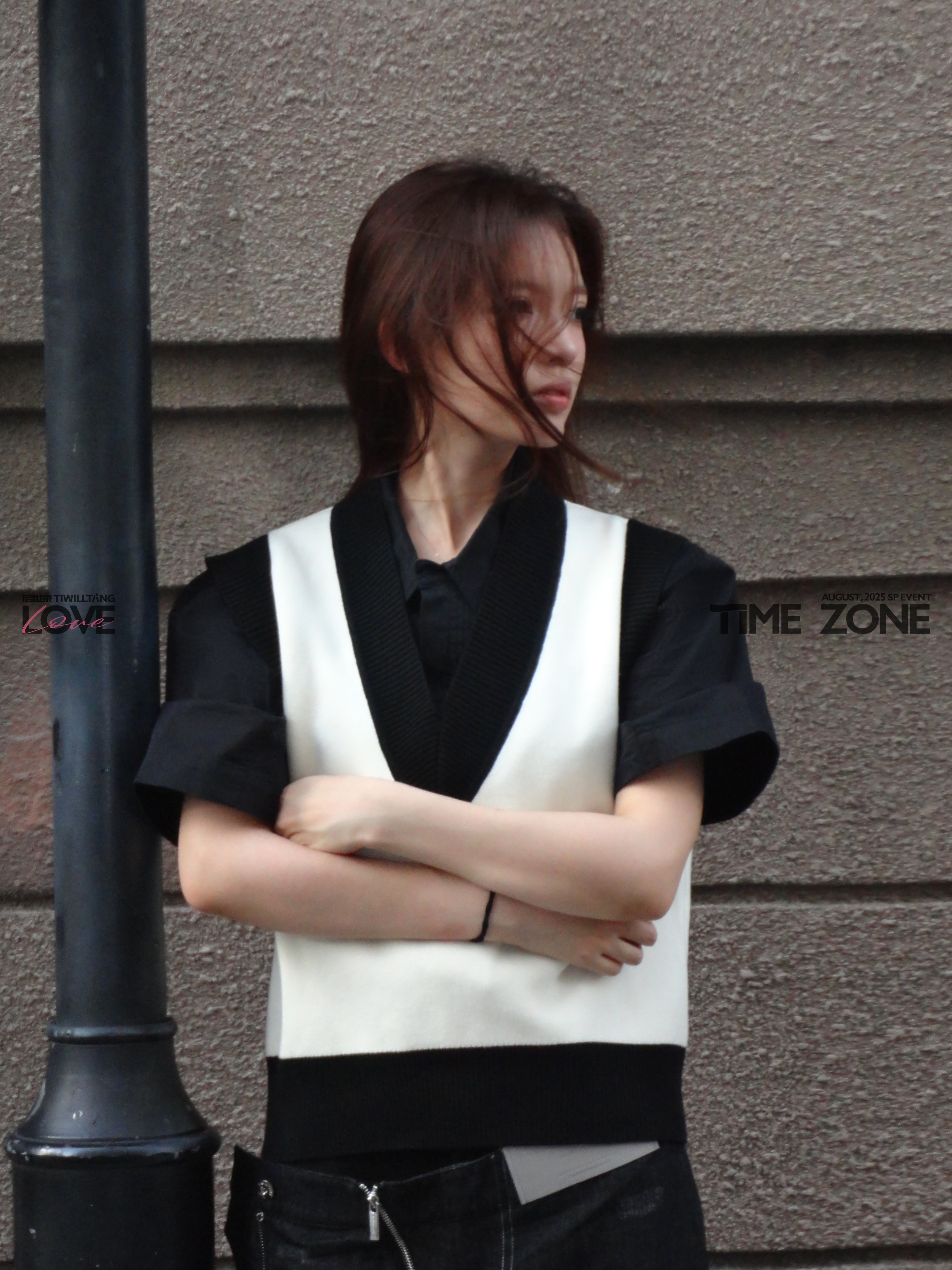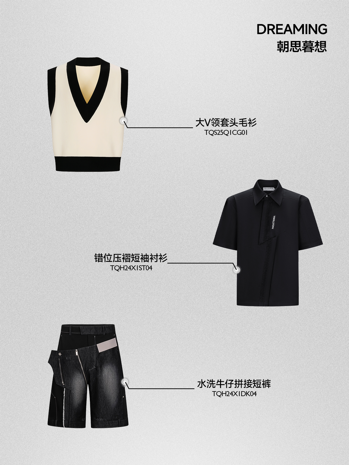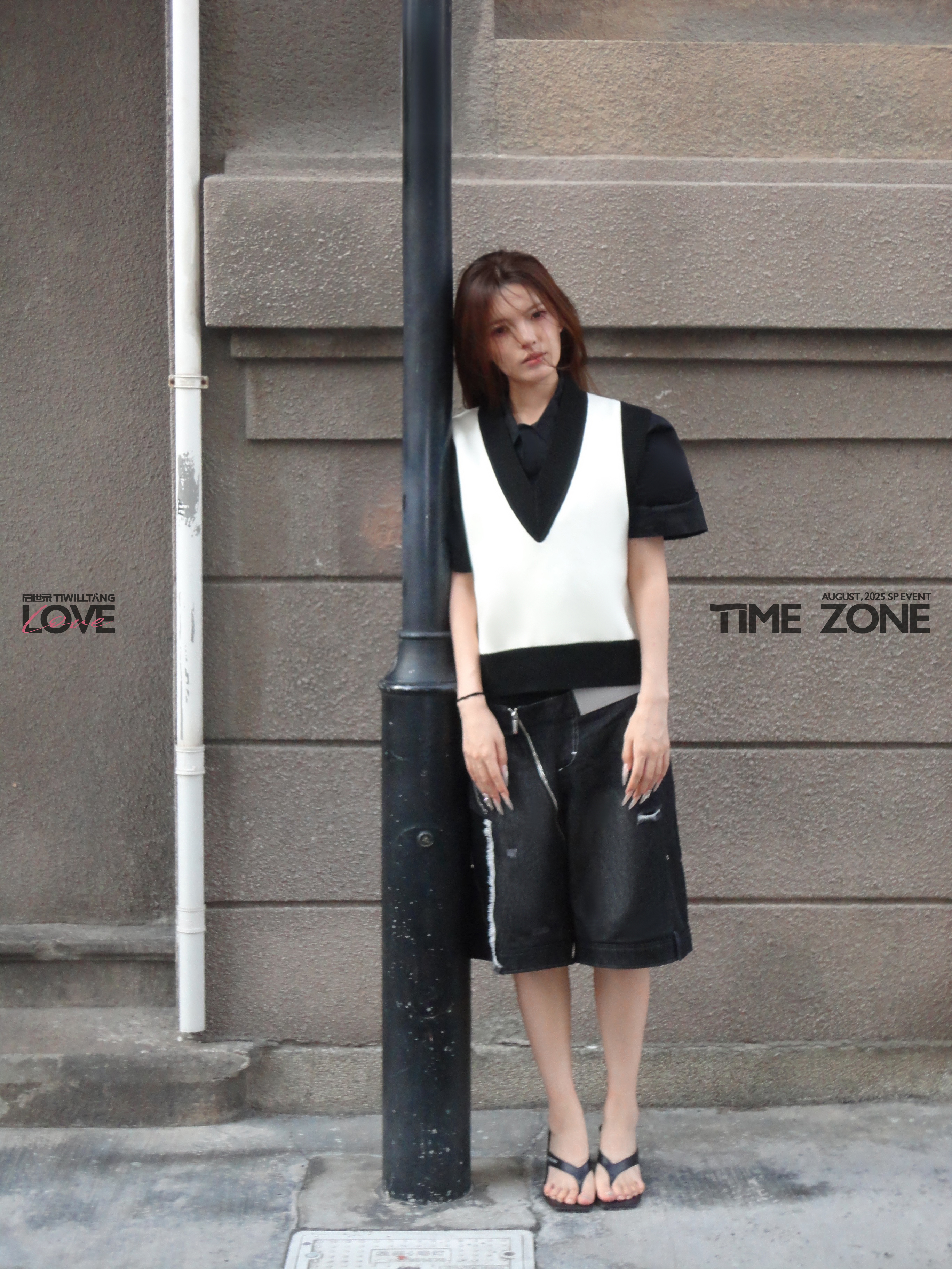 【七夕专属礼盒 | 朝思暮想】启世录:黑色错位压褶短袖衬衫+黑白V领套头毛衫+黑色水洗牛仔拼接短裤