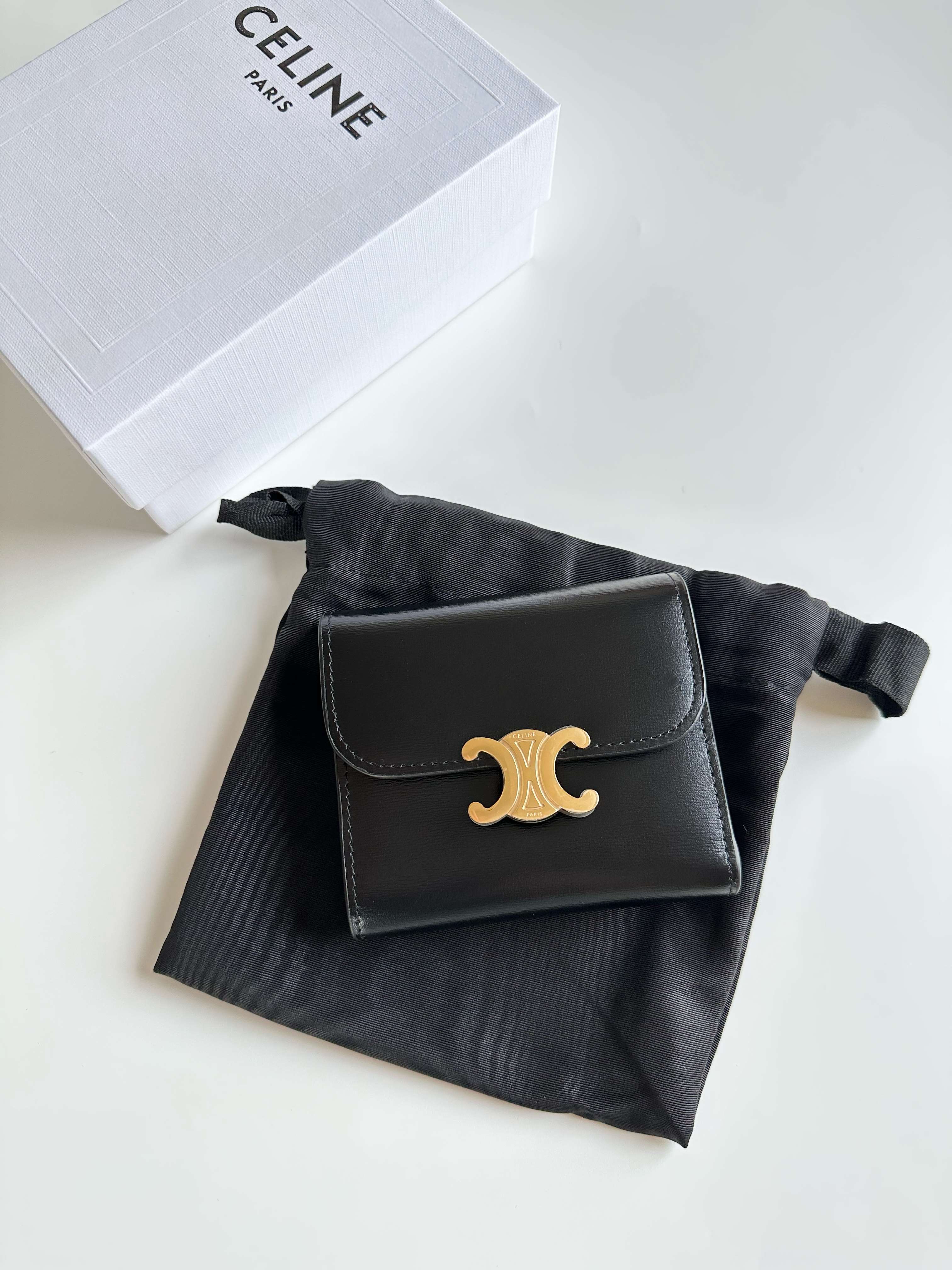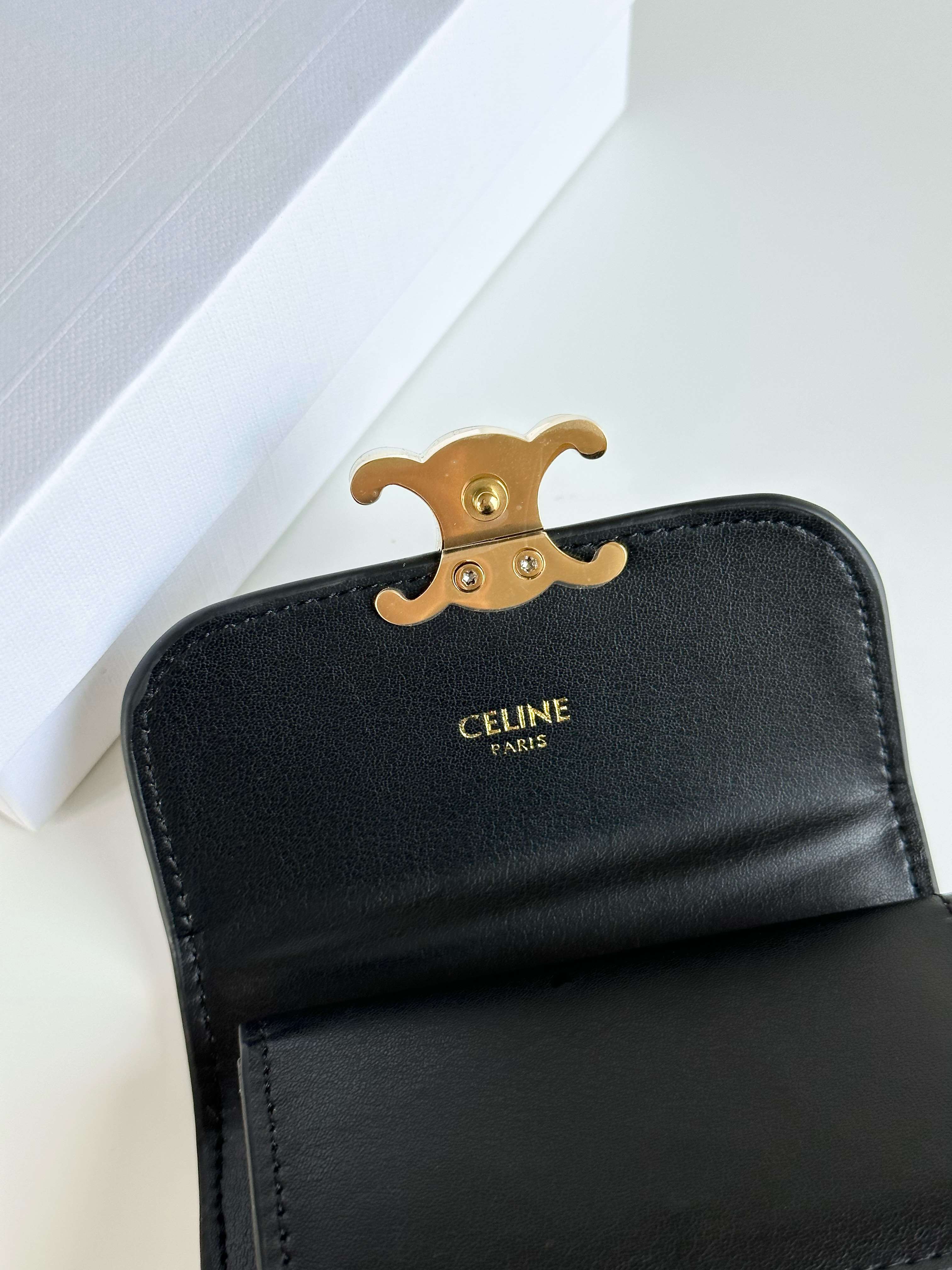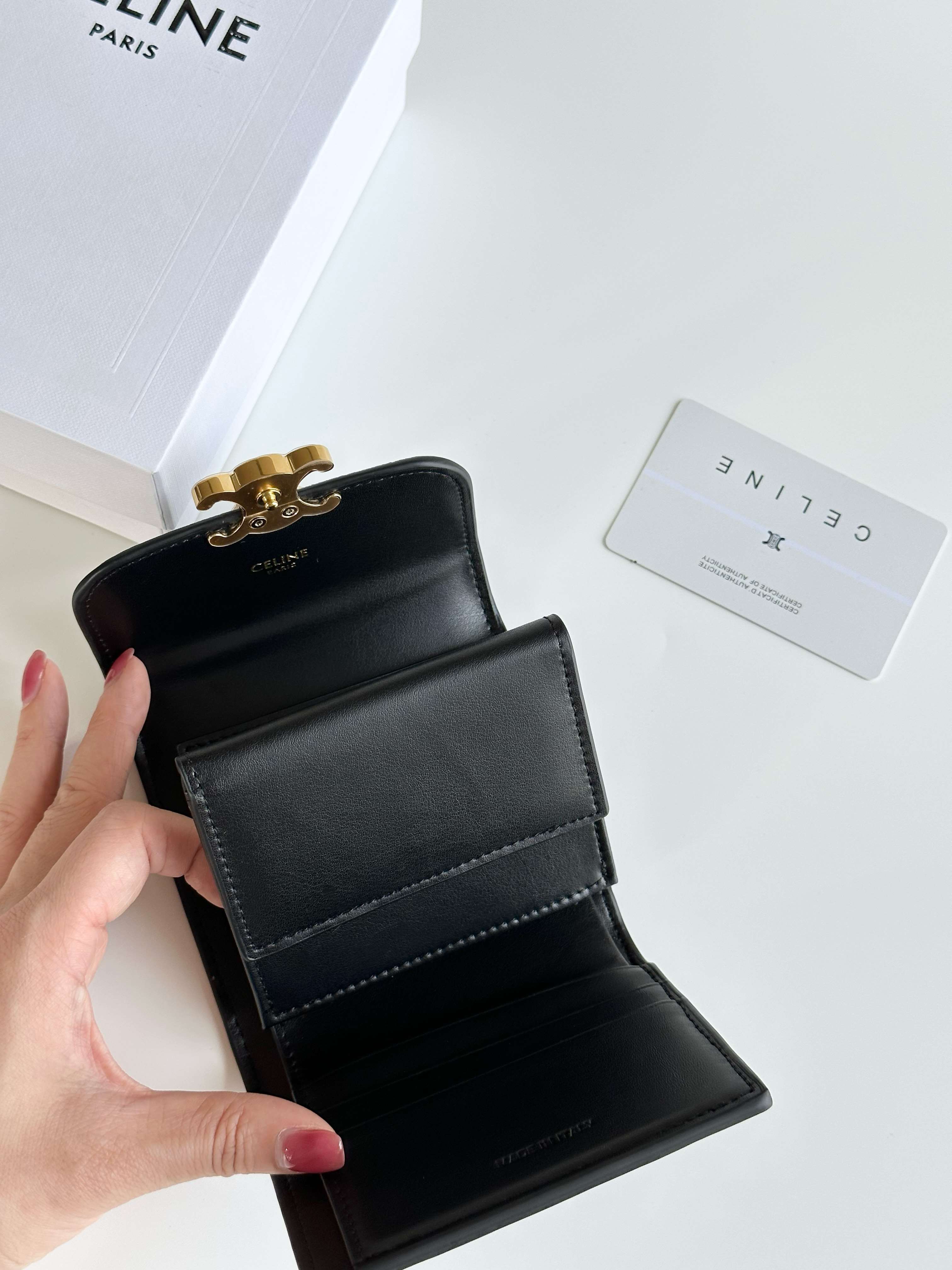 CELINE赛琳 Triomphe 凯旋门品牌徽标按扣闭合 小牛皮 钱包 小号 女款 黑色