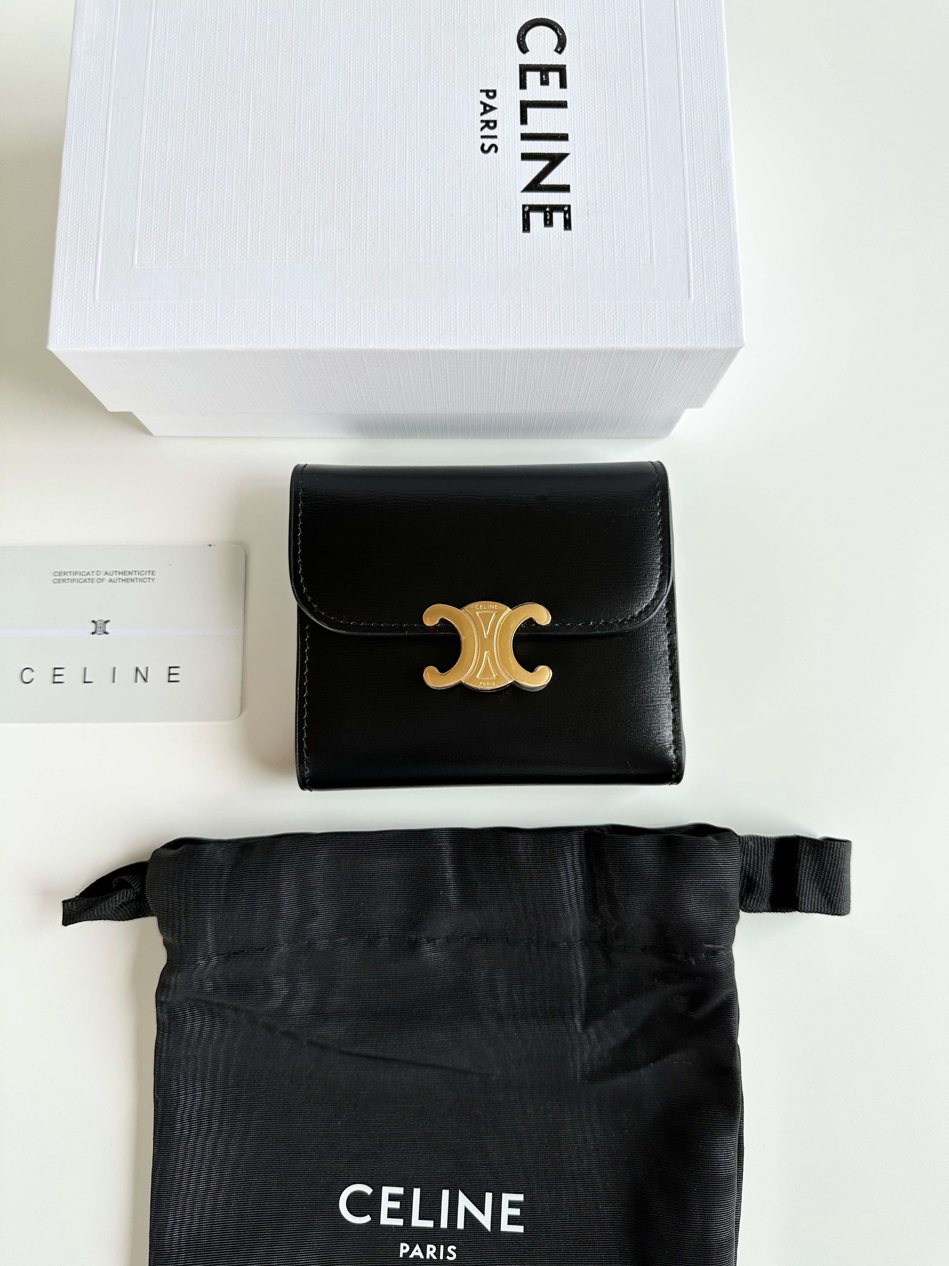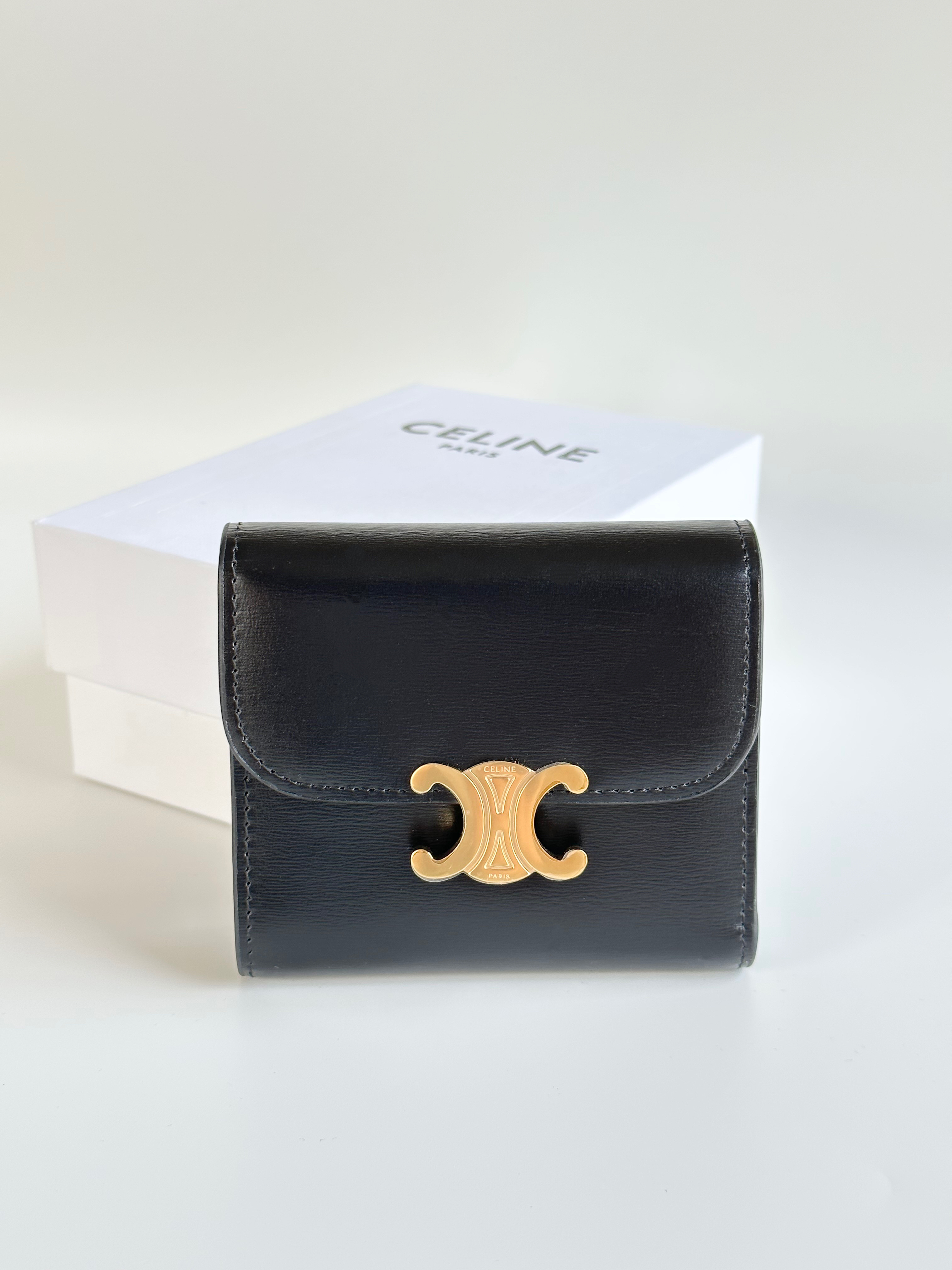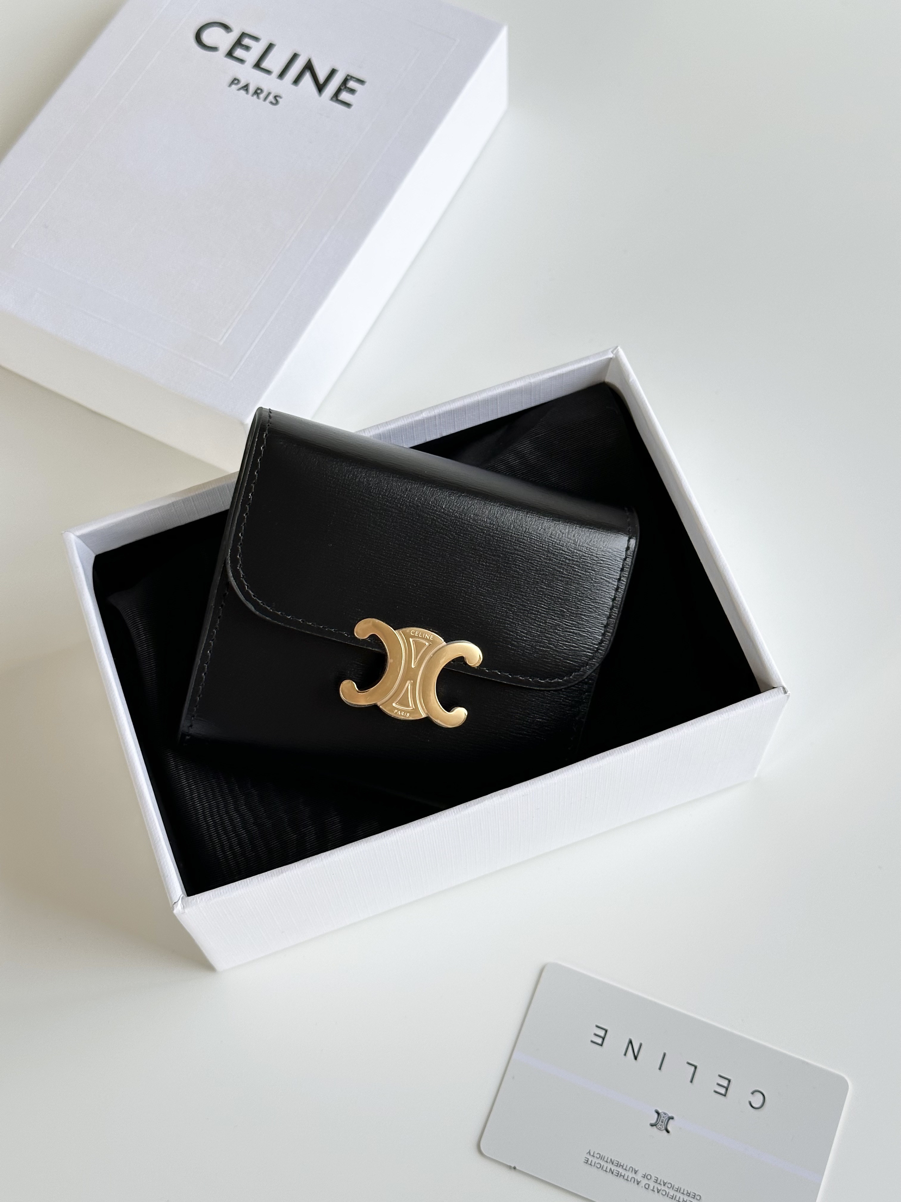 CELINE赛琳 Triomphe 凯旋门品牌徽标按扣闭合 小牛皮 钱包 小号 女款 黑色