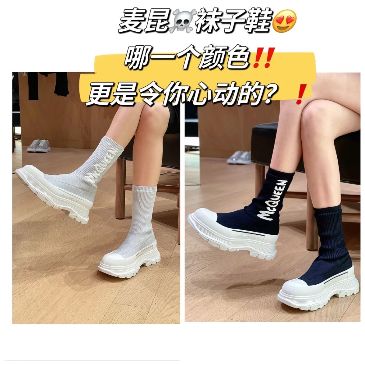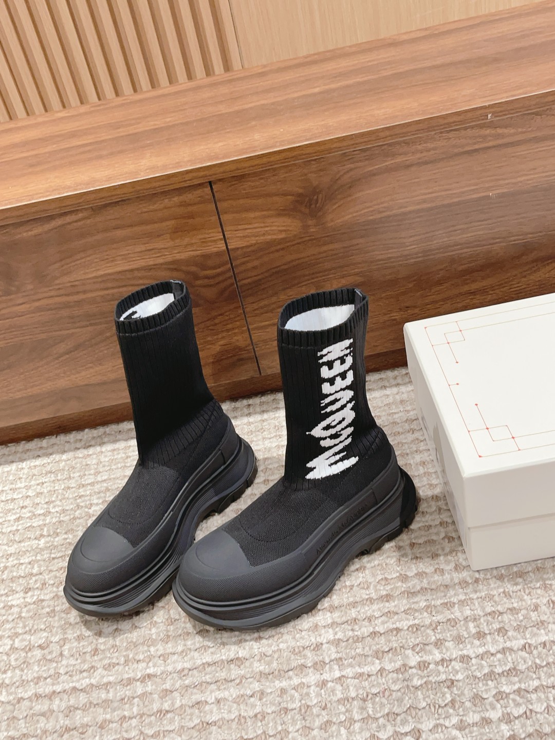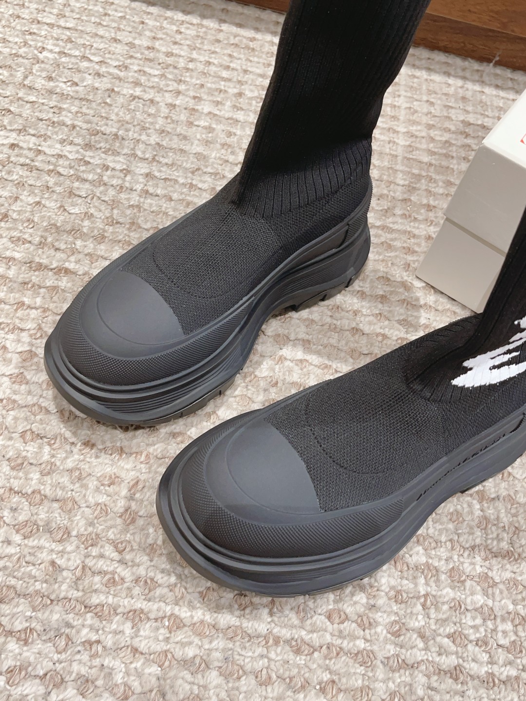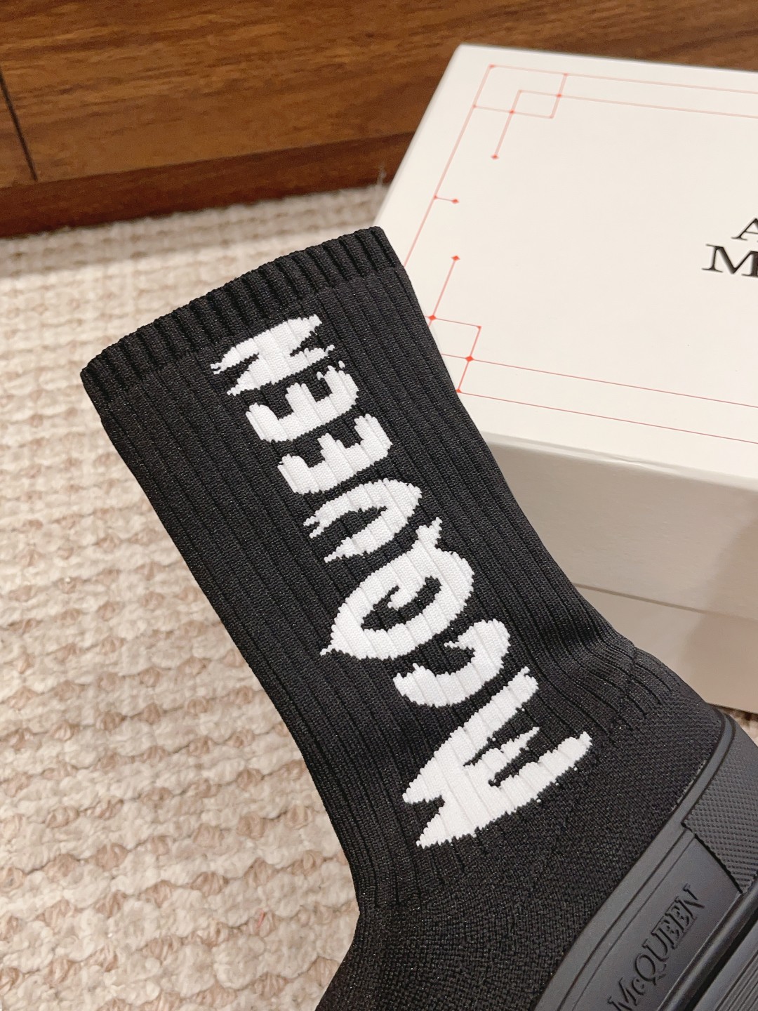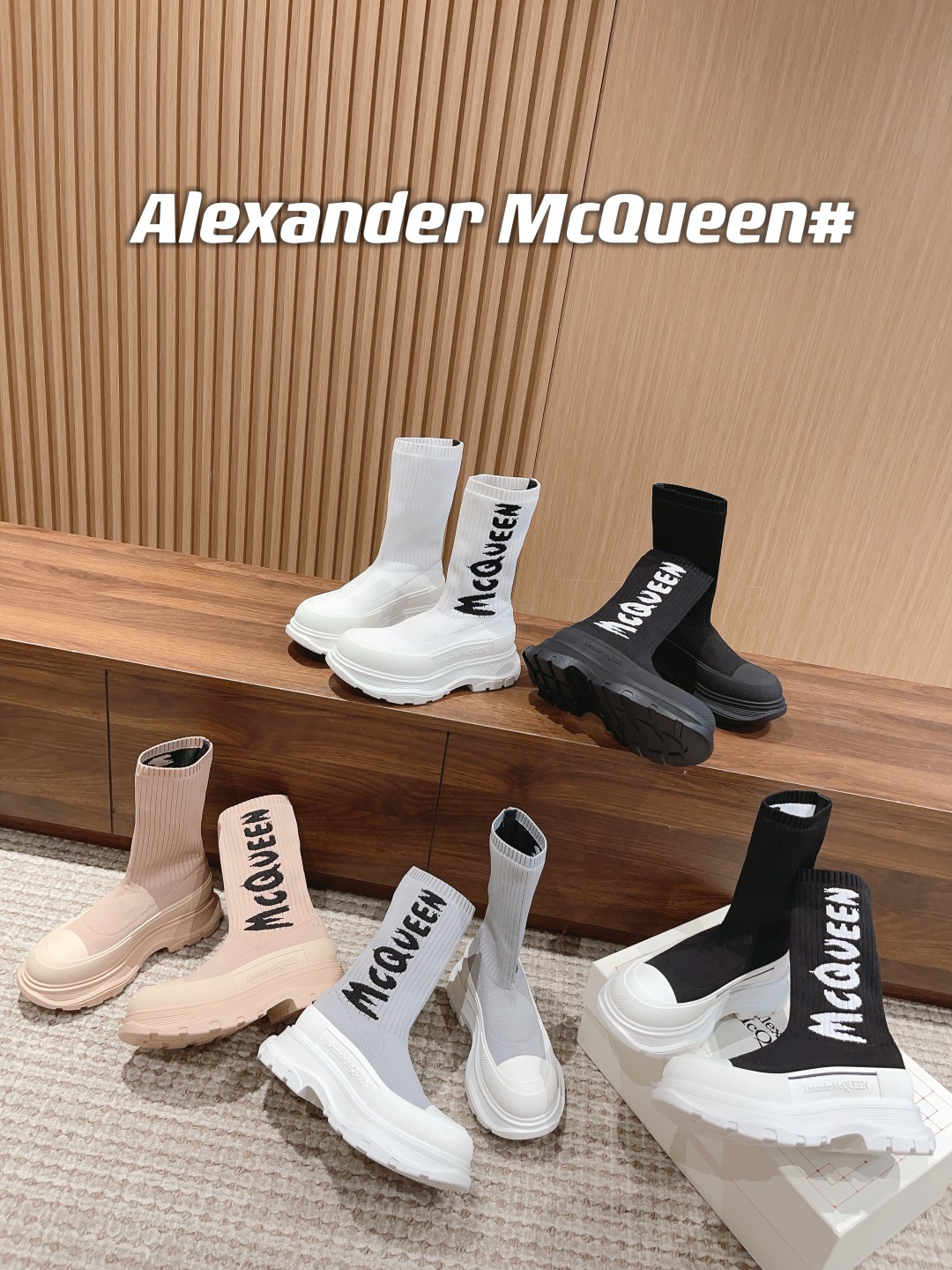 麦昆#涂鸦针织袜子靴 开简直不要太帅气了时尚人士必须不容错过 !有增高效果 增高5cm 小个子的福音 穿上它 瞬间空气清新了许多!McQueen Graffiti针织Tread Slick靴 最新款飞织袜筒靴 早秋麦昆最新款飞织袜筒靴。鞋子独特的个性设计,增高瘦腿,瘦腿神款,上脚超有风范#麦昆织袜筒靴 麦昆新款袜子靴喜欢时尚潮流喜欢酷酷的搭配 可以看过来 必备神器哟增高酷气十足必须拥有的靴子,罗纹针织袜式靴面,缀以白色McQueen涂鸦标志,配TPU+橡胶胎纹厚底。靴子饰有纹理橡胶绑带和同色系Alexander McQueen标志。圆头靴廓形,TPU橡胶鞋头细节