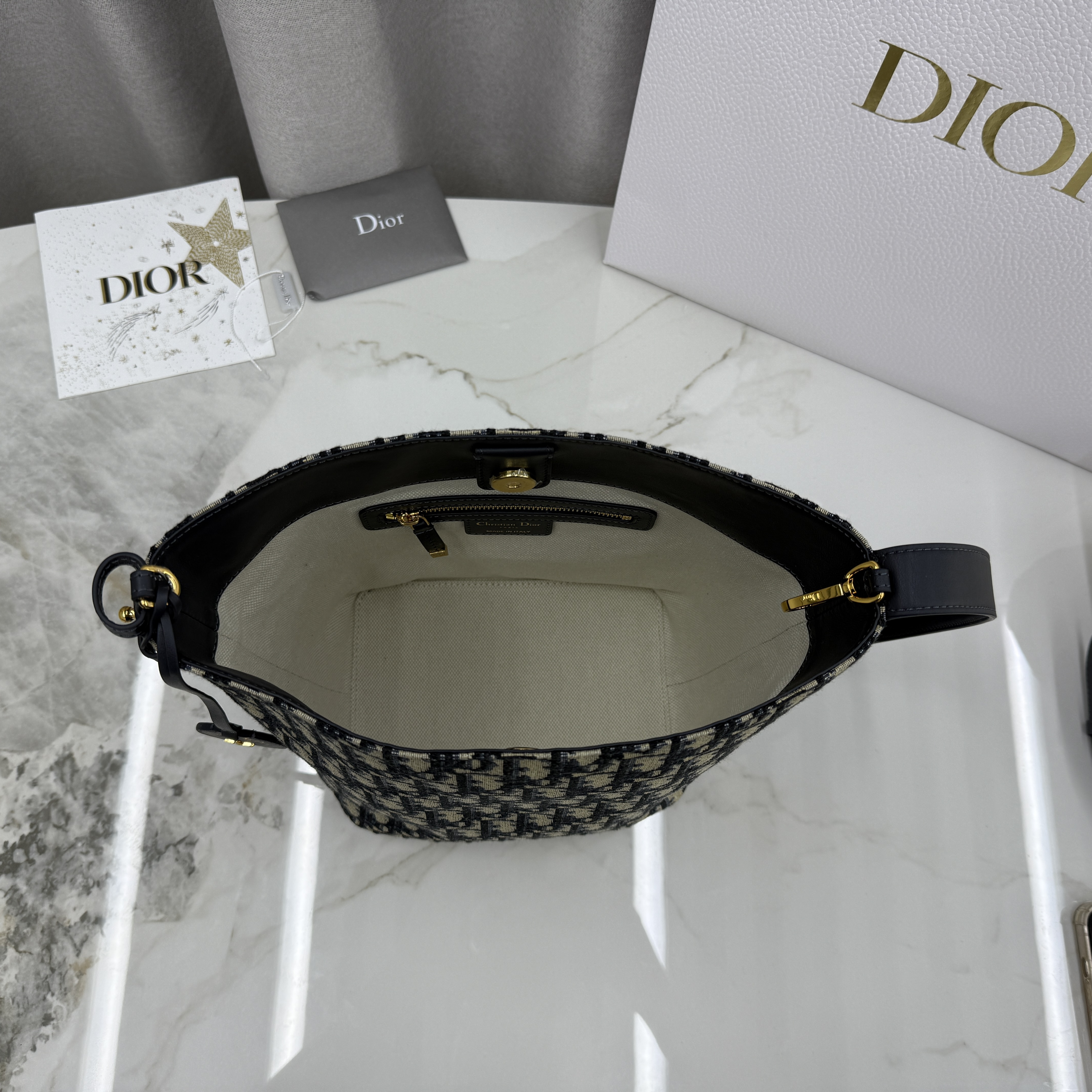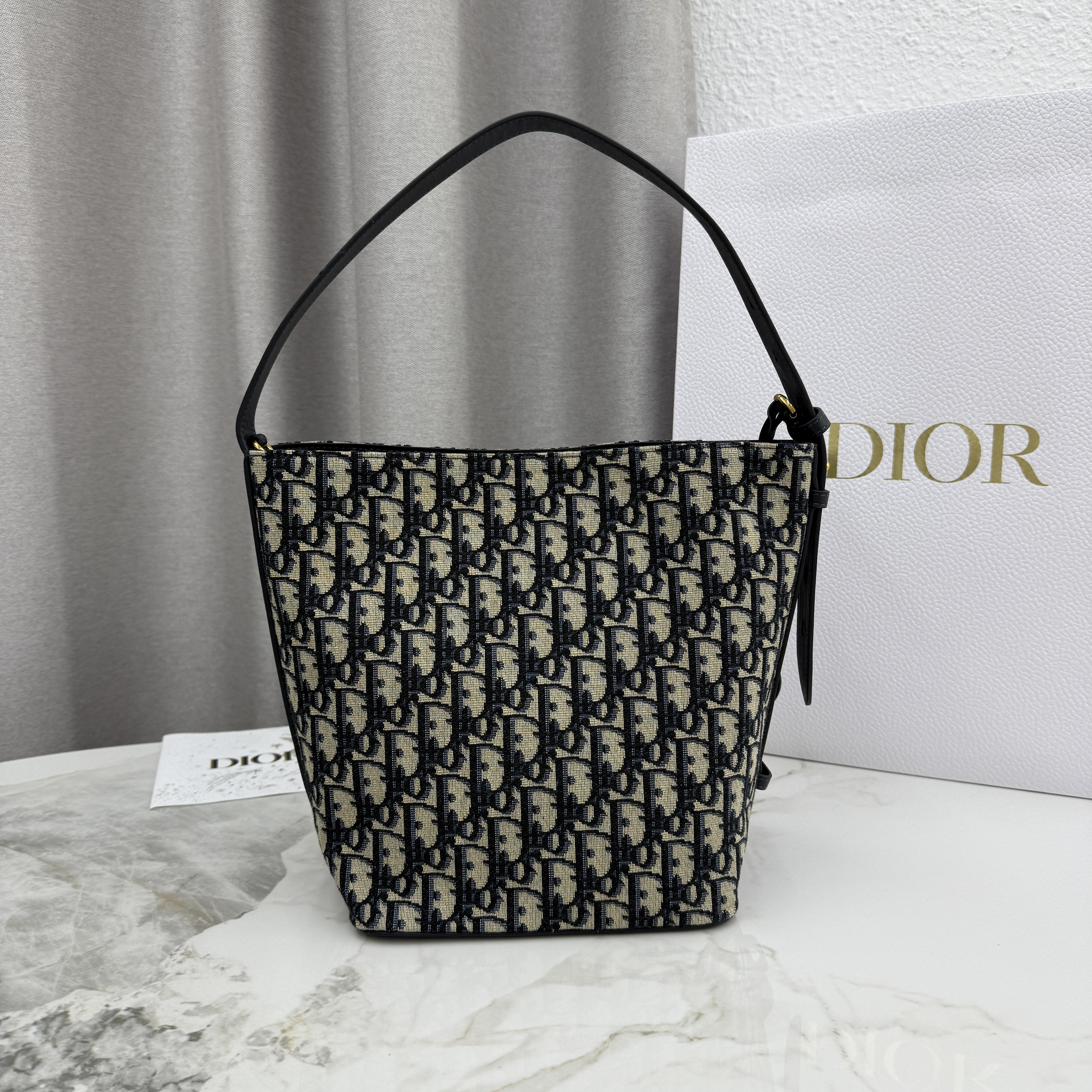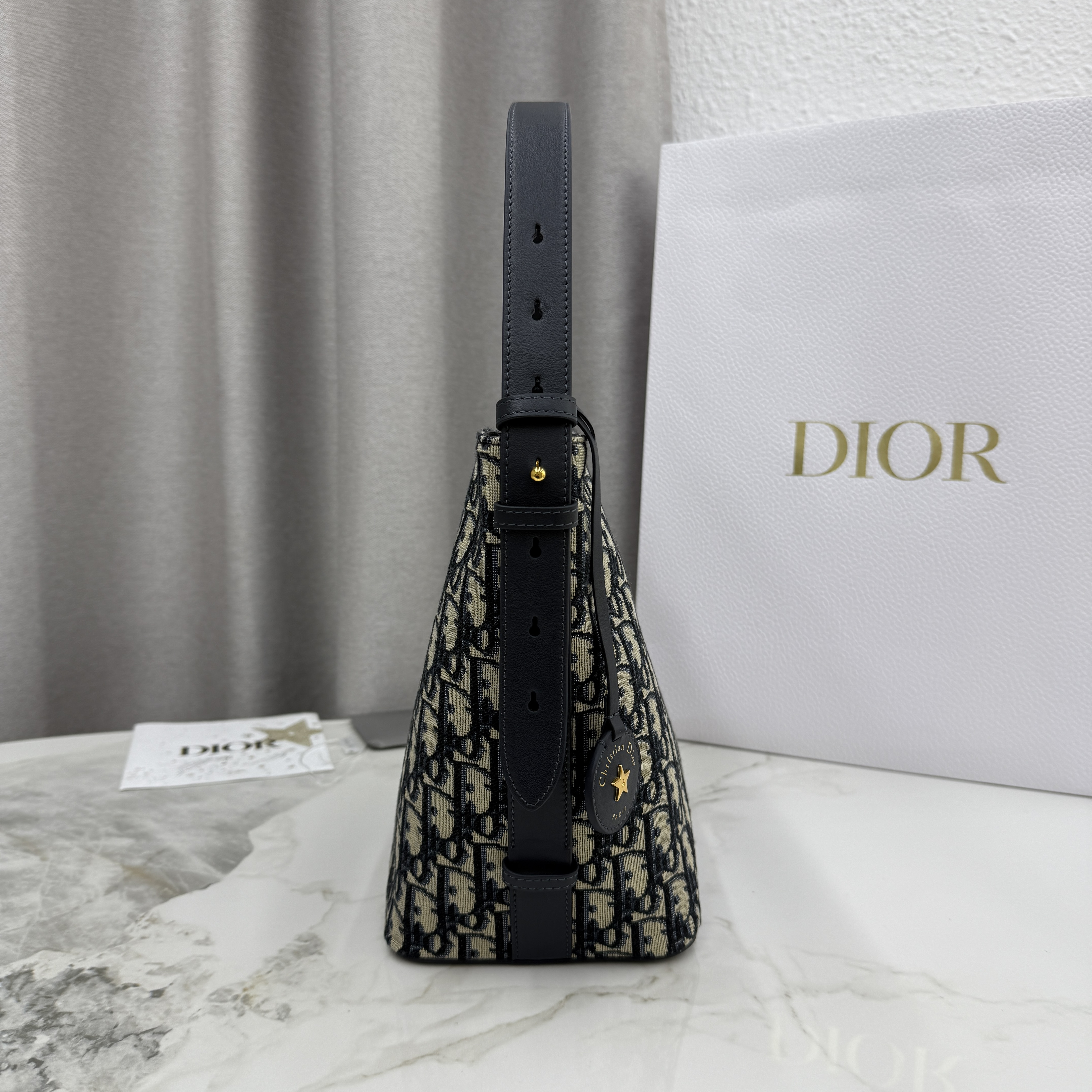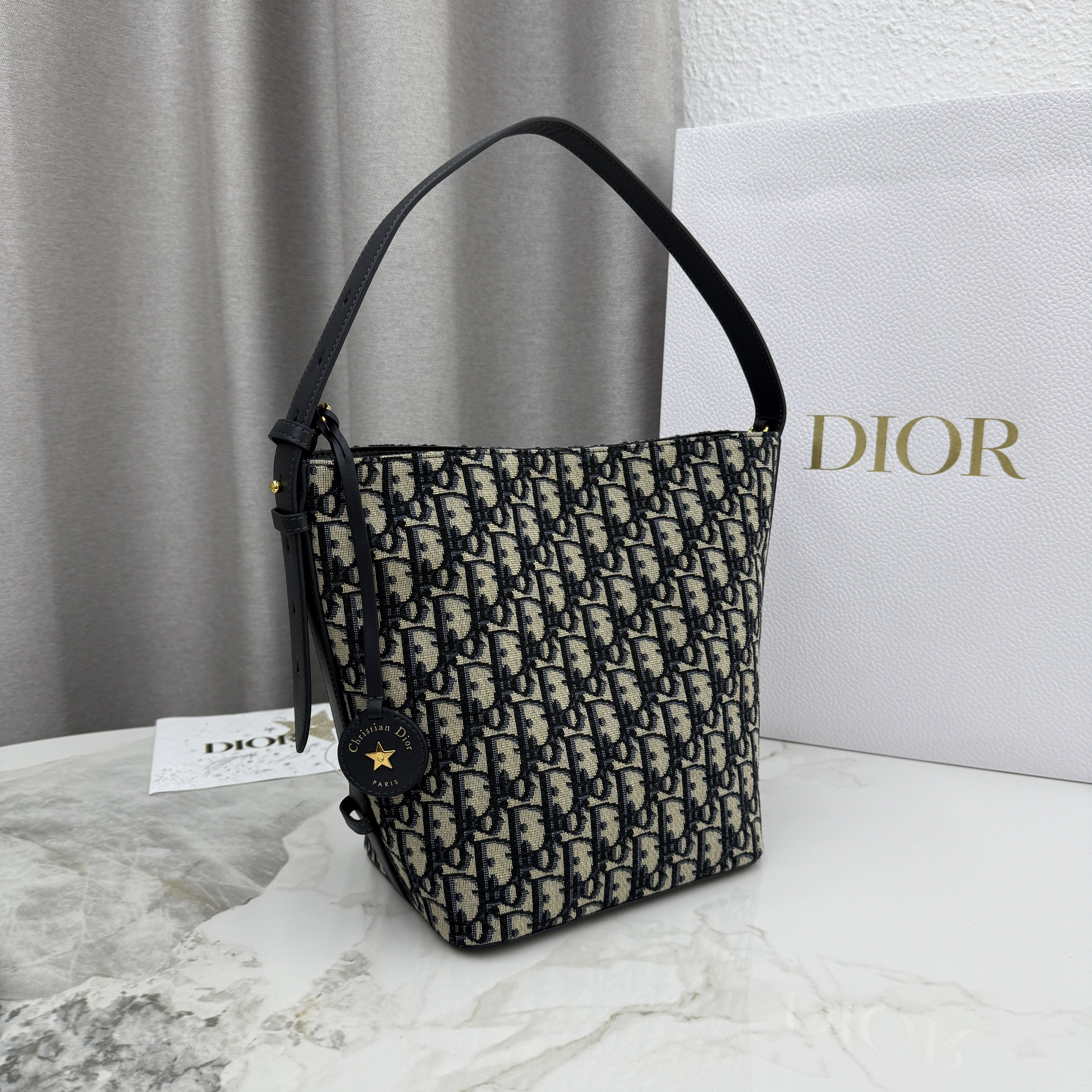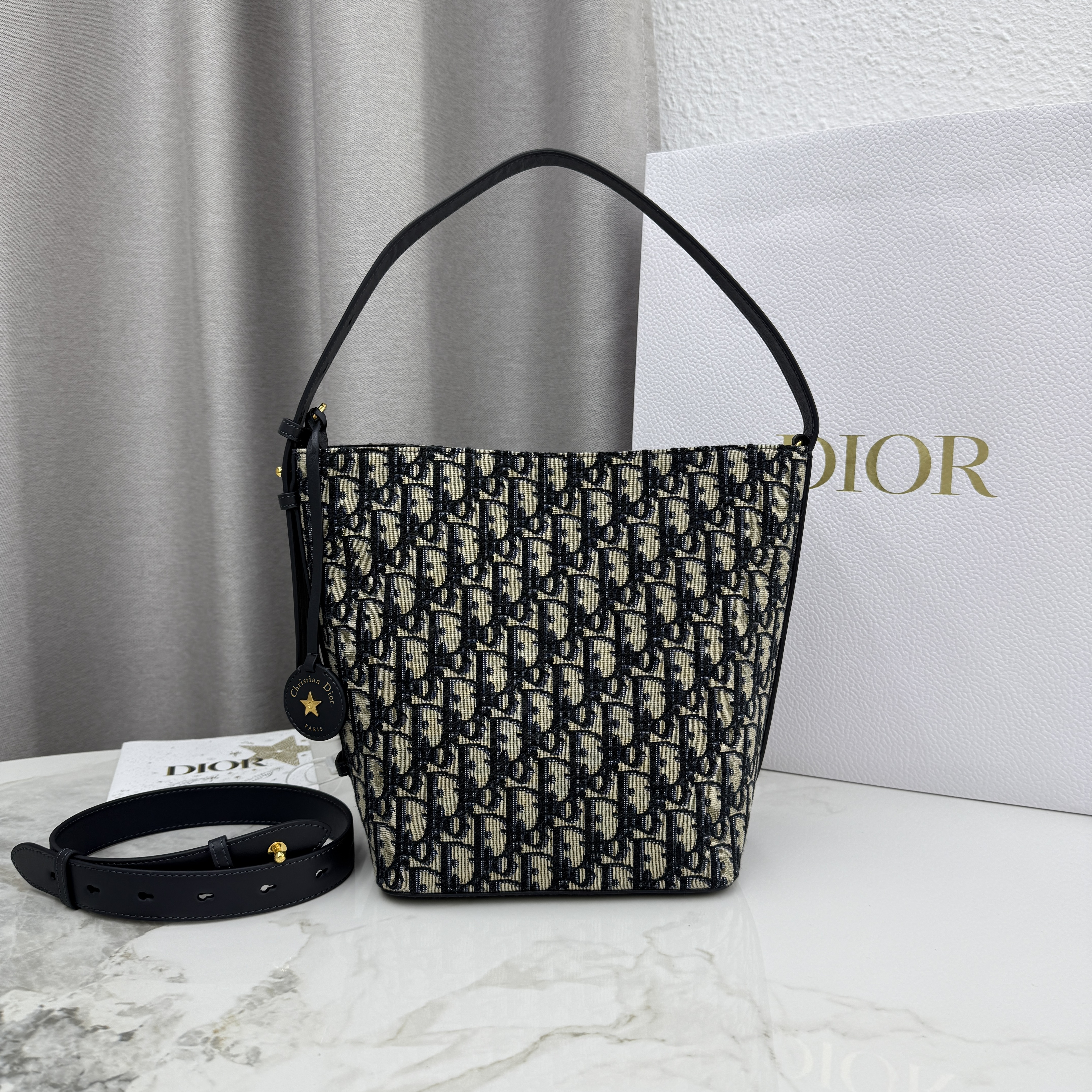 这款 Diorstar 小号水桶包是二零二六早春成衣系列新品,精巧实用的设计彰显百搭的审美风格。采用蓝色 Oblique 印花面料等材质精心制作,点缀以同色调光滑牛皮革细节,质地柔软,双开合可调节廓形。设有宽敞的隔层,可轻松收纳各种日常用品,饰以皮革标签,点缀以 Christian Dior Paris 标志和 Dior 的幸运星。搭配可调节皮革肩带,可手提、肩背或斜挎,缔造舒适体验。