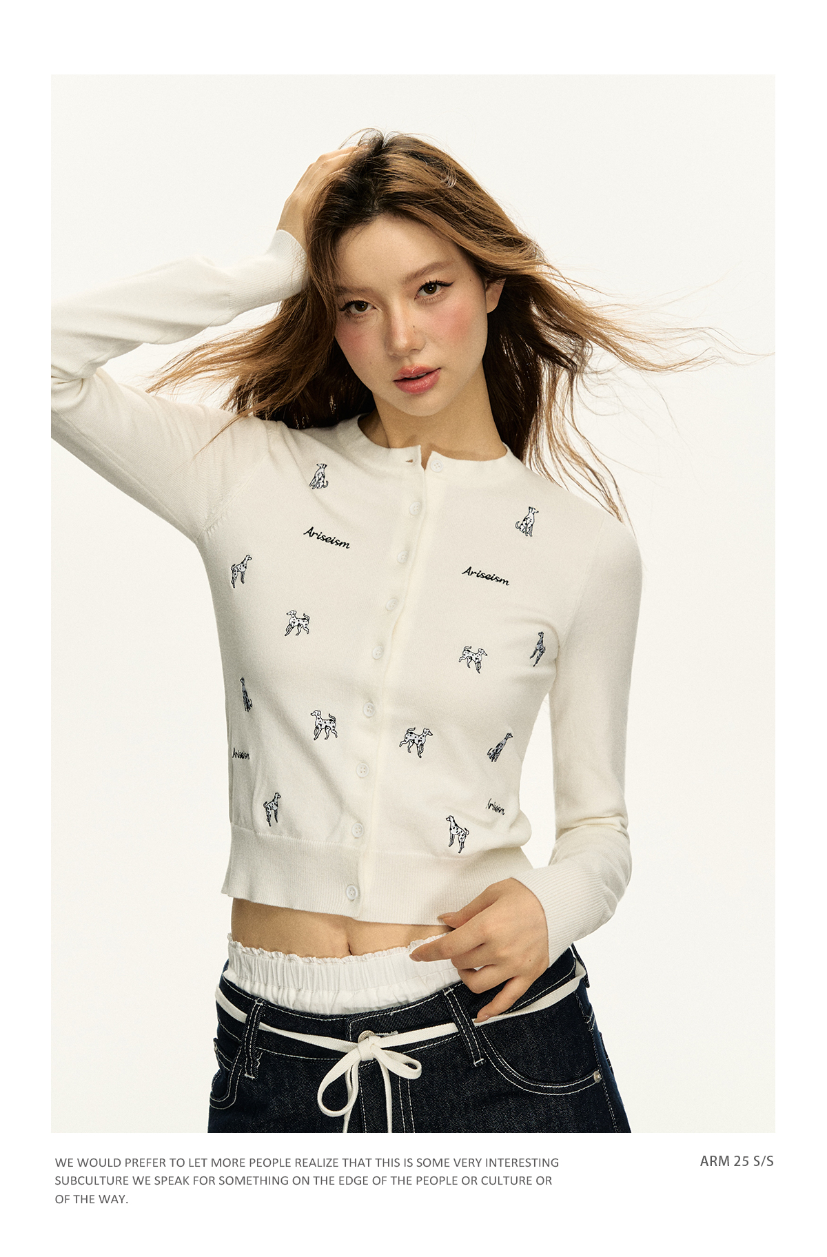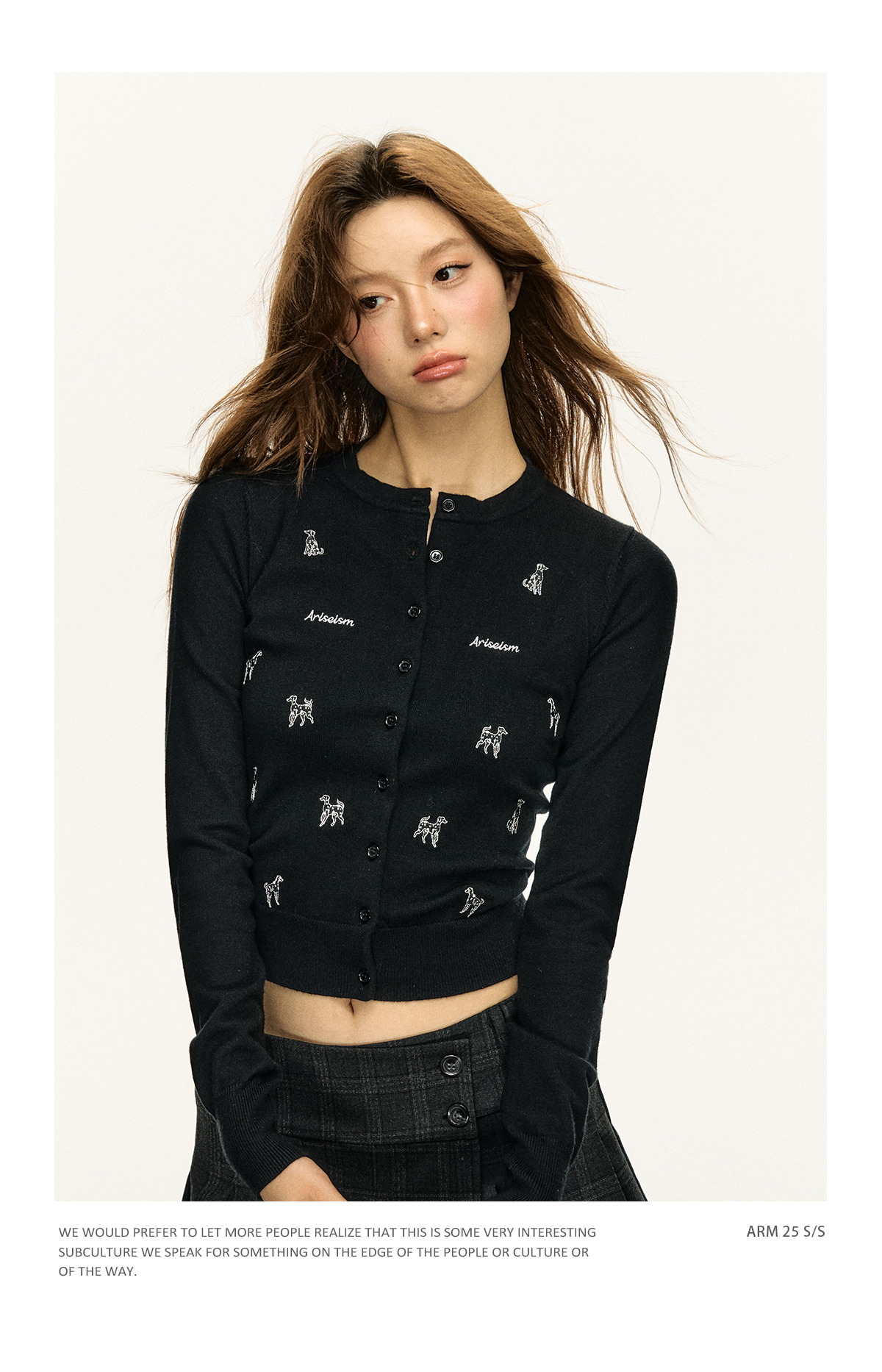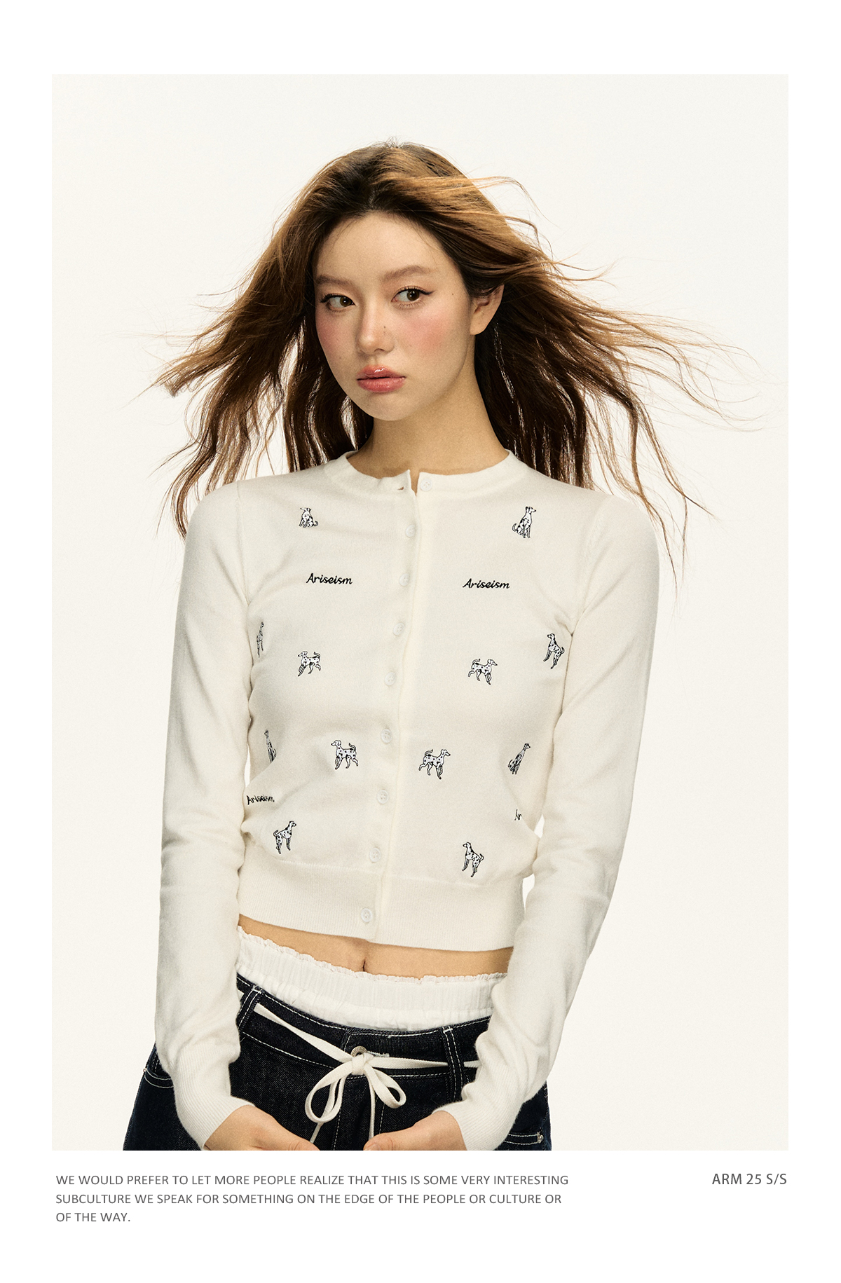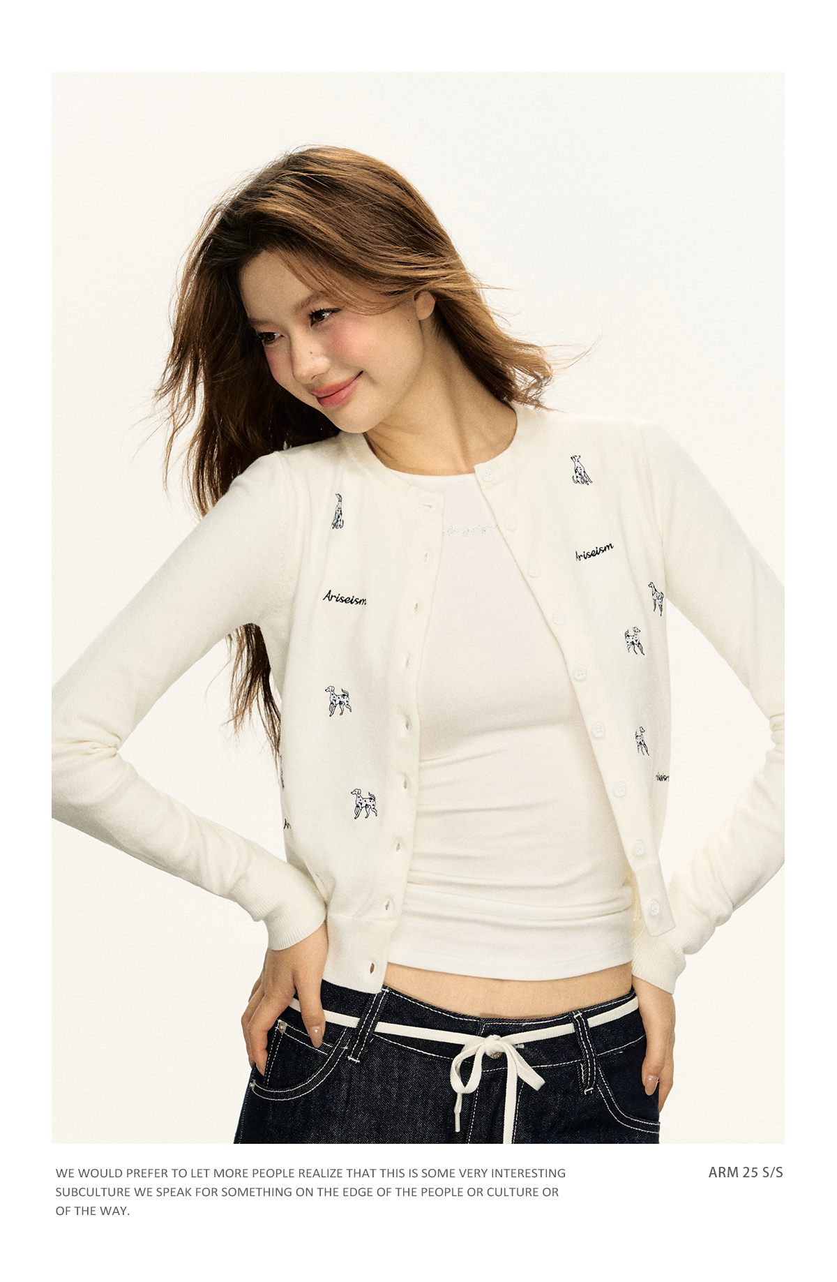 Ariseism刺绣小狗短款毛衣针织开衫女春季新款修身内搭上衣打底衫