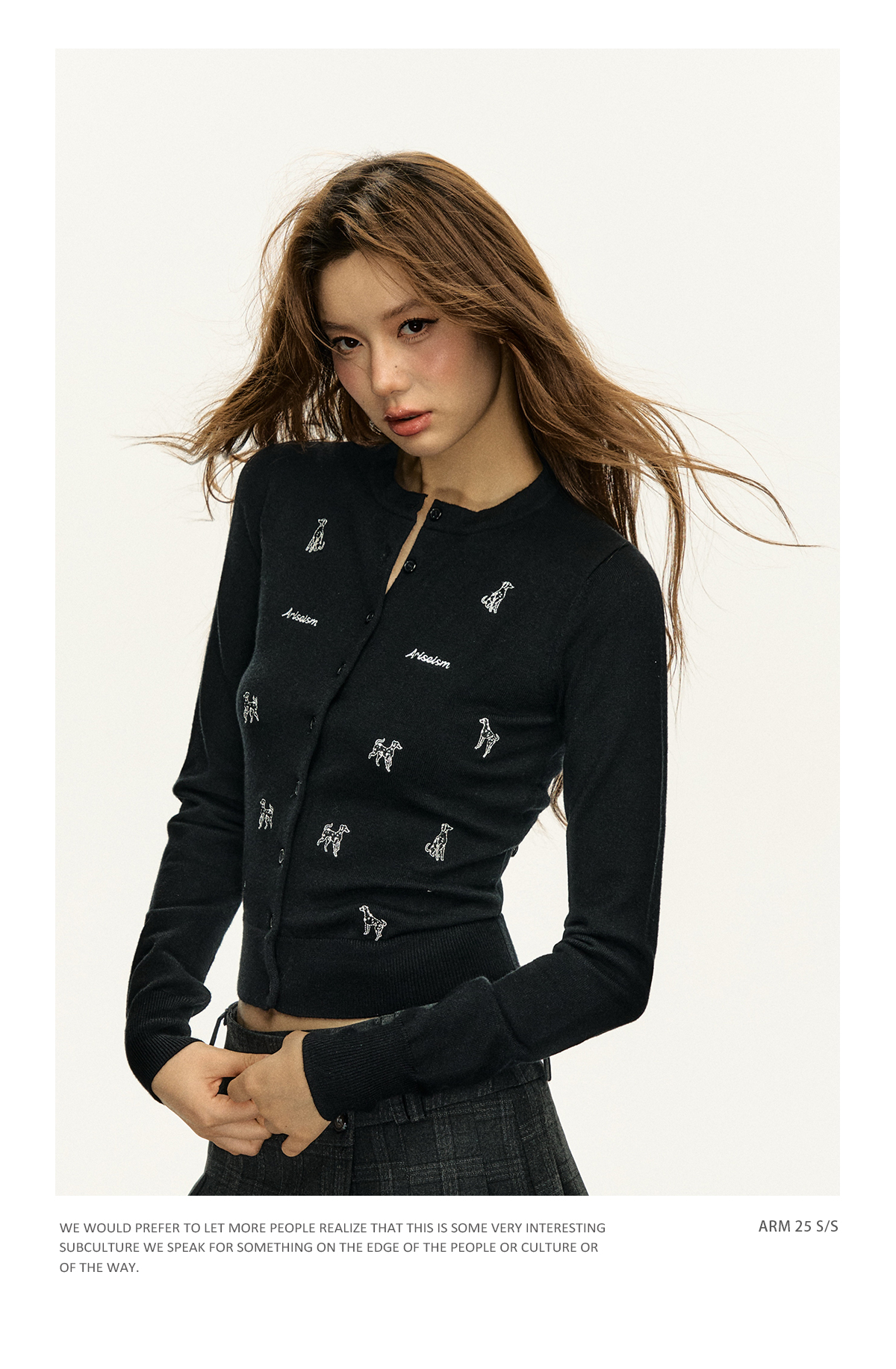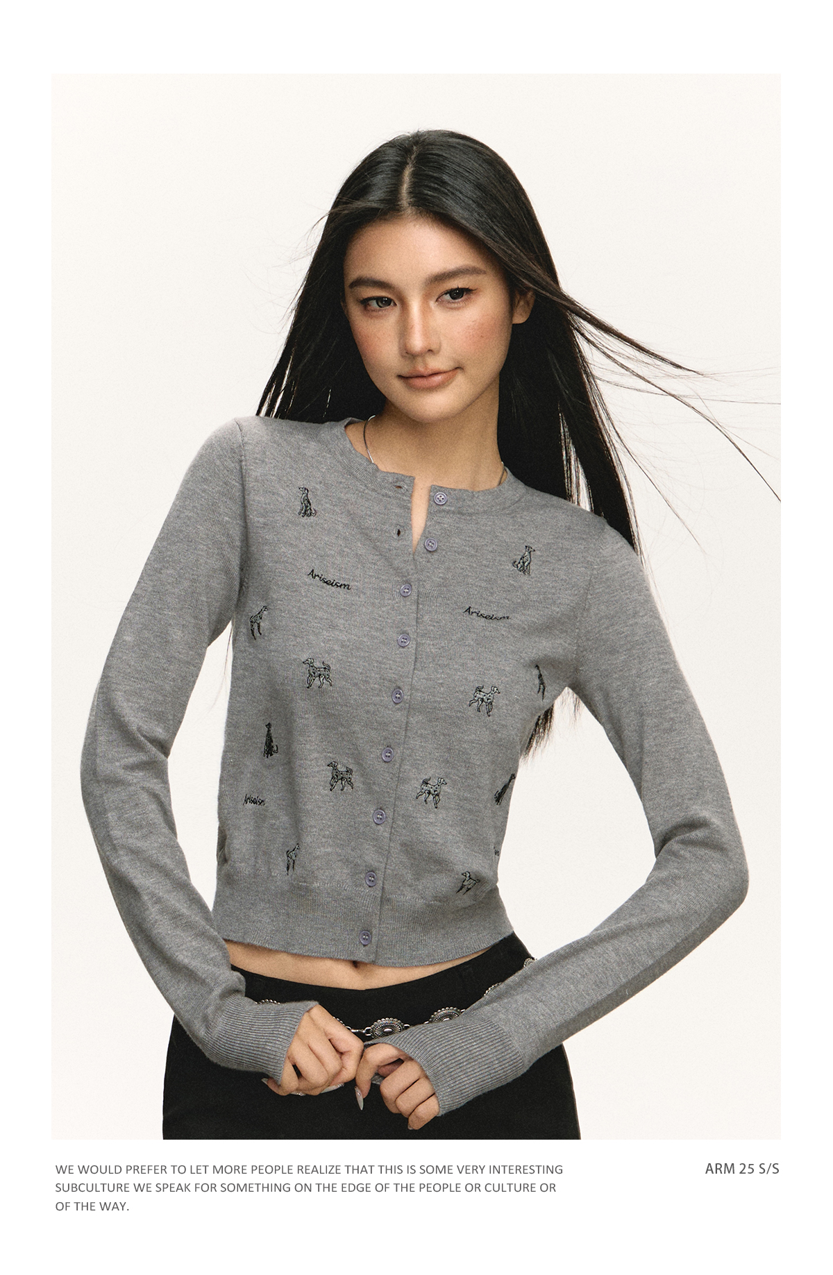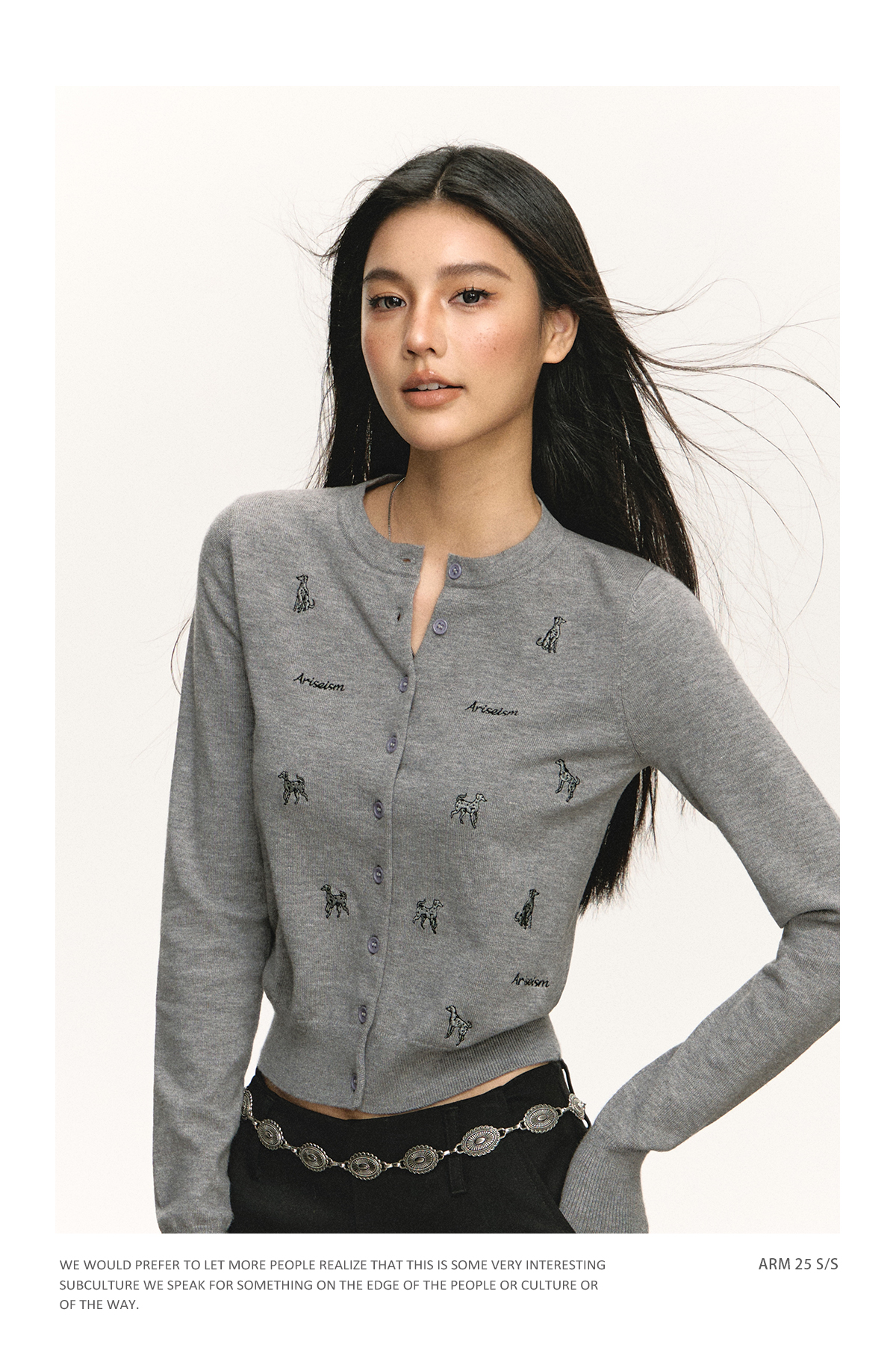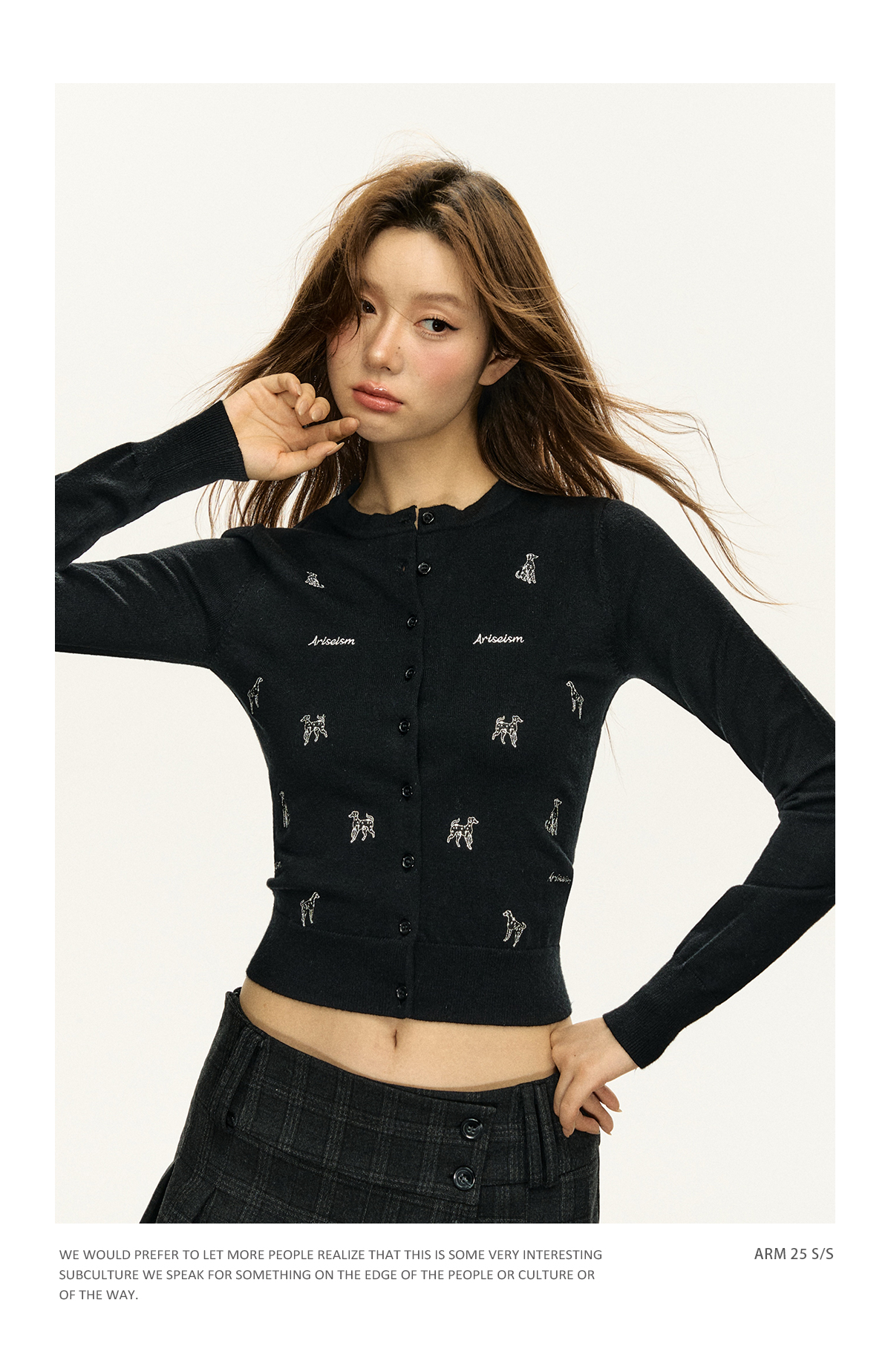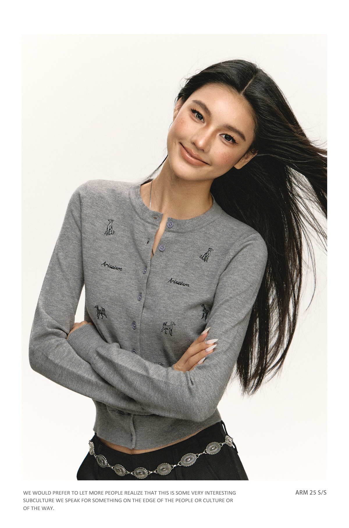 Ariseism刺绣小狗短款毛衣针织开衫女春季新款修身内搭上衣打底衫