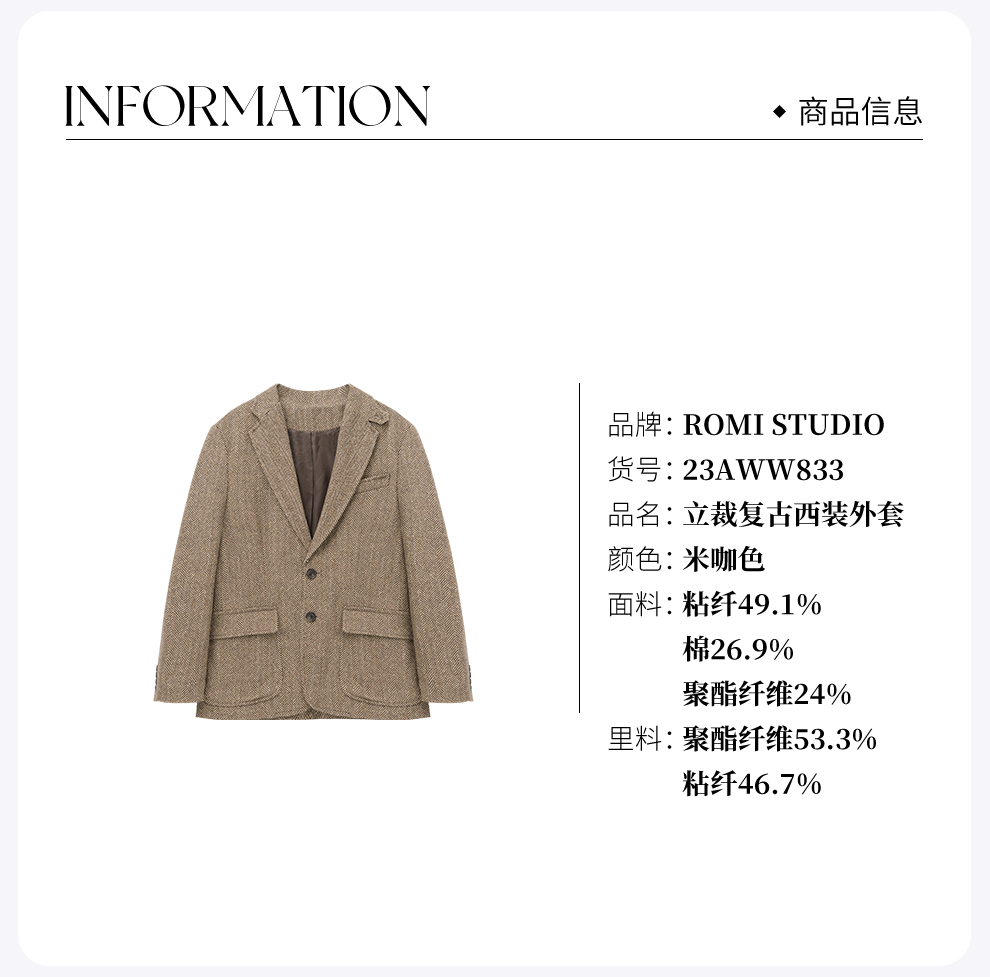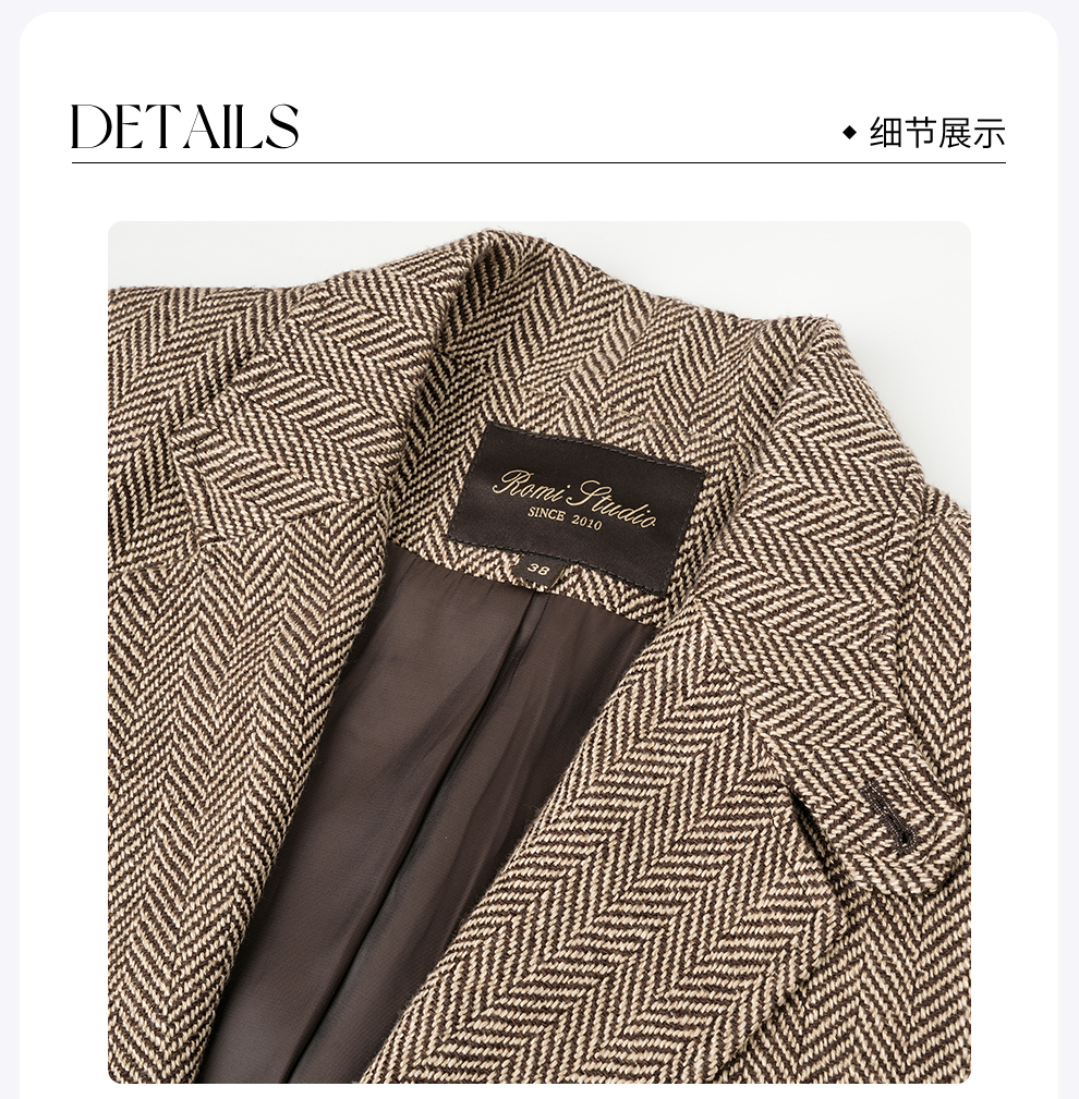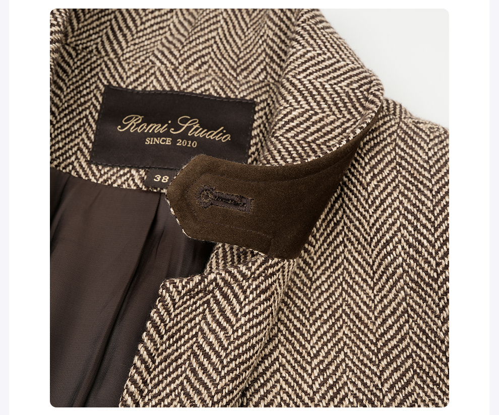 ROMI STUDIO“old money”羊皮拼接人字纹立裁复古西装外套23AWW833