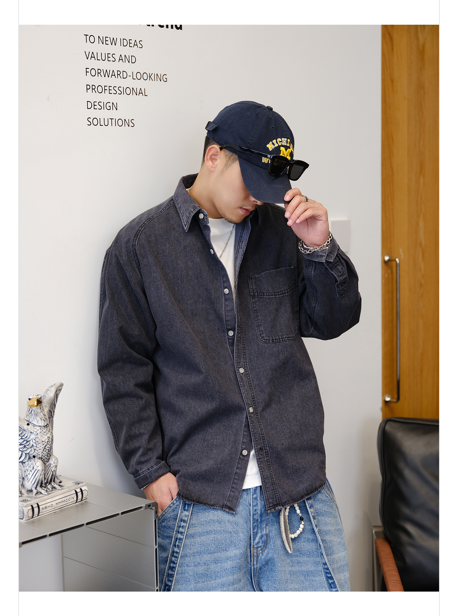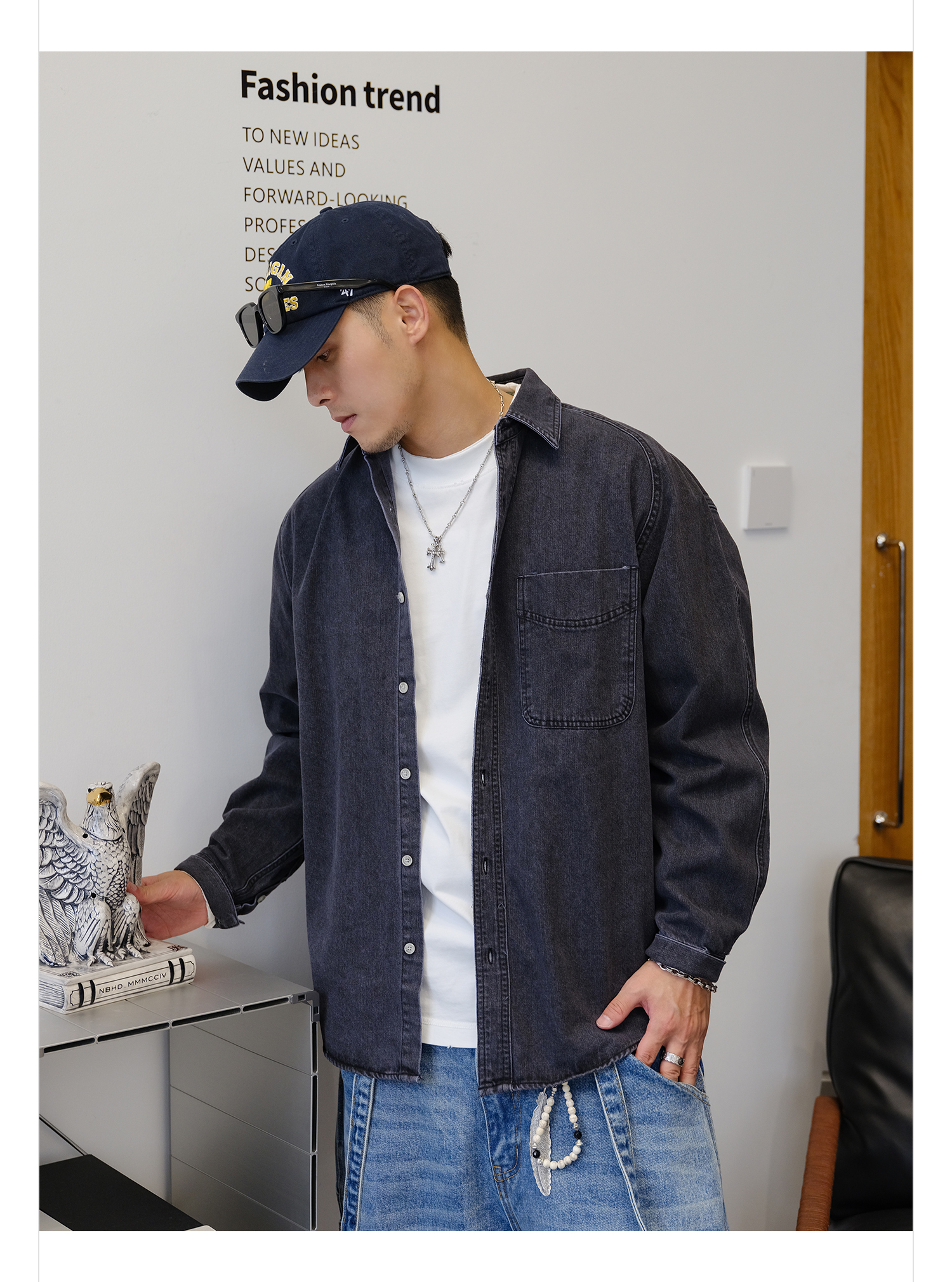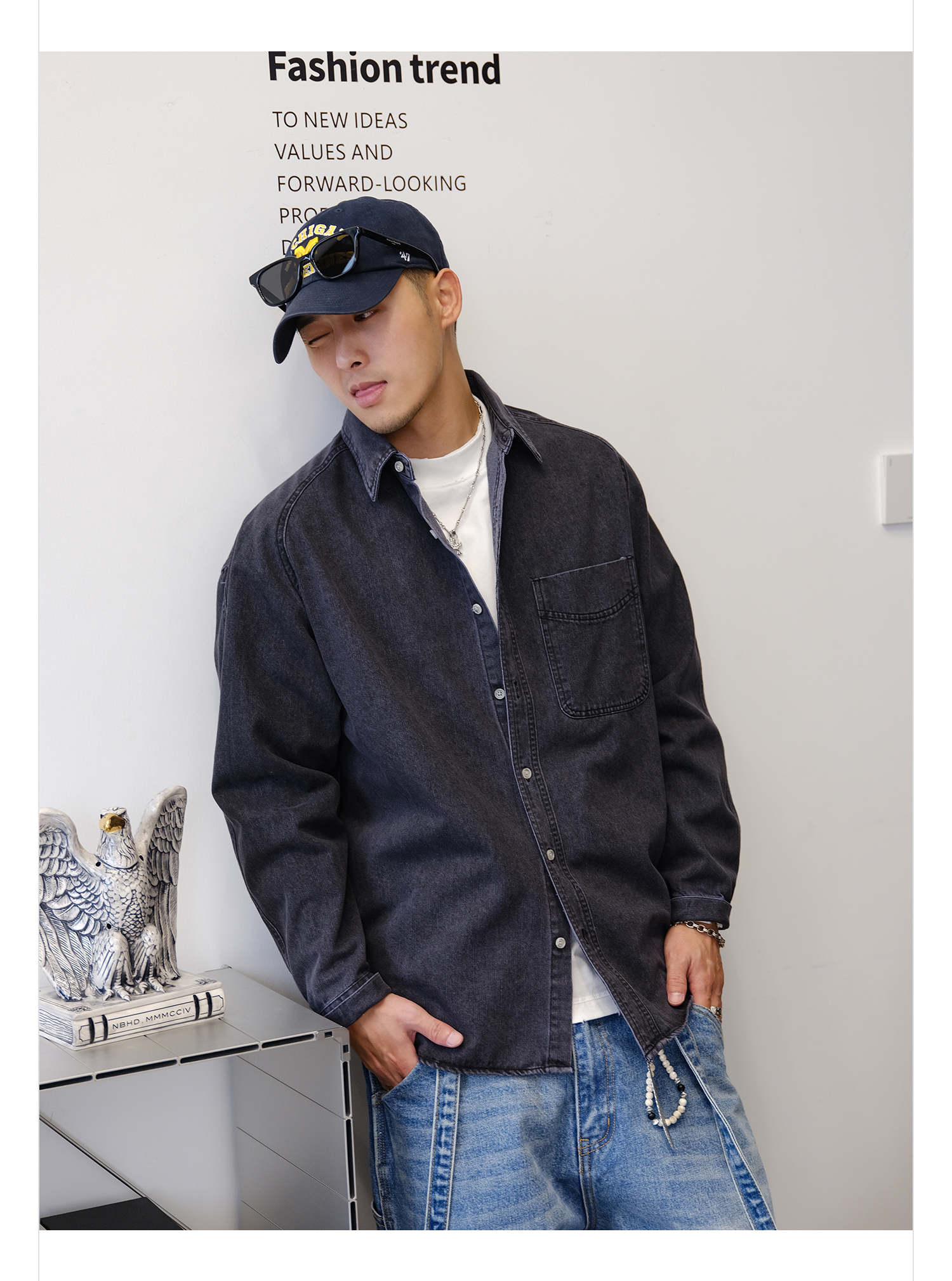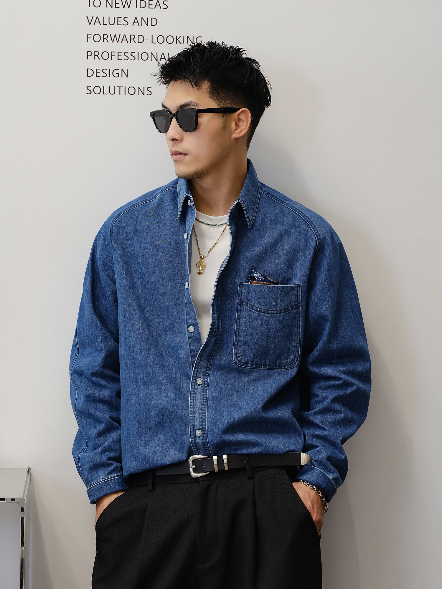 徐太浪280g蓝色牛仔长袖衬衫男2025新款秋季潮牌男装大码衬衣外套