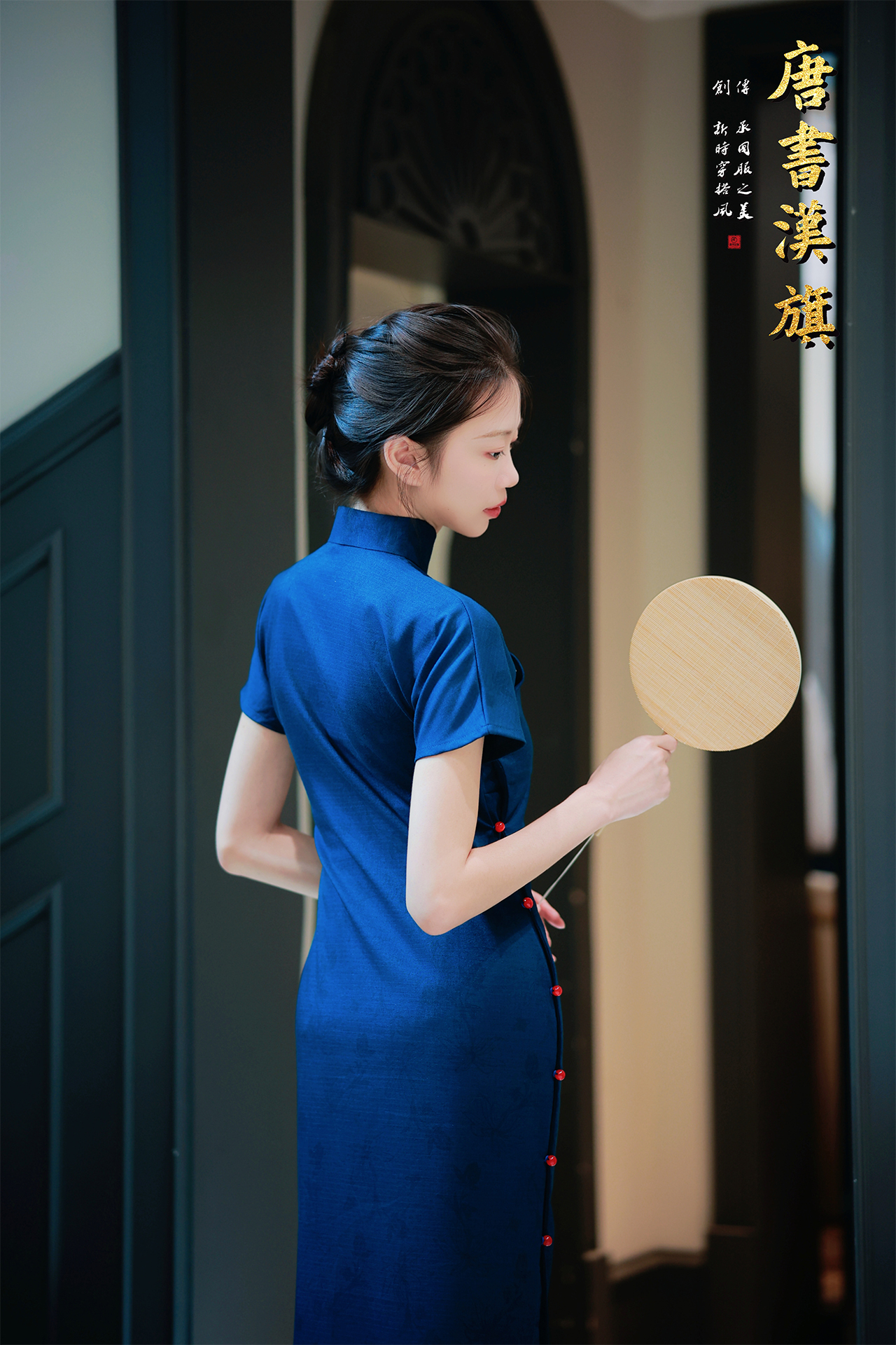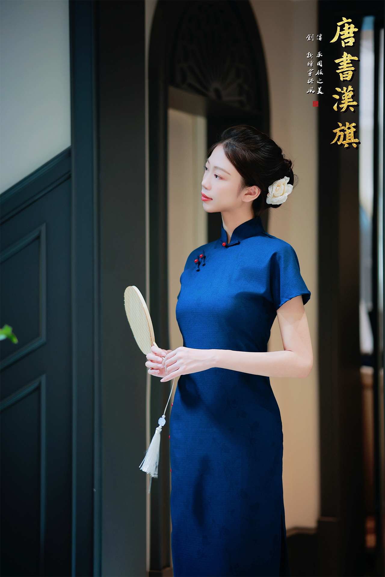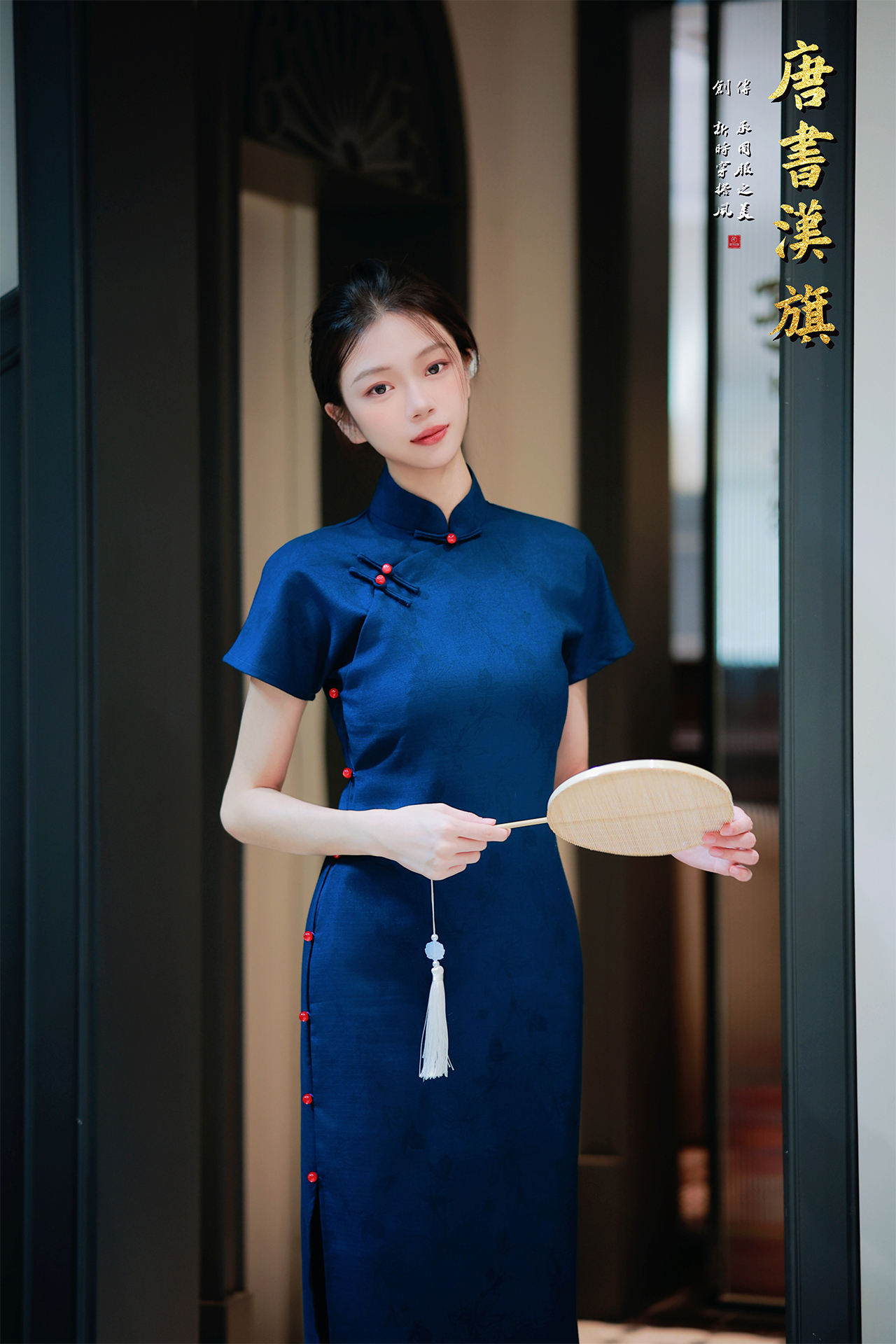 【远山黛】藏青提花旗袍高领剪裁衬出颈部线条,侧襟红珠盘扣添复古灵韵,短袖设计适配多场景穿搭;提花面料暗蕴精致纹理,修身廓形勾勒曼妙曲线,开衩细节更显步履风情。