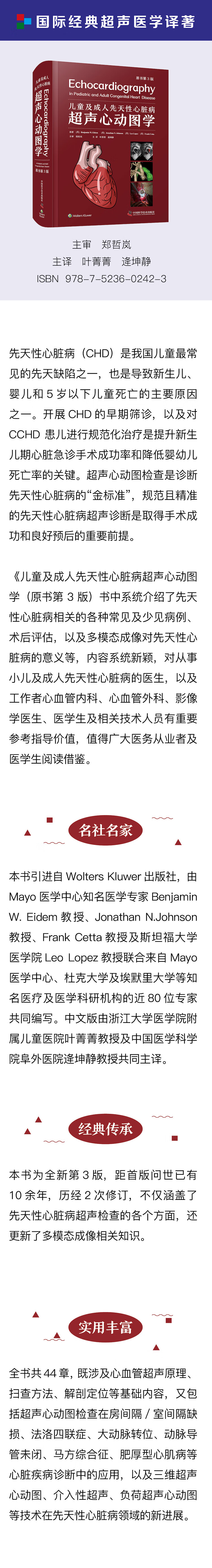 本书引进自WoltersKluwer出版社,由Mayo医学中心知名医学专家BenjaminW.Eidem教授、JonathanN.Johnson教授、FrankCetta教授及斯坦福大学医学院LeoLopez教授联合来自Mayo医学中心、杜克大学及埃默里大学等知名医疗及医学科研机构的近80位专家共同编写。本书为全新第3版,不仅涵盖了先天性心脏病超声检查的各个方面,还更新了多模态成像相关知识。全书共44章,既涉及心血管超声原理、扫查方法、解剖定位等基础内容,又包括超声心动图检查在房间隔/室间隔缺损、法洛四联症、大动脉转位、动脉导管未闭、马方综合征、肥厚型心肌病等心脏疾病诊断中的应用,以及三维超声心动图、介入性超声、负荷超声心动图等技术在先天性心脏病领域的新进展。本书经典实用且图文并茂,适合超声科、心内科、心外科等科室医师、医学生及相关专业技术人员参考阅读。