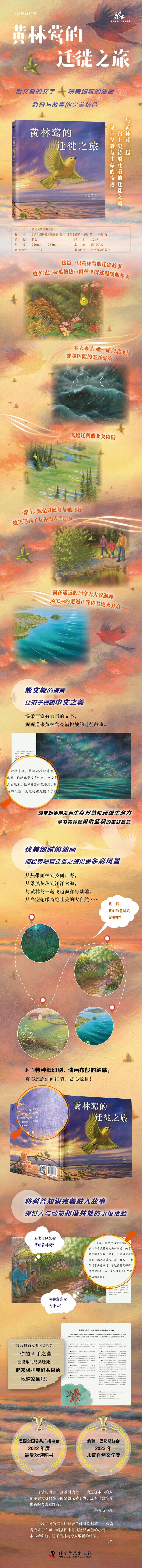 散文般优美的语言,娓娓道来黄林莺充满挑战的迁徙故事。 温柔而充满力量的文字,带领孩子接受文学的启蒙和熏陶,领略中文之美。看机智的黄林莺如何充分准备以应对困难与挑战,以小小的身躯完成数千千米的迁徙之旅,堪称生命的奇迹。黄林莺勇敢、坚毅的美好品质值得我们学习。 细腻的油画,真实还原黄林莺迁徙之旅沿途风景。 每个对开页都是一幅精美的油画,用细腻的笔触描绘出黄林莺迁徙途中经过的多彩风景。 从热带雨林到乡间旷野,从繁茂花丛到汪洋大海,与黄林莺一起飞越海洋与陆地,从高空俯瞰奇绝壮美的大自然。 故事中蕴含科普知识,书后附有实用建议。 黄林莺生活在哪里?它们喜欢吃什么?雄鸟和雌鸟外貌有什么不同?人类的哪些行为会影响到鸟类迁徙?……本书不仅将科普知识完美融入故事,深入浅出探讨人与动物和谐共处的永恒话题,书后还总结出10个实用小建议,呼吁读者通过举手之劳帮助鸟类迁徙,共同维护我们的地球家园。