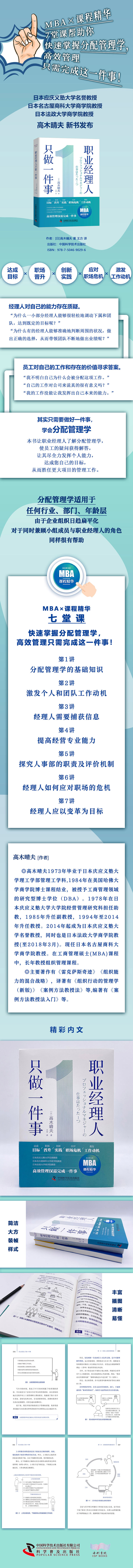 1.本书为日本庆应义塾大学、名古屋商科大学商学院、政法大学商学院教授高木晴夫MBA课程精华 2.高效管理只需要完成一件事,那就是学会分配管理学 3.7堂课帮你快速掌握分配管理学的精髓