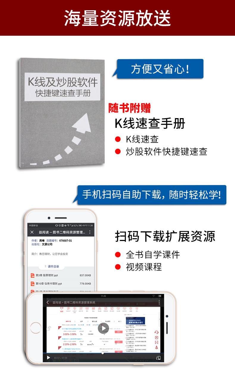 5.赠送K线及炒股软件快捷键速查手册、相关的教学视频和自学课件。