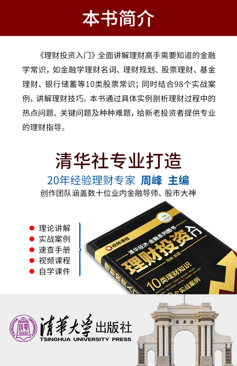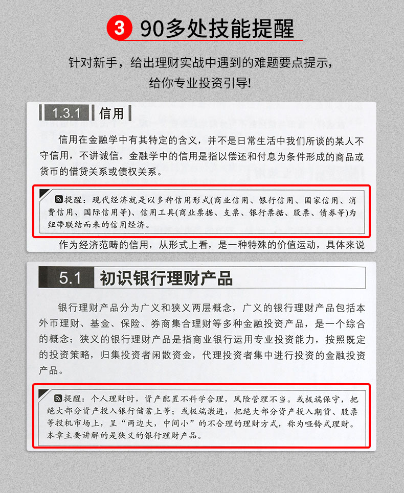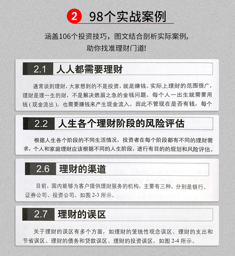 1.理财投资知识内容全面:金融学常识(通货膨胀、通货膨胀率、通货紧缩、股权融资、VC和PE)、理财必知的常识(为什么人人都需要理财、人生各个理财阶段的风险评估、理财的三个层次、七个技巧、一生需要打量的钱账、理财的渠道等),还包括股票理财、基金理财、银行理财、保险理财、存款理财、贷款理财、债券理财产品和信用卡理财。一本书全面涵盖理财知识和投资技巧。