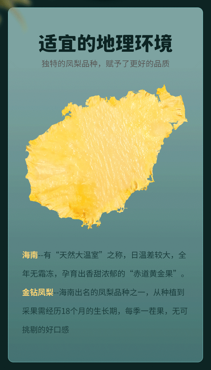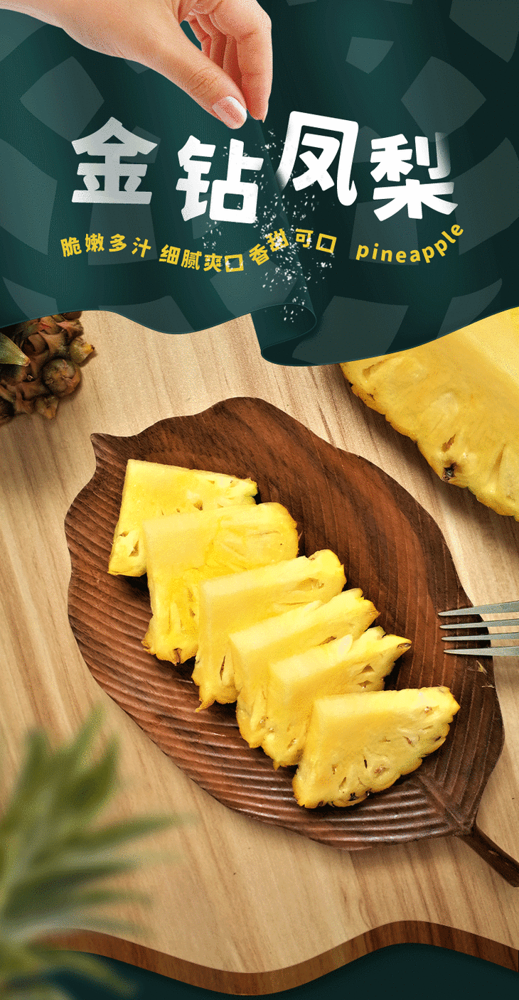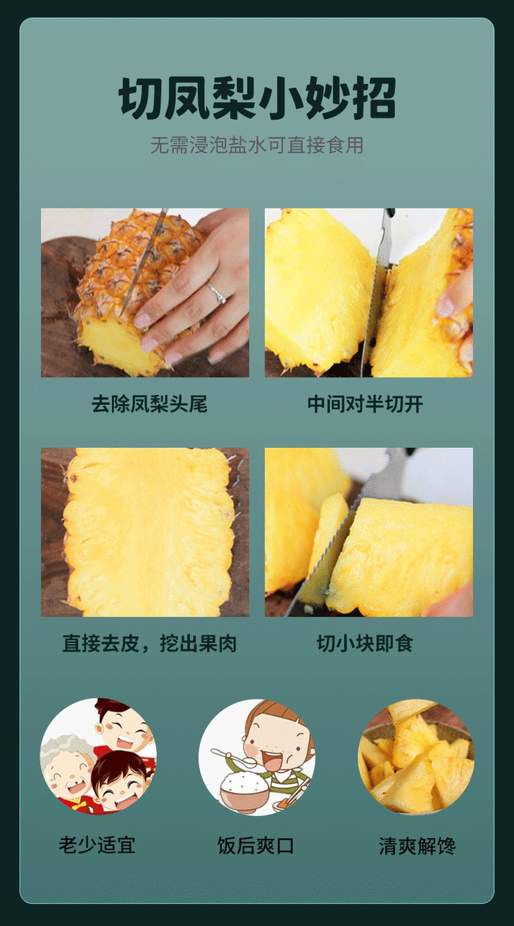 我觉得应该也有蛮多人跟我一样,不太分得清菠萝和凤梨的。所以我也在页面里也做了一下小科普,凤梨除了没有菠萝内刺这个大特点外,口感和甜度上也都比菠萝优秀太多,更关键的是直接削开就能吃,连芯都可以,并且也不像菠萝那样一定要浸泡盐水才能把甜味吊出来!而且凤梨还没有菠萝的那股涩味,真的是酸甜可口的水果了。