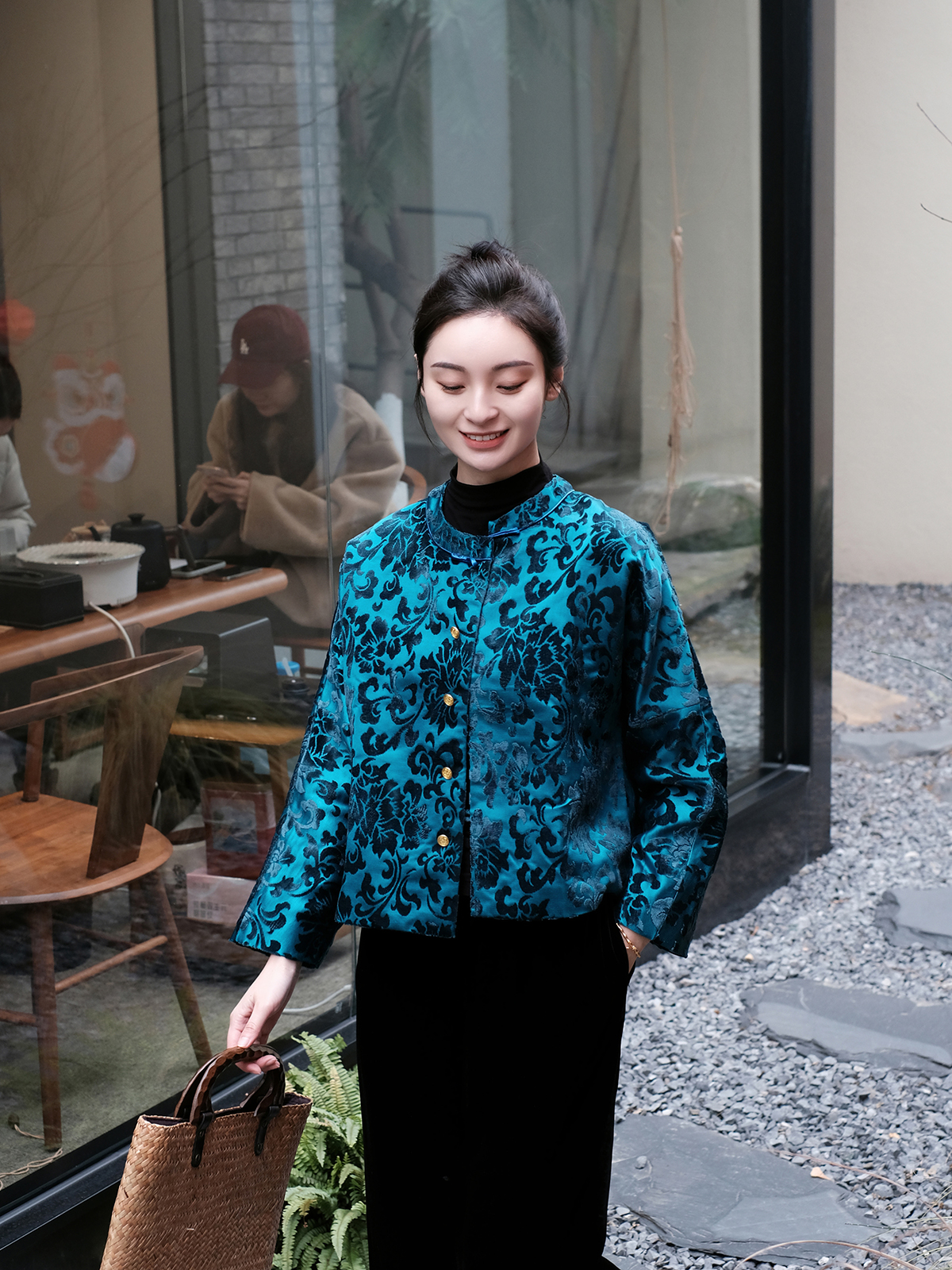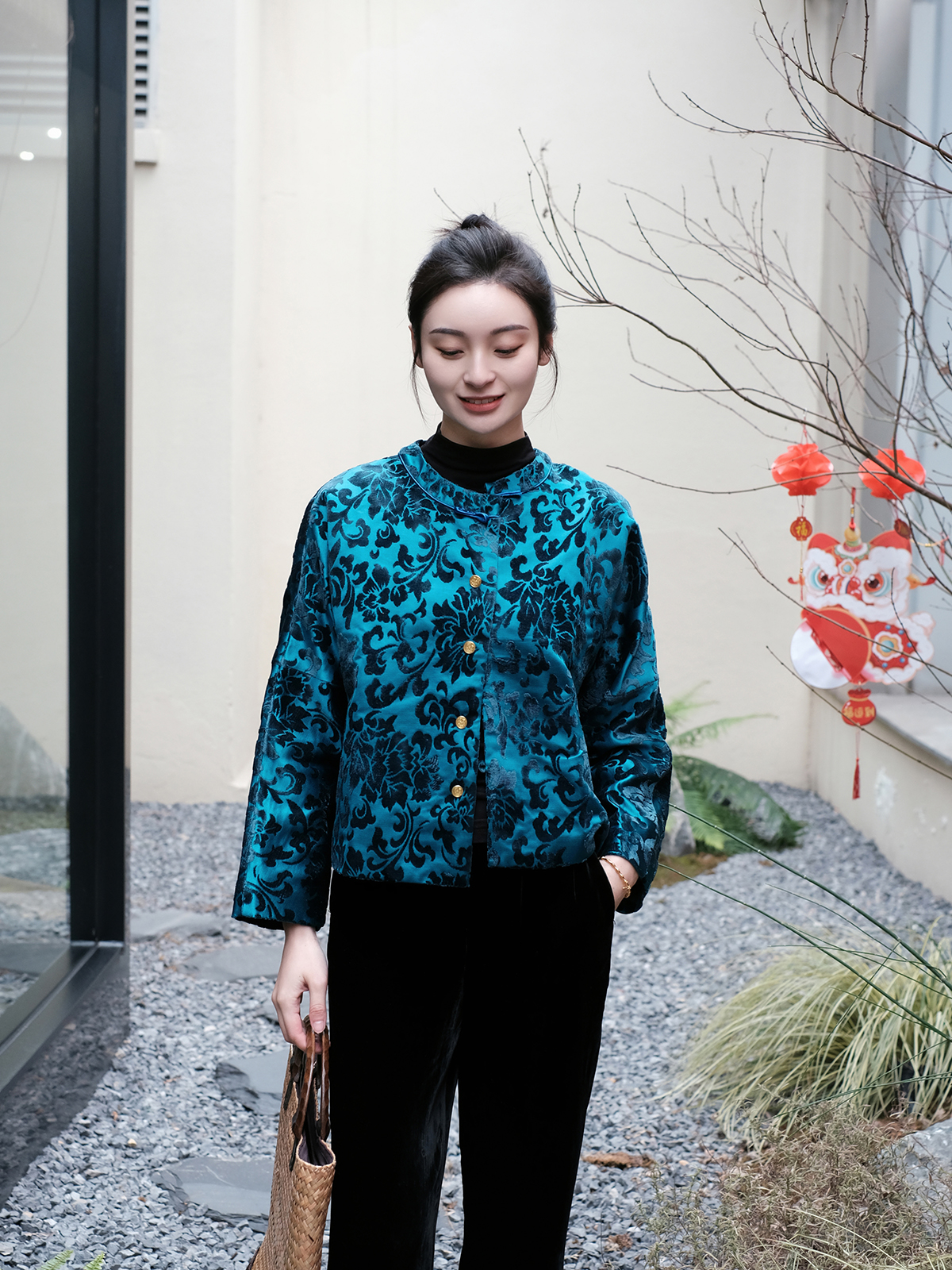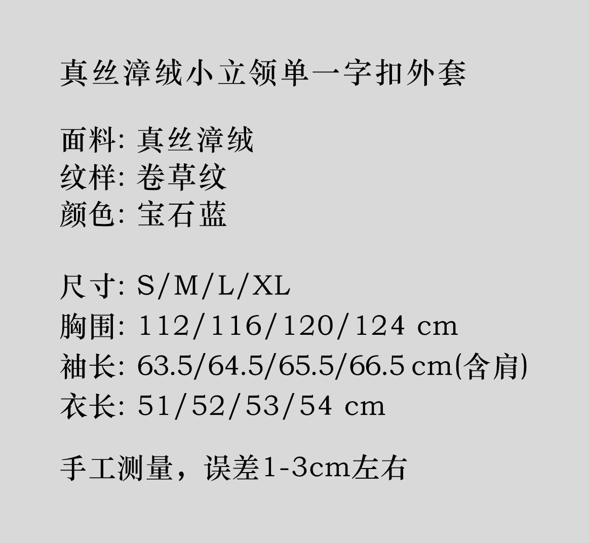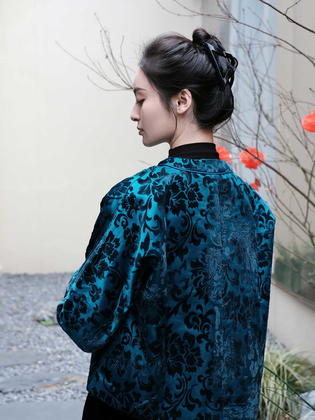 盛唐牡丹|真丝漳绒宝石蓝卷草纹小立领单一字扣外套