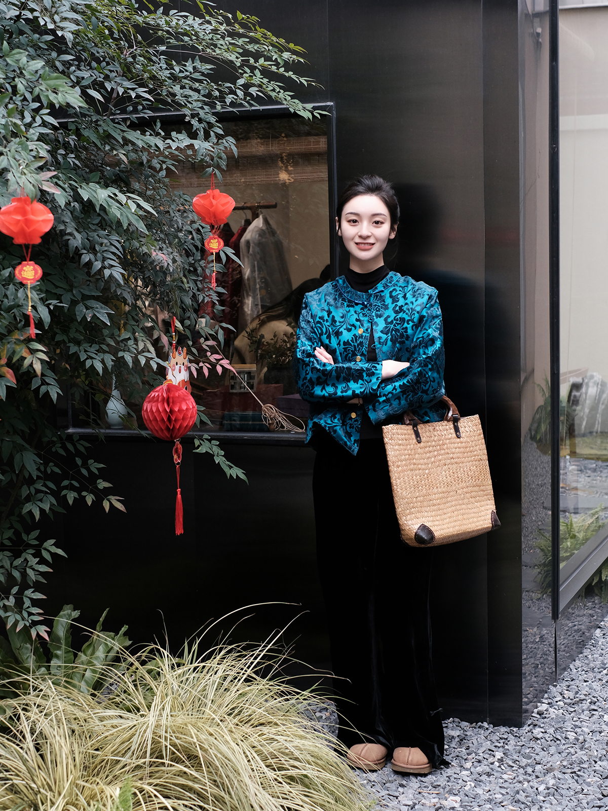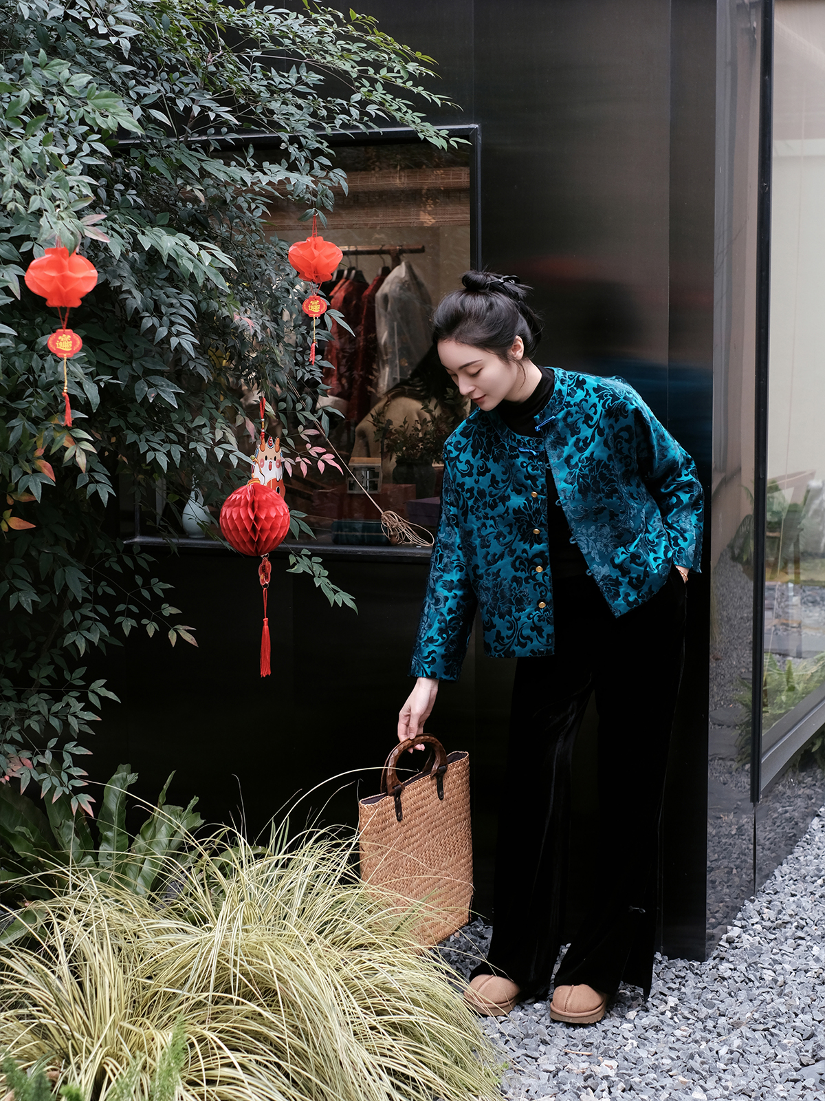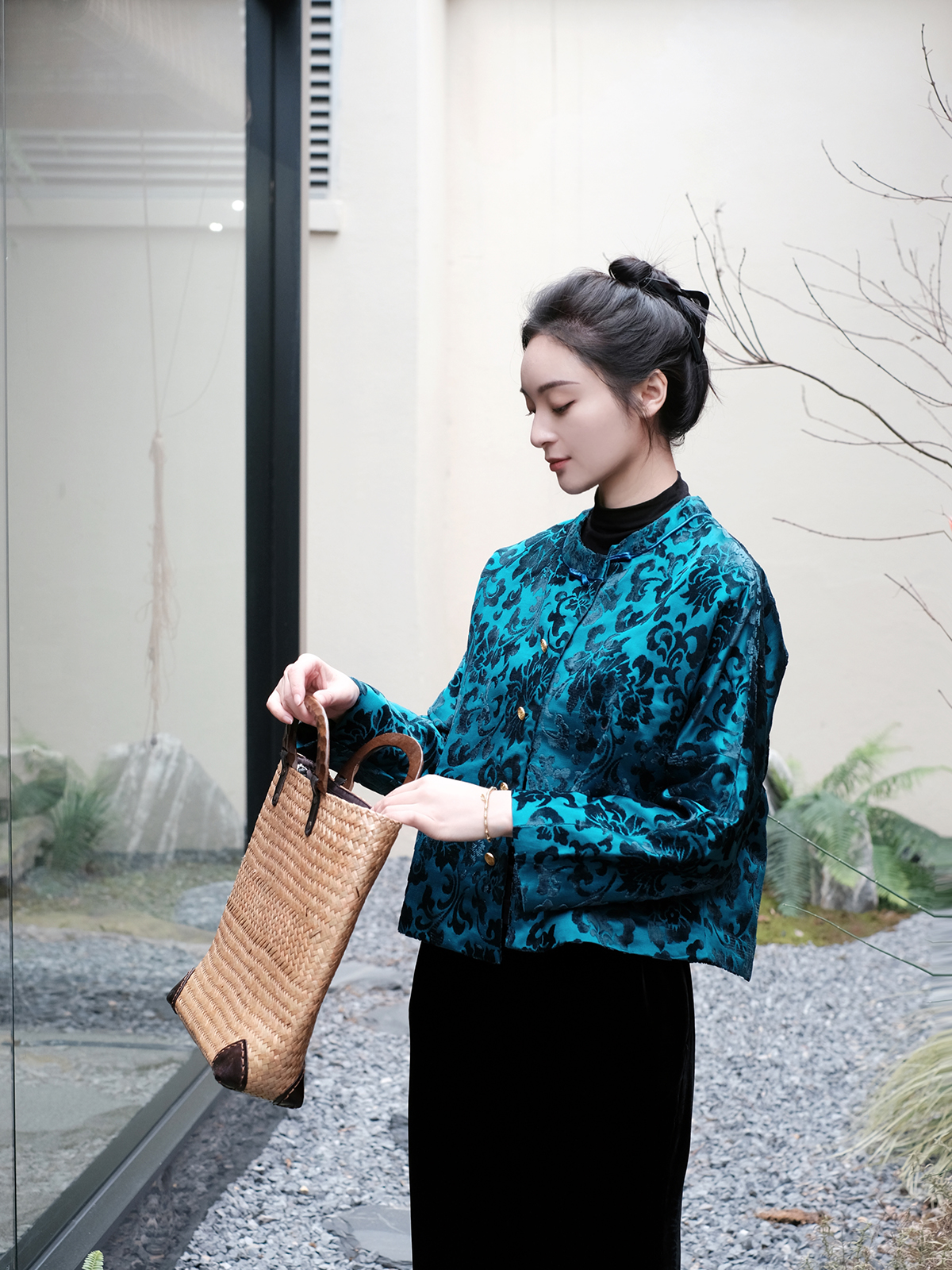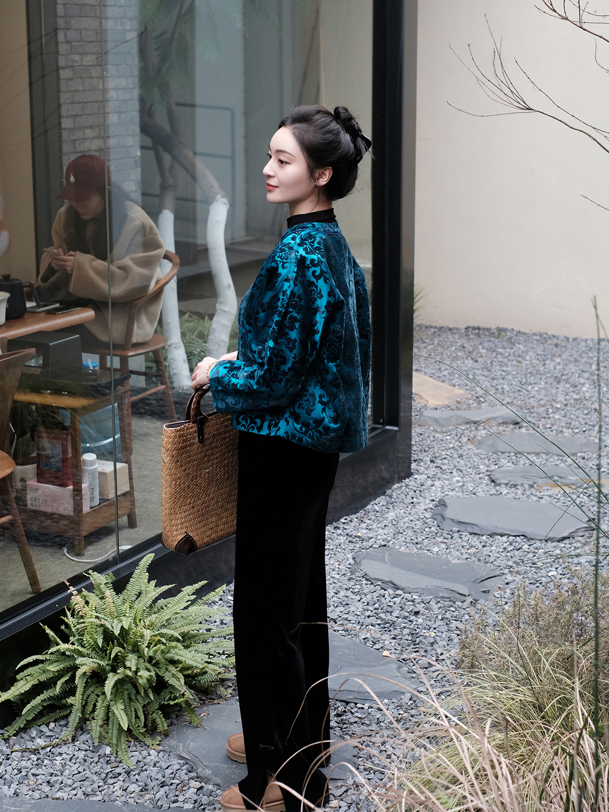 盛唐牡丹|真丝漳绒宝石蓝卷草纹小立领单一字扣外套
