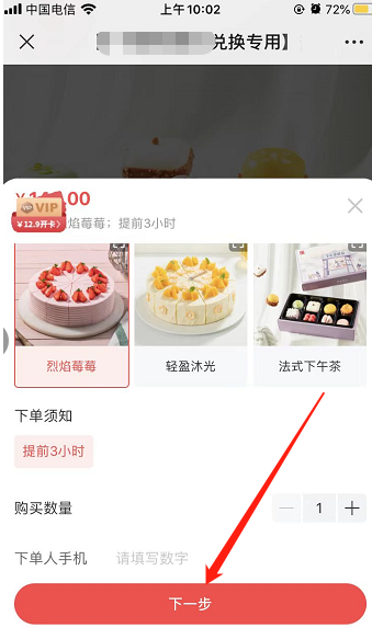 2、点兑换链接进入商品--【立即购买】按钮,选择您想要的下午茶,点击【下一步】