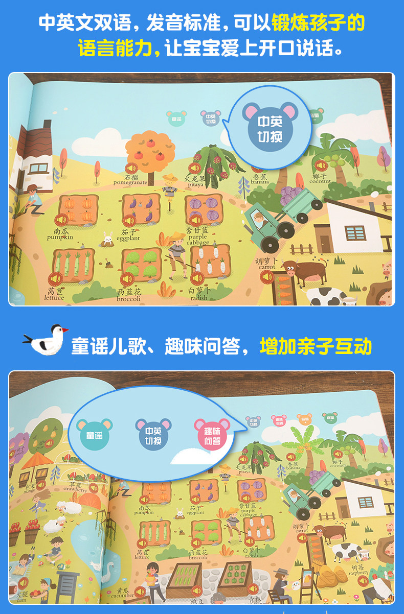 按键可中英文切换,双语教学,标准美式发音,孩子在听读的同时可培养语感,从小练就纯正口语,满足孩子的英语启蒙需要。