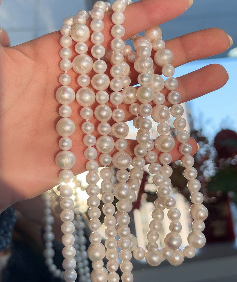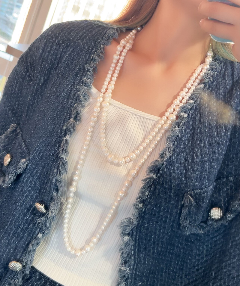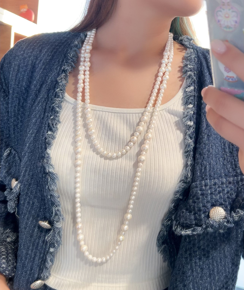 3-4mm近圆微微瑕-8-9mm高品质淡水圆珠 真正的一款多戴!随便凹造型 绝绝子的一套 这款的手工量太大了 且买且珍惜。总长160cm左右
