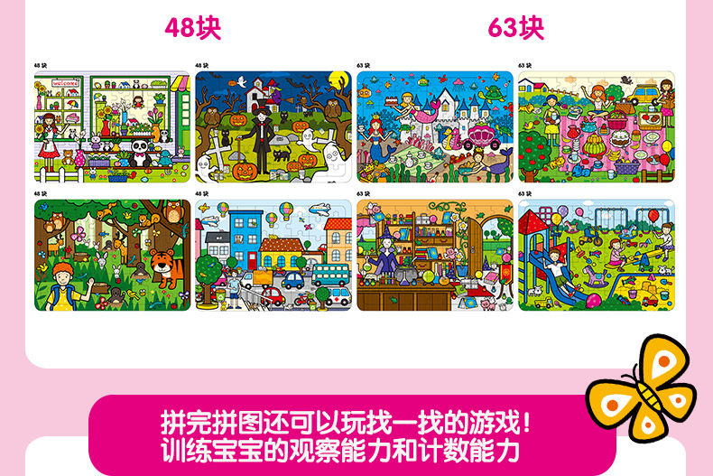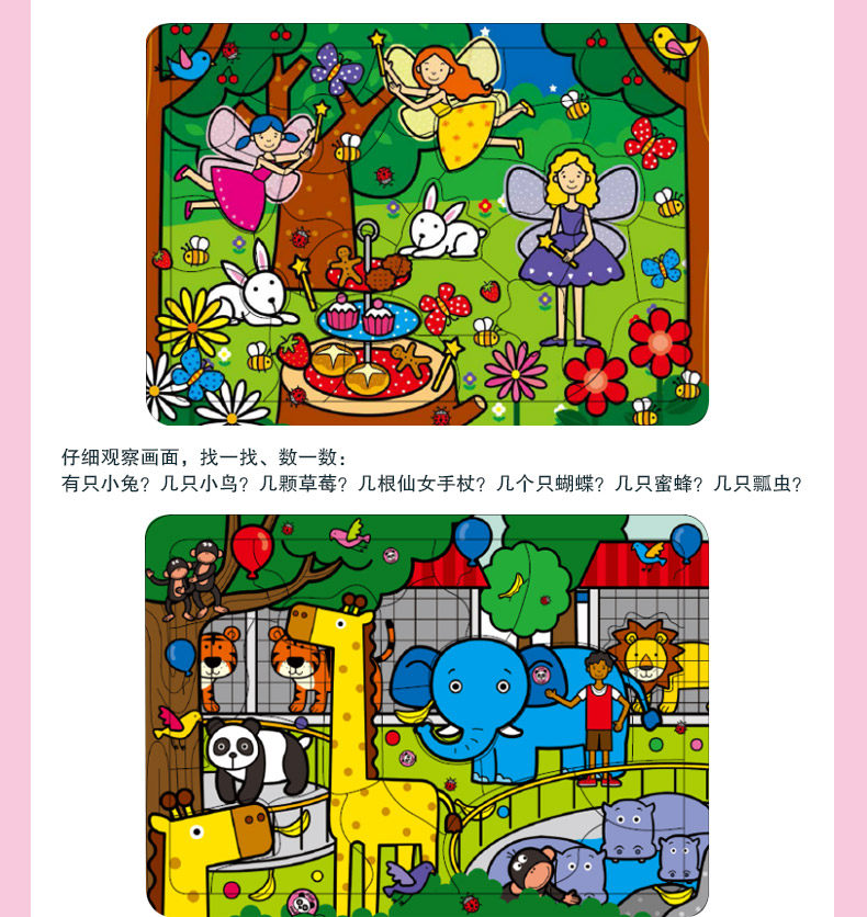 | 内含24张双层拼图,画面丰富多彩,场景有动物园、沙滩、海底、郊外、游乐园等等。适用于3-6岁。丰富精彩的画面设计,增强幼儿的学习兴趣。眼到手到加多元功能,锻炼幼儿的协调能力。反复观察分析和思考,提高幼儿的逻辑思维能力。不断地寻找拼接图块,提升幼儿的耐心、专注力和解决问题的能力。 |