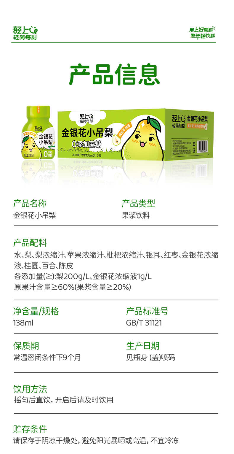 轻上金银花小吊梨饮品优选莱阳秋月梨清甜爽润138ml