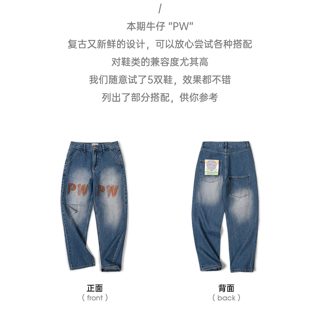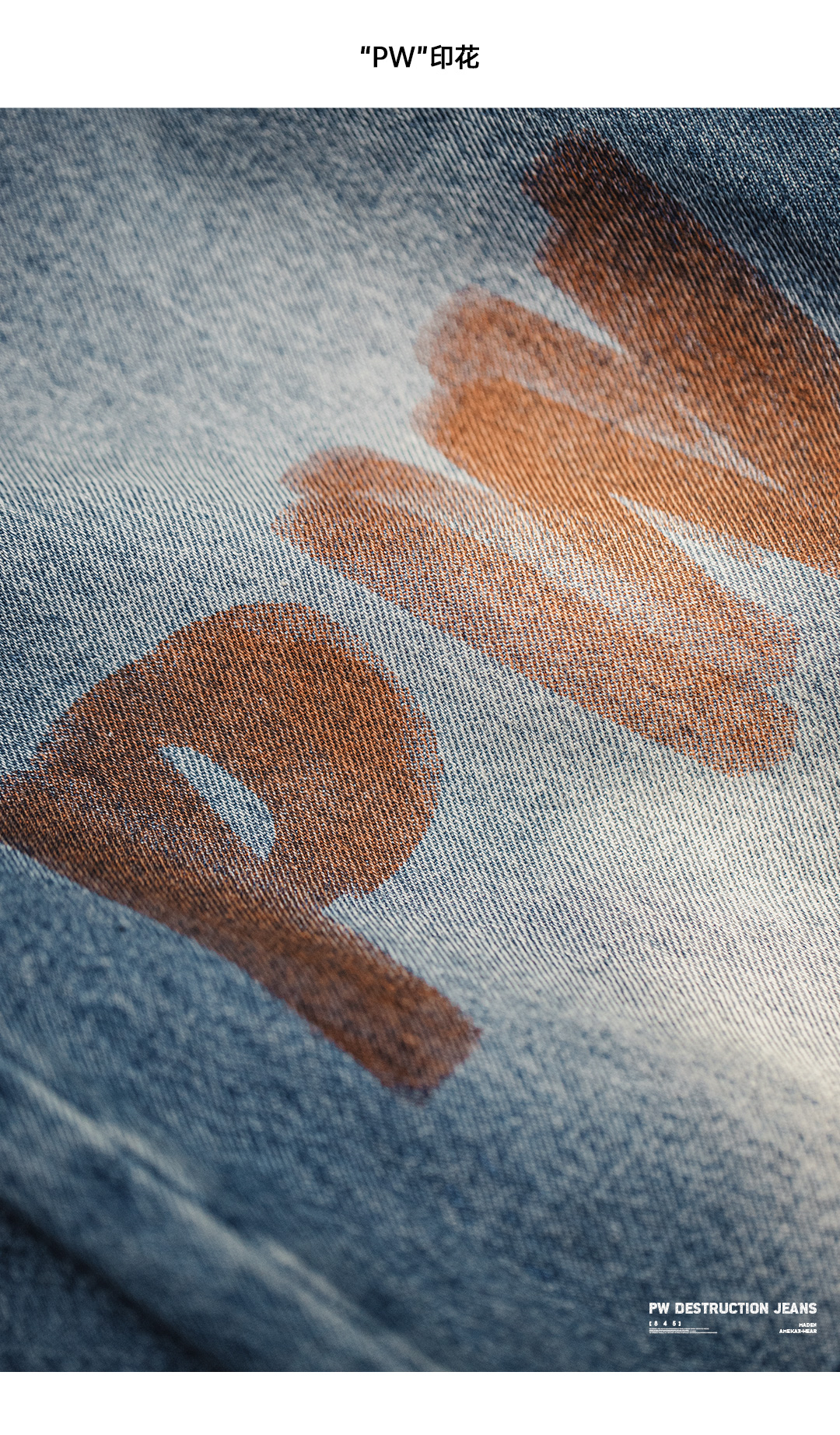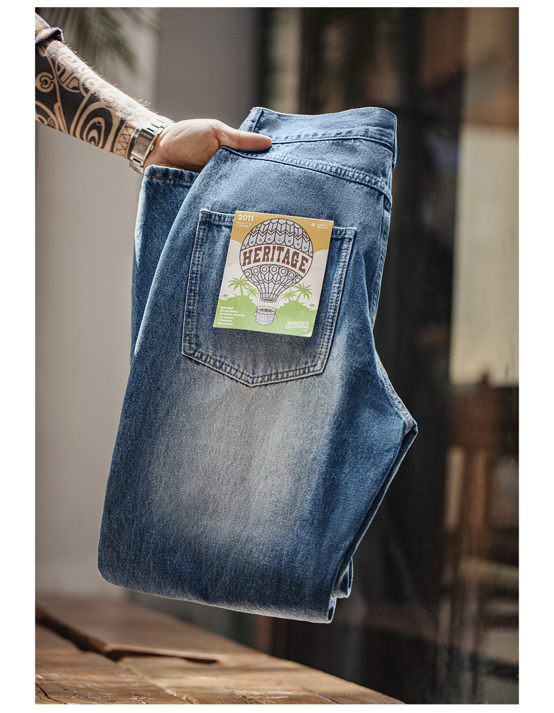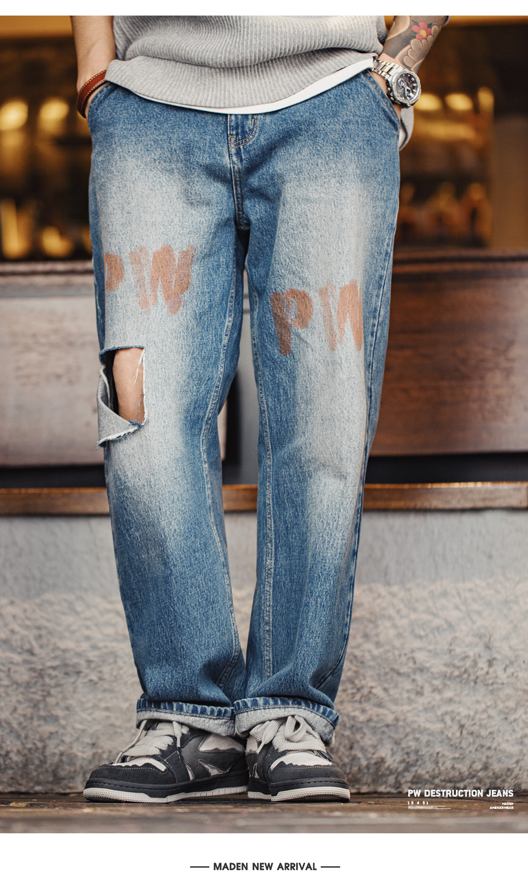 马登工装 美式复古磨白破坏牛仔裤vibe破洞水洗丹宁宽松直筒裤男