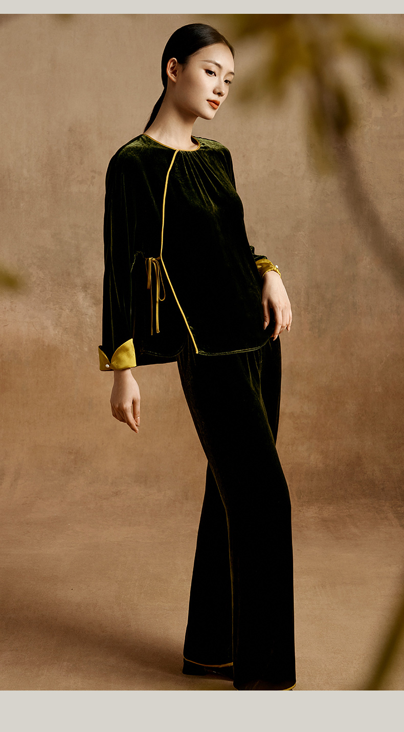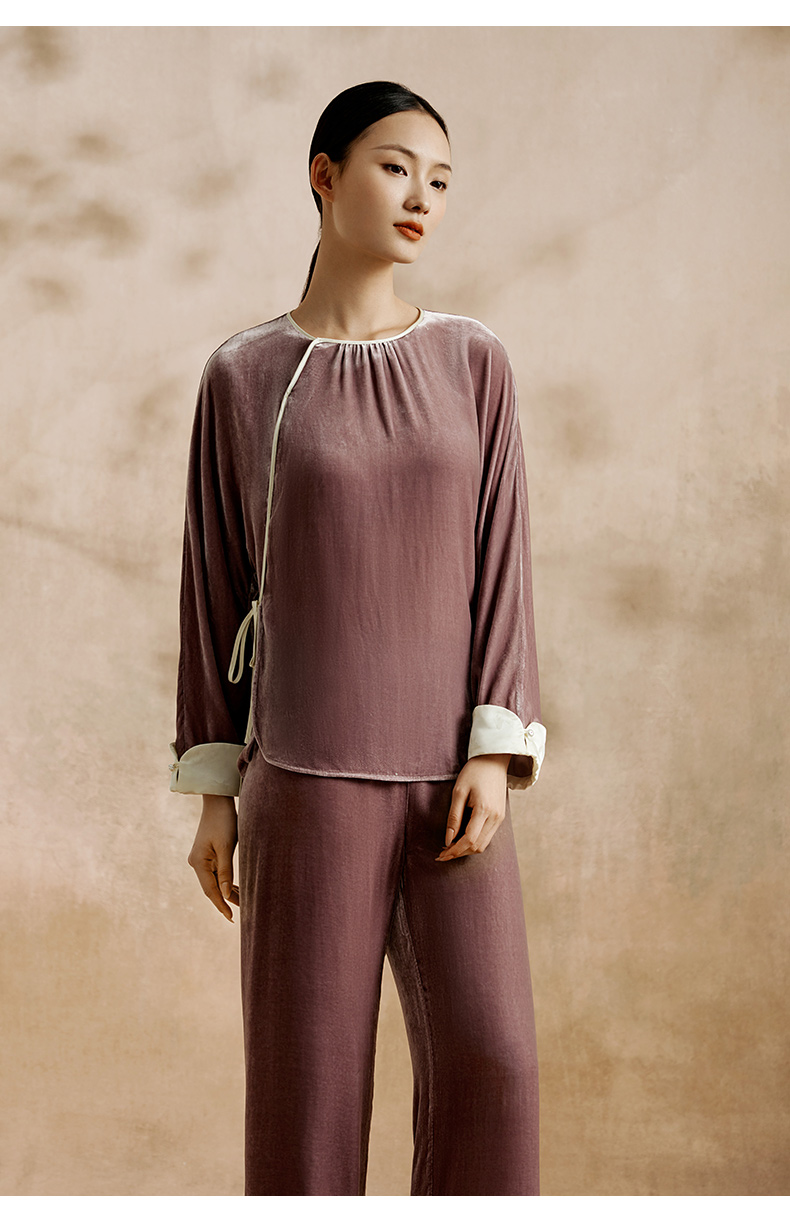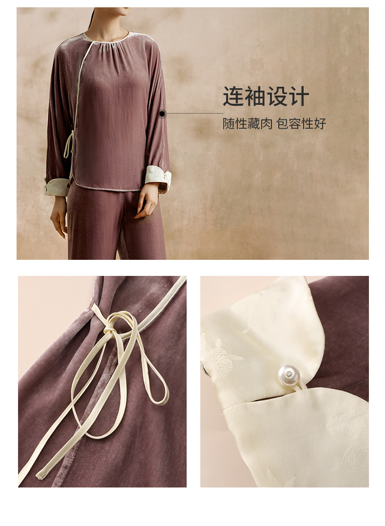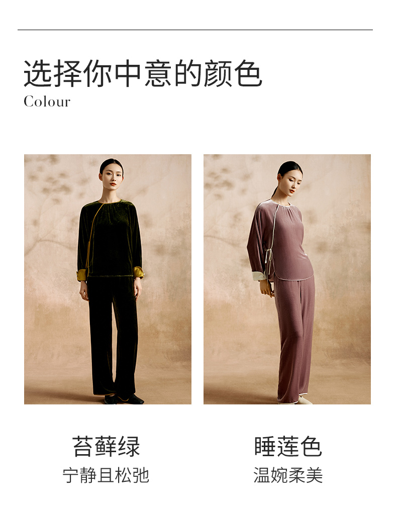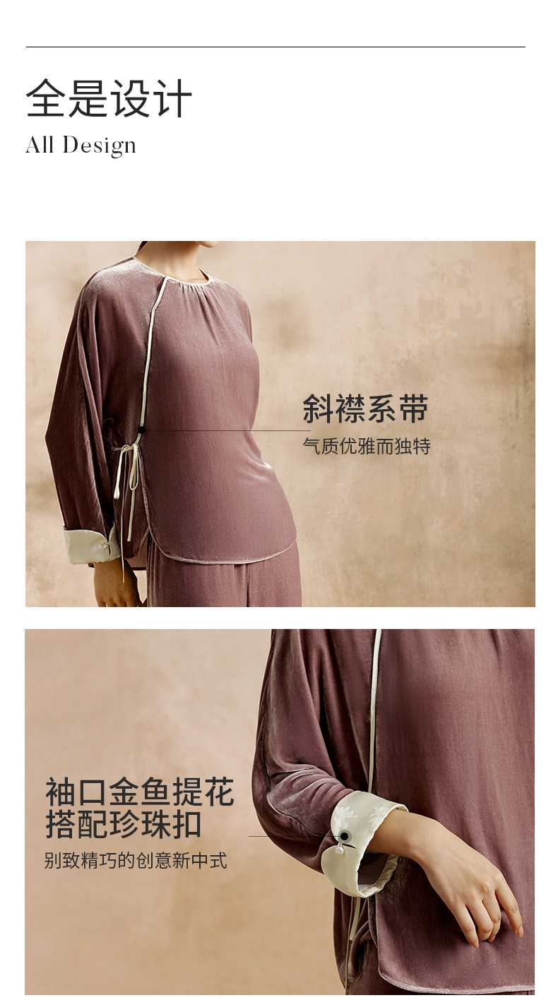【自带高光桑蚕丝丝绒】新中式睡衣女优雅斜襟衣裤套家居服金三塔(限价款) YSFEC208