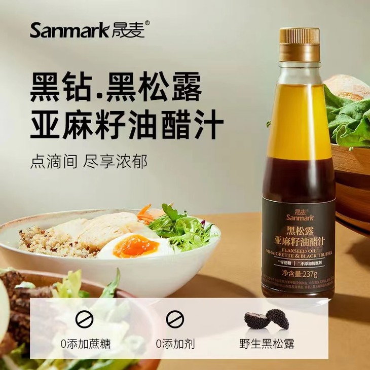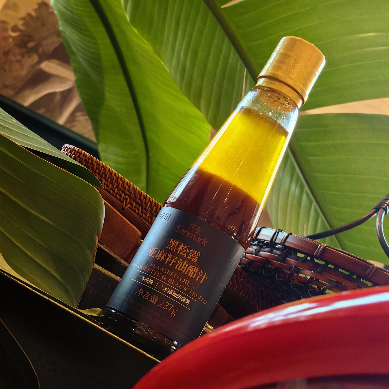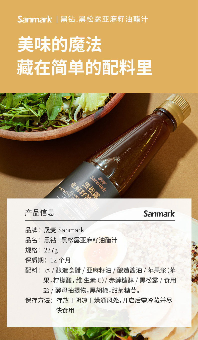 相比于其他油醋汁,晟麦用优秀的亚麻籽油代替普通油脂,吃起来好处多多,之前也和大家科普过啦!它含有丰富的不饱和脂肪酸,能帮助体内甘油三脂和胆固醇以及低密度脂蛋白等物质的代谢,因此对血脂和心血管的控制都有好处;而其中的α-亚麻酸对血压也有正向作用,可以减少心脏压力;亚麻酸则对消化吸收和排便有帮助。除此外,油醋汁还特别添加了稀有食材野生黑松露,它生长在海拔2000米以上的深山中,深藏地下10cm-40cm,在极寒12月自然成熟,拥有馥郁的原生香气与水果甜味,让本就不普通的油醋汁更显特别,散发着黑松露的独特香气!同时还用了更低GI的赤藓糖醇,配料表干净简单,不用担心额外添加剂,热量和钠含量也更低,简直是为减脂人量身定制!