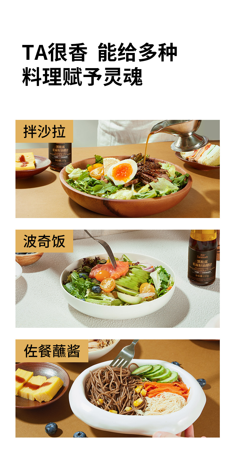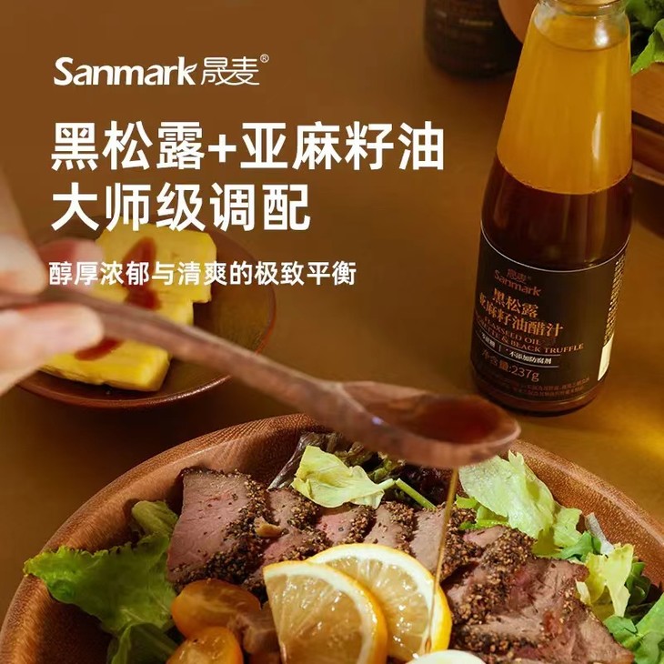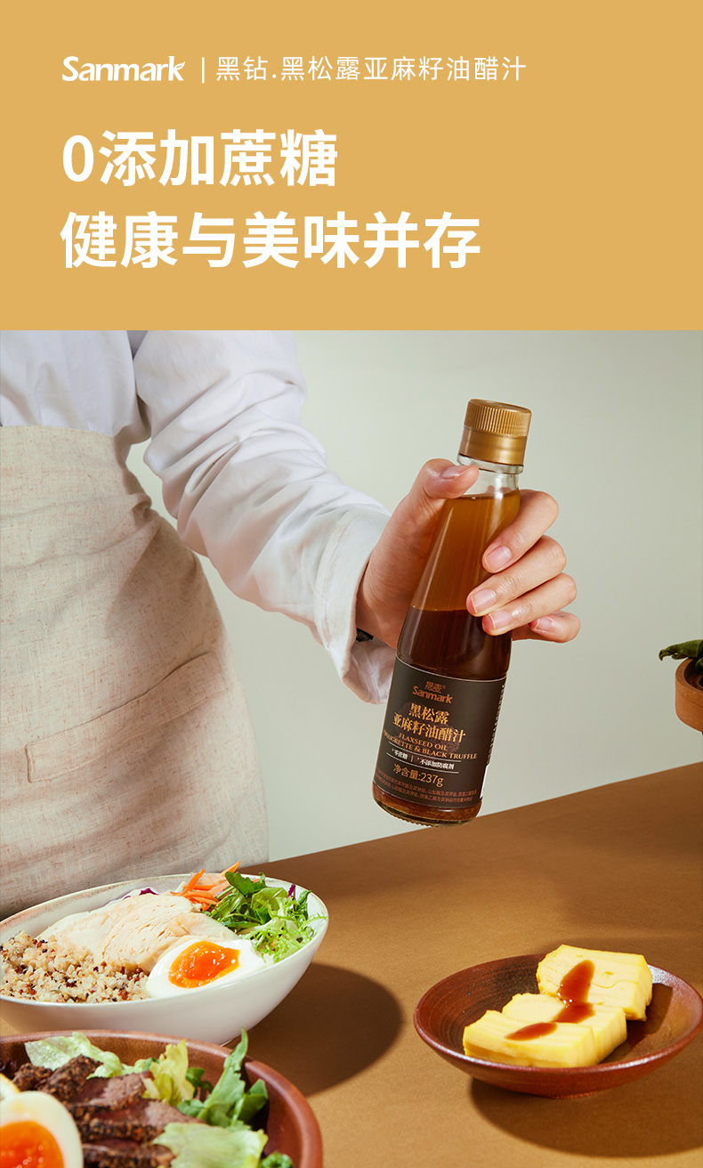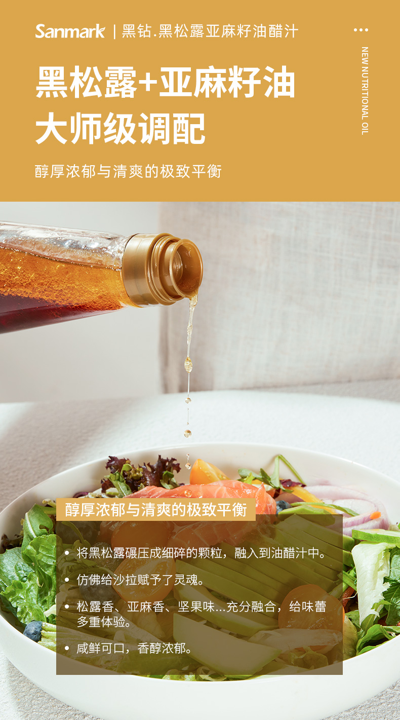 相比于其他油醋汁,晟麦用优秀的亚麻籽油代替普通油脂,吃起来好处多多,之前也和大家科普过啦!它含有丰富的不饱和脂肪酸,能帮助体内甘油三脂和胆固醇以及低密度脂蛋白等物质的代谢,因此对血脂和心血管的控制都有好处;而其中的α-亚麻酸对血压也有正向作用,可以减少心脏压力;亚麻酸则对消化吸收和排便有帮助。除此外,油醋汁还特别添加了稀有食材野生黑松露,它生长在海拔2000米以上的深山中,深藏地下10cm-40cm,在极寒12月自然成熟,拥有馥郁的原生香气与水果甜味,让本就不普通的油醋汁更显特别,散发着黑松露的独特香气!同时还用了更低GI的赤藓糖醇,配料表干净简单,不用担心额外添加剂,热量和钠含量也更低,简直是为减脂人量身定制!