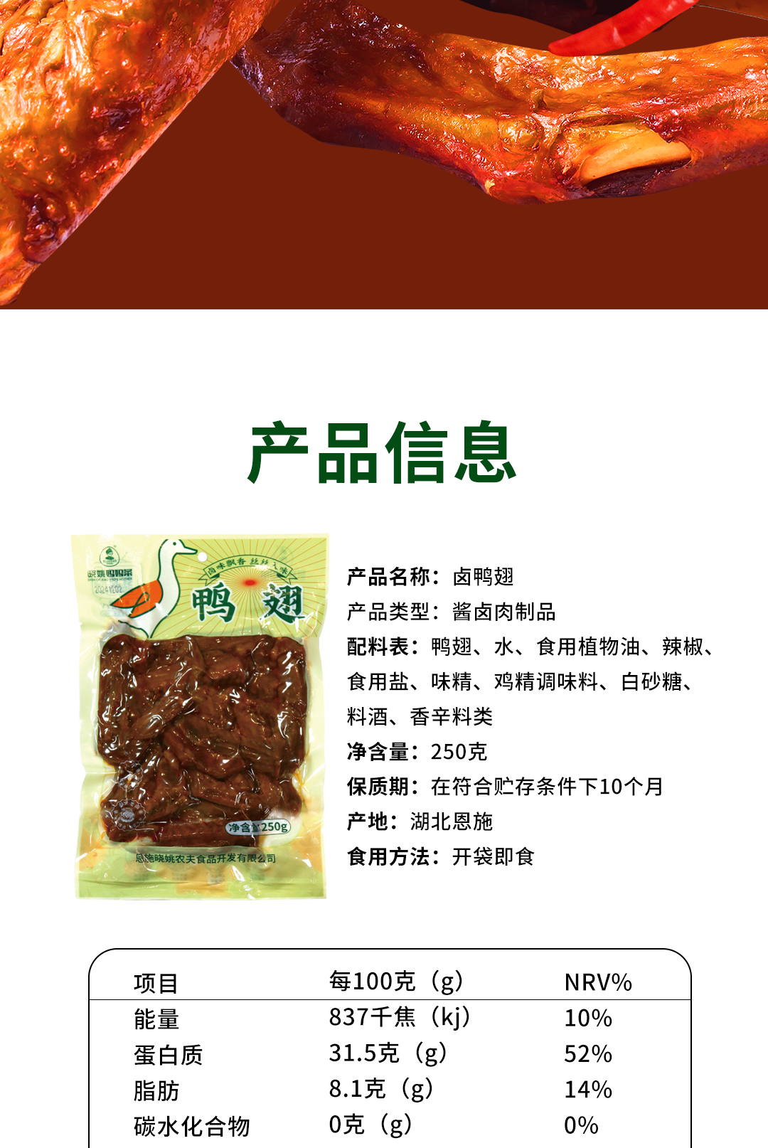 【宜昌助农馆】晓姚农夫 个大肉厚卤鸭翅250g