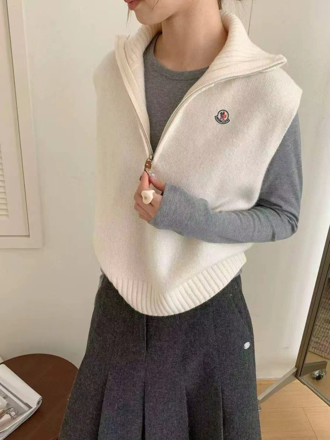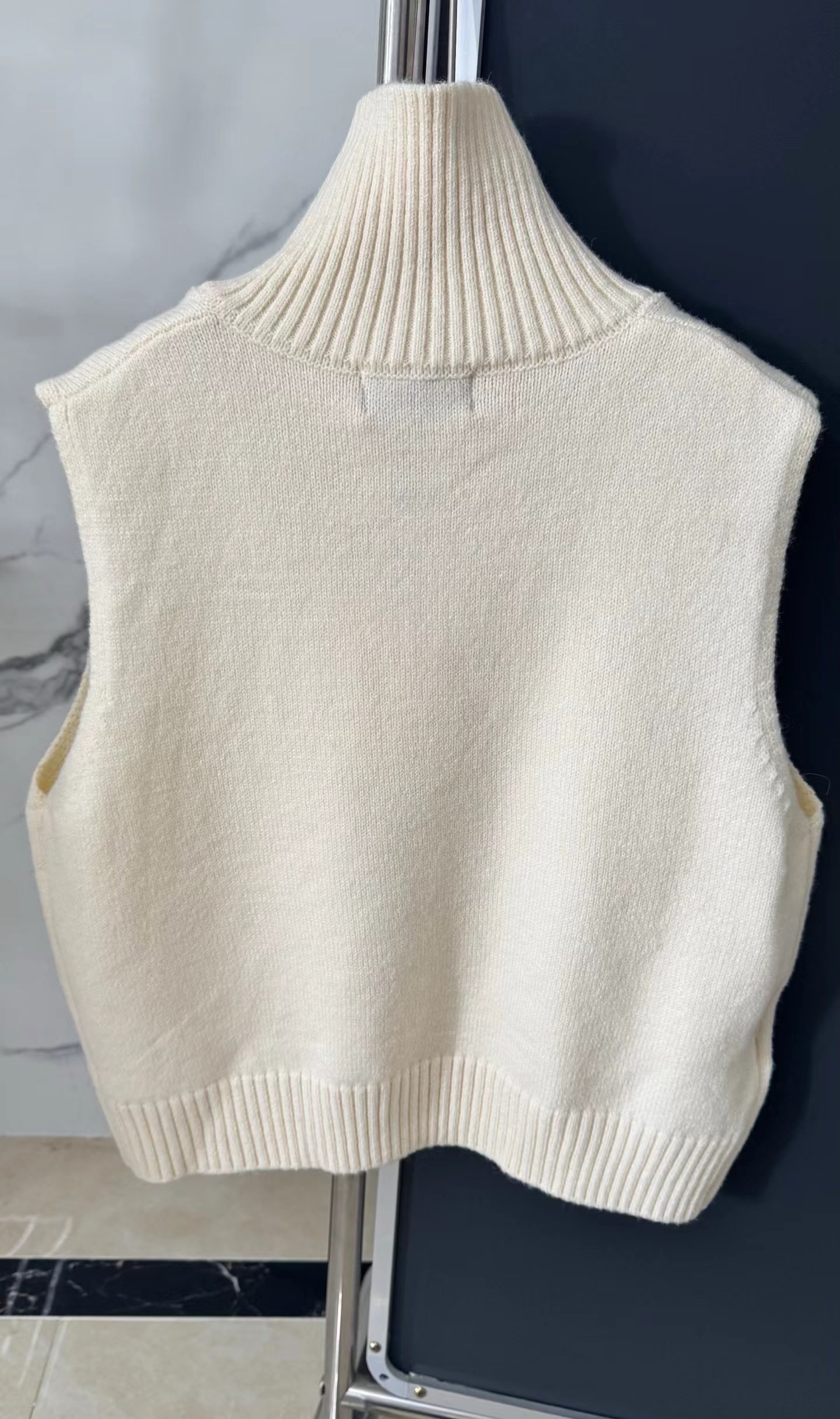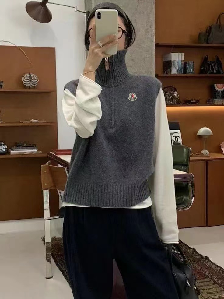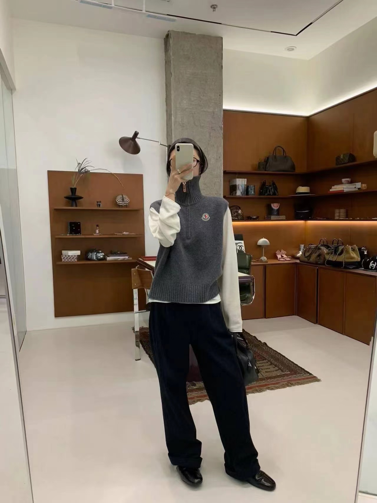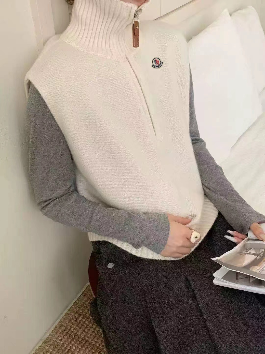 26SS针织背心高领半拉链的设计羔级感调性太拿捏人心啦~冬天穿正肩的或者修身一些的外套怕胳膊鼓鼓囊囊的或者不舒服的这种无袖背心bi入!短衣身的宽松廓形150斤穿上空间都不局促大身平针织法纹理细腻平整有质感深灰色的纱线粘毛也看不出来比黑色更好打理~双层大高领设计立体有型!!领口的廓度比普通高领大很多穿上不会紧箍在脖子上把脸显的小小的修饰脖子线条!羊毛纱线面料有厚度手感丰满柔软保暖力在冬天也够用啦~而且接触皮肤不刺扎敏感肌可以了放心入手舒适度ji佳!