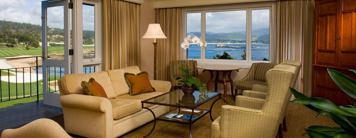 约44平方米,正对着著名的圆石滩球场18号洞果岭和大海景,配有壁炉灶台,阳台,大理石浴室,多数双床房,少数大床。