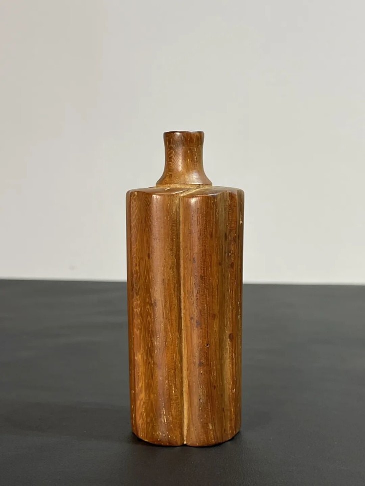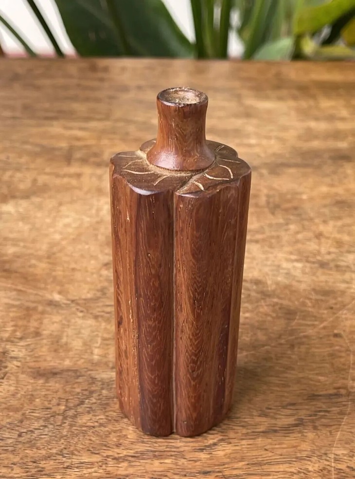 这是一件以整块海南黄花梨木掏膛琢磨而成的葵花形筒状花插,圆筒葵花形瓶身,上方平肩细颈,底部浮雕三瓣葵花形,整体形式典雅,雕琢细腻,是一件香插或是花插。
