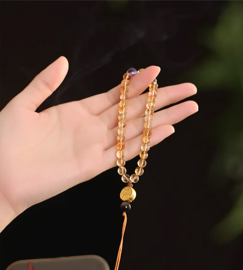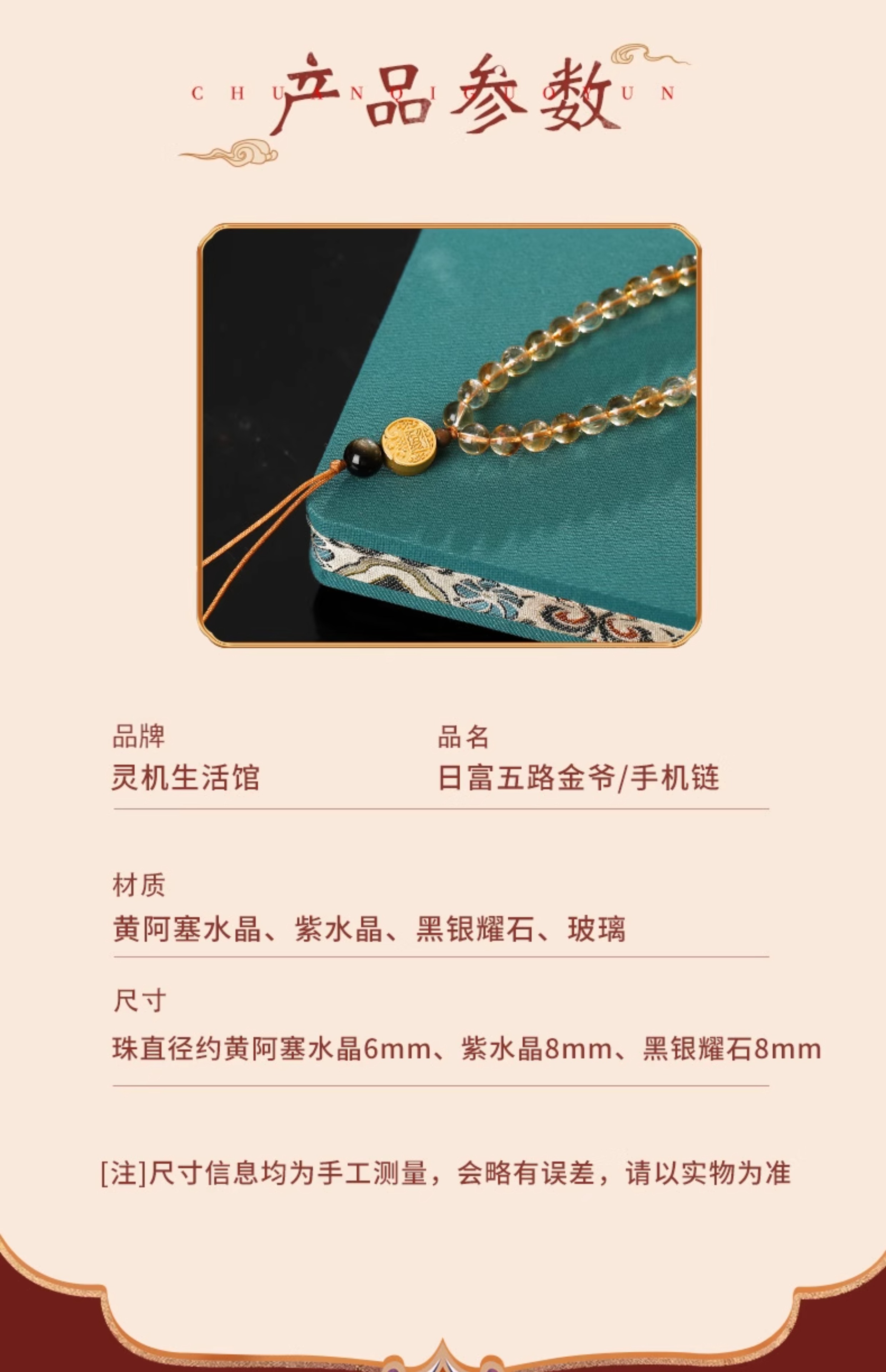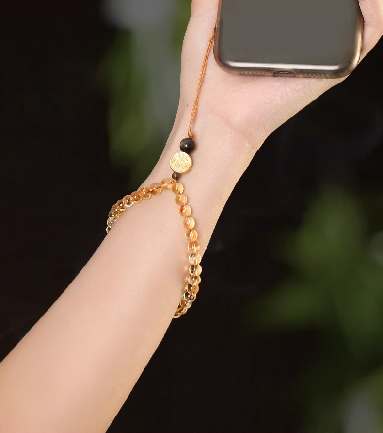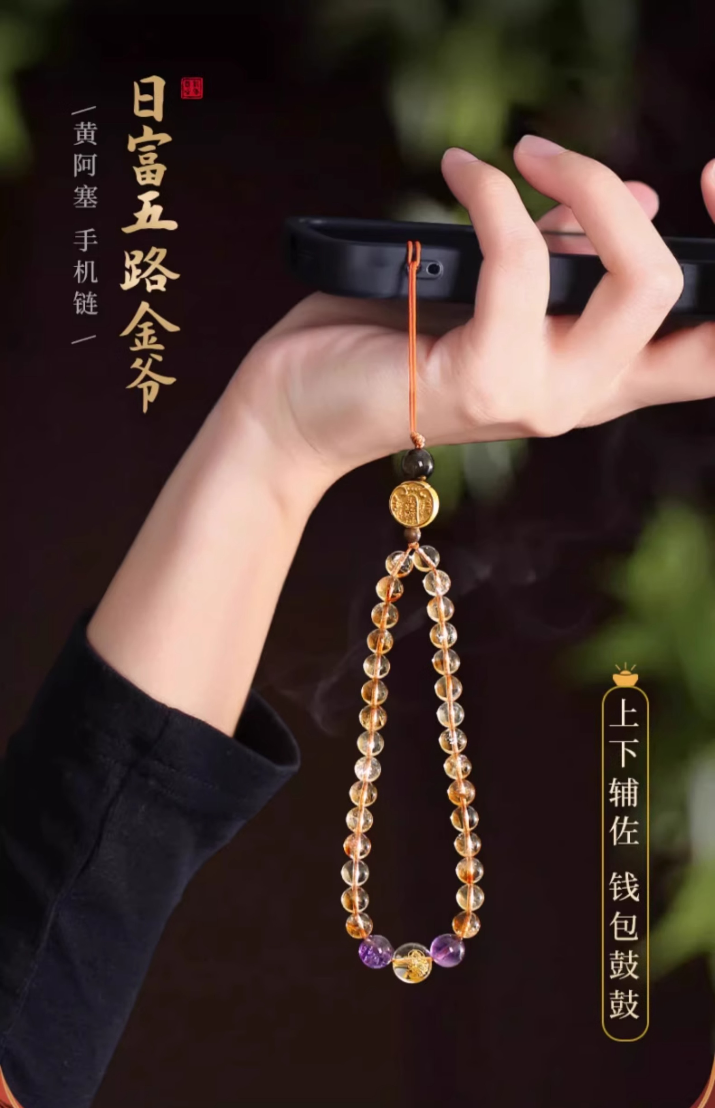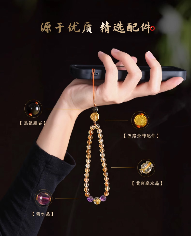 【祈愿吉品】日富五路黄水晶手机链五路金爷挂绳手腕绳防丢防摔挂件