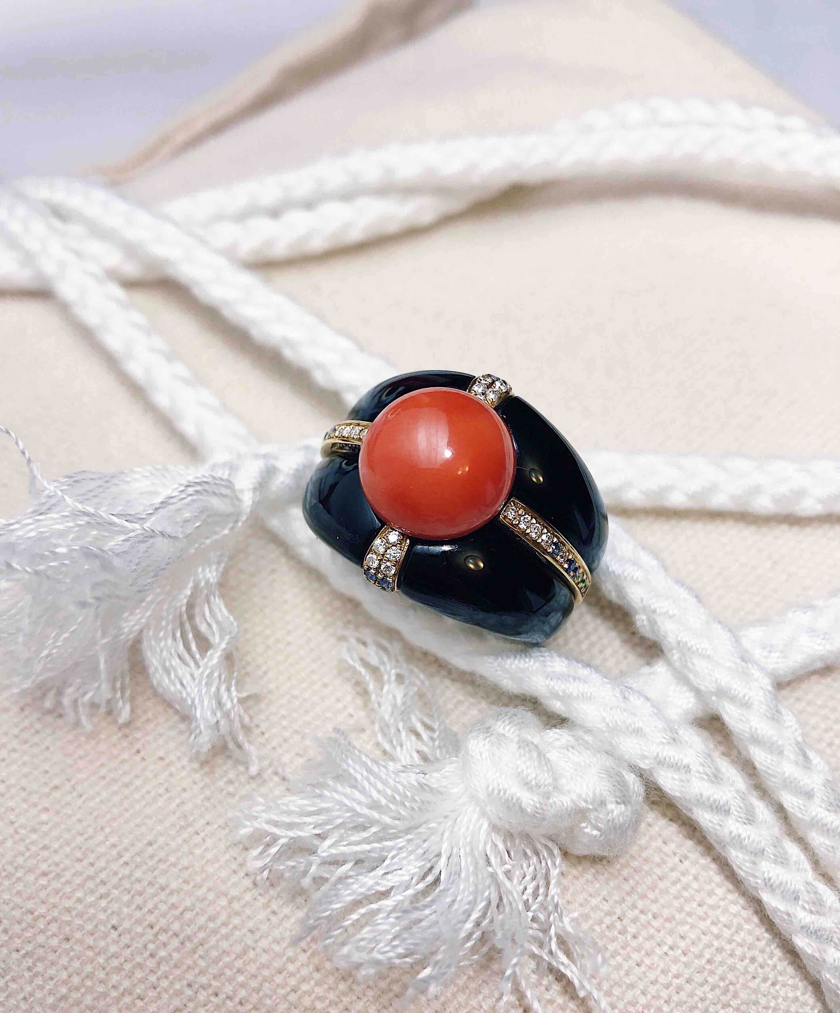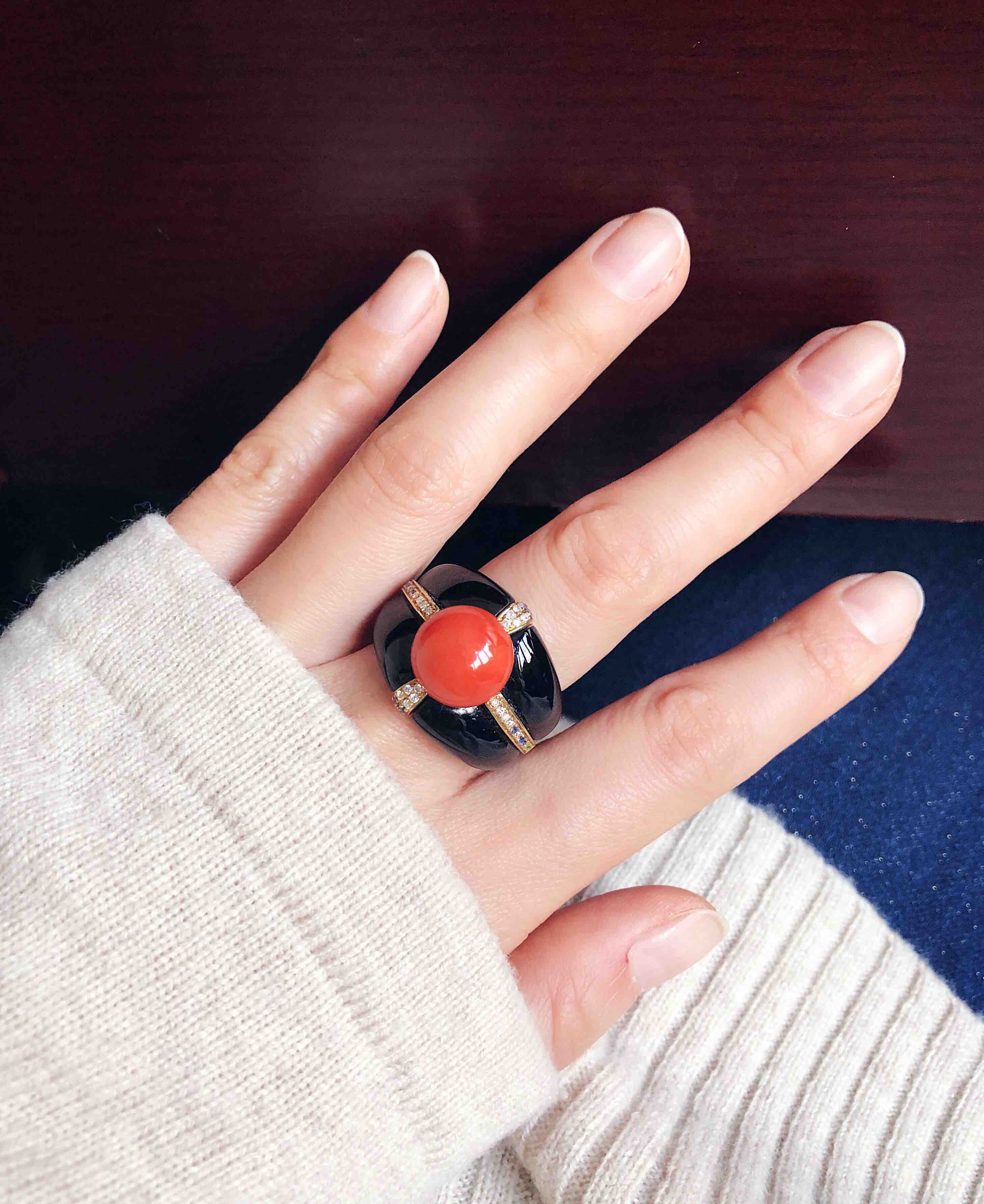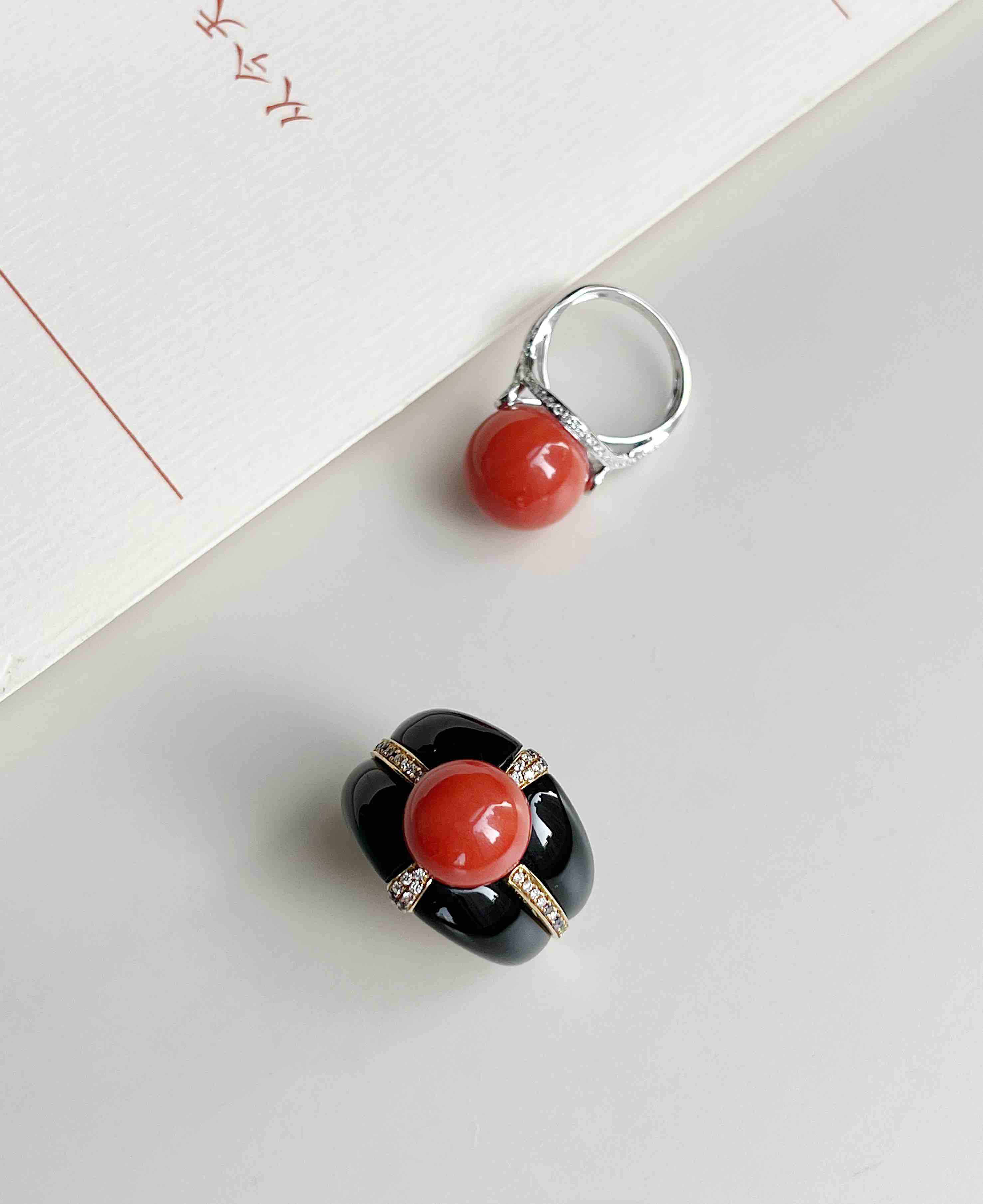 作品简介:18K钻石、玛瑙和天然红珊瑚戒指