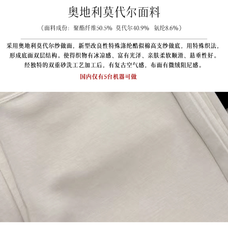 经过特殊砂洗,布面有一层细微的绒毛,带来复古的空气感,手感顺滑中带一点恰当的阻力,不易皱且好打理