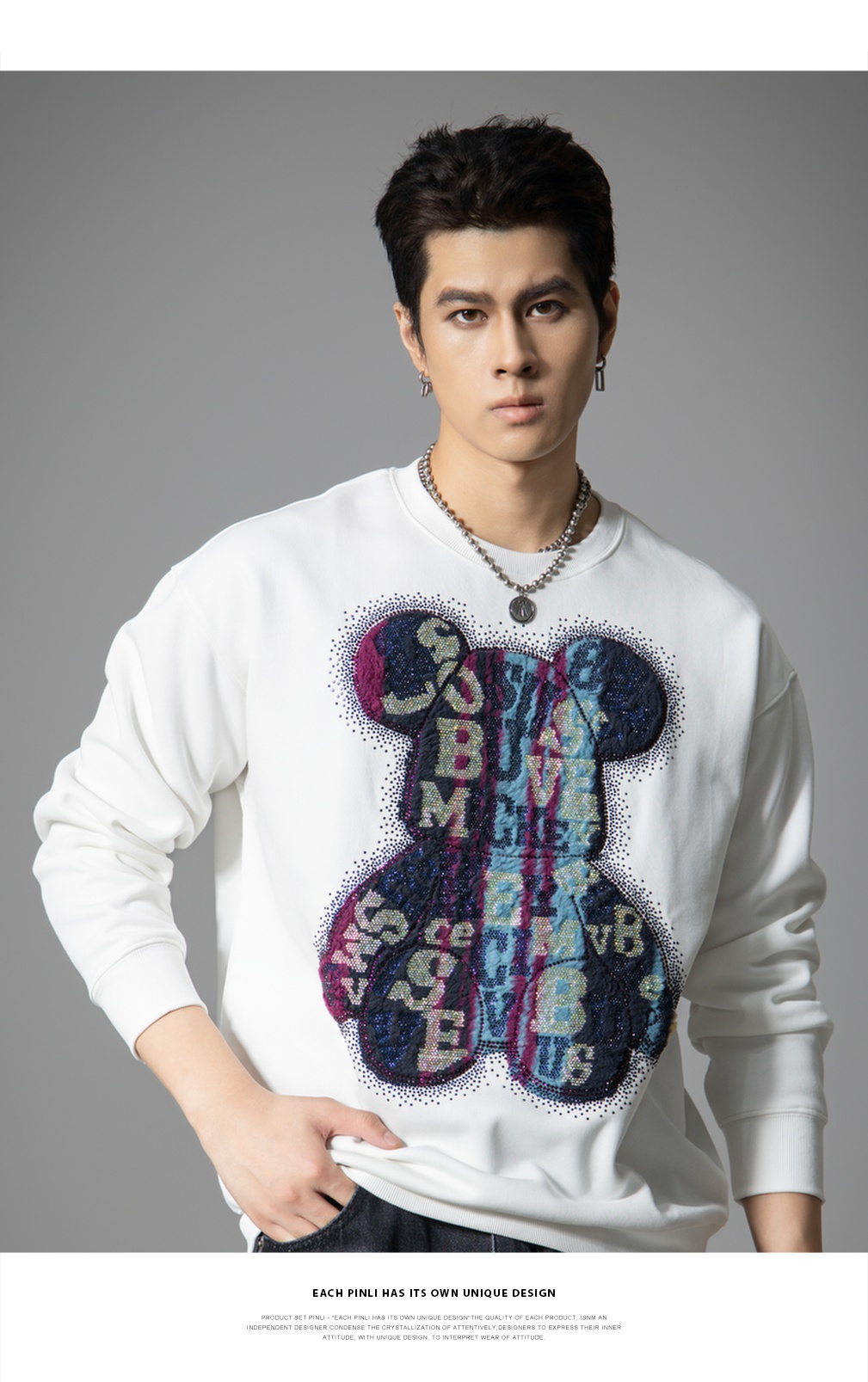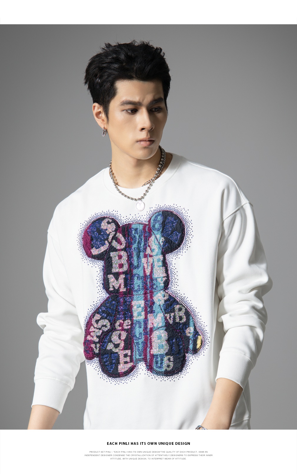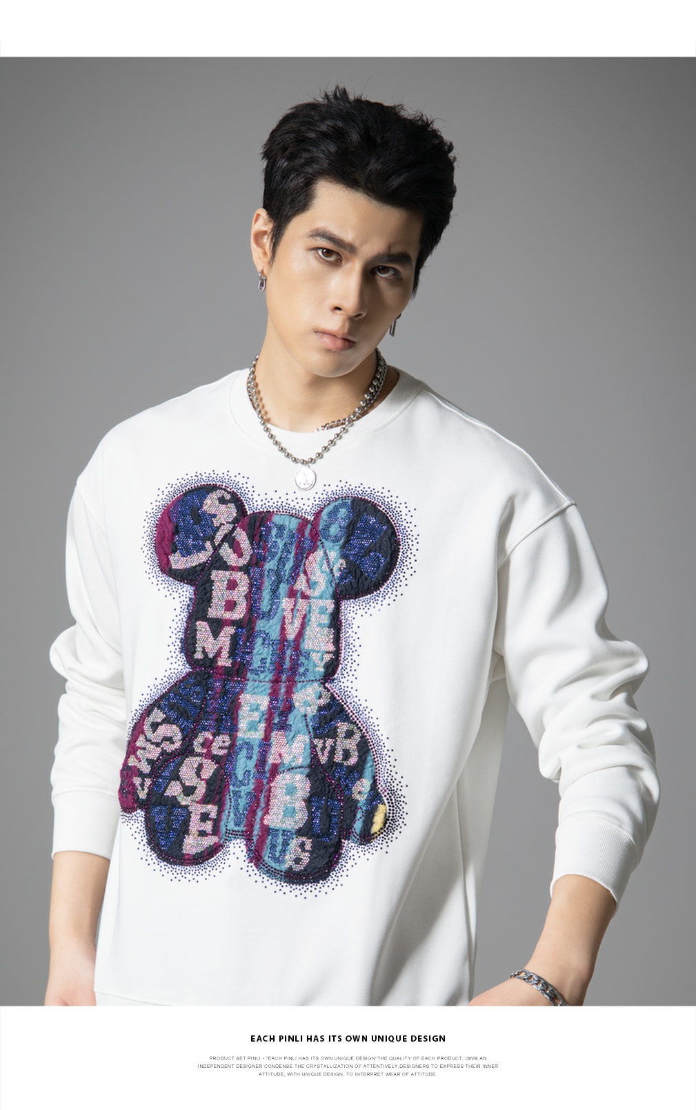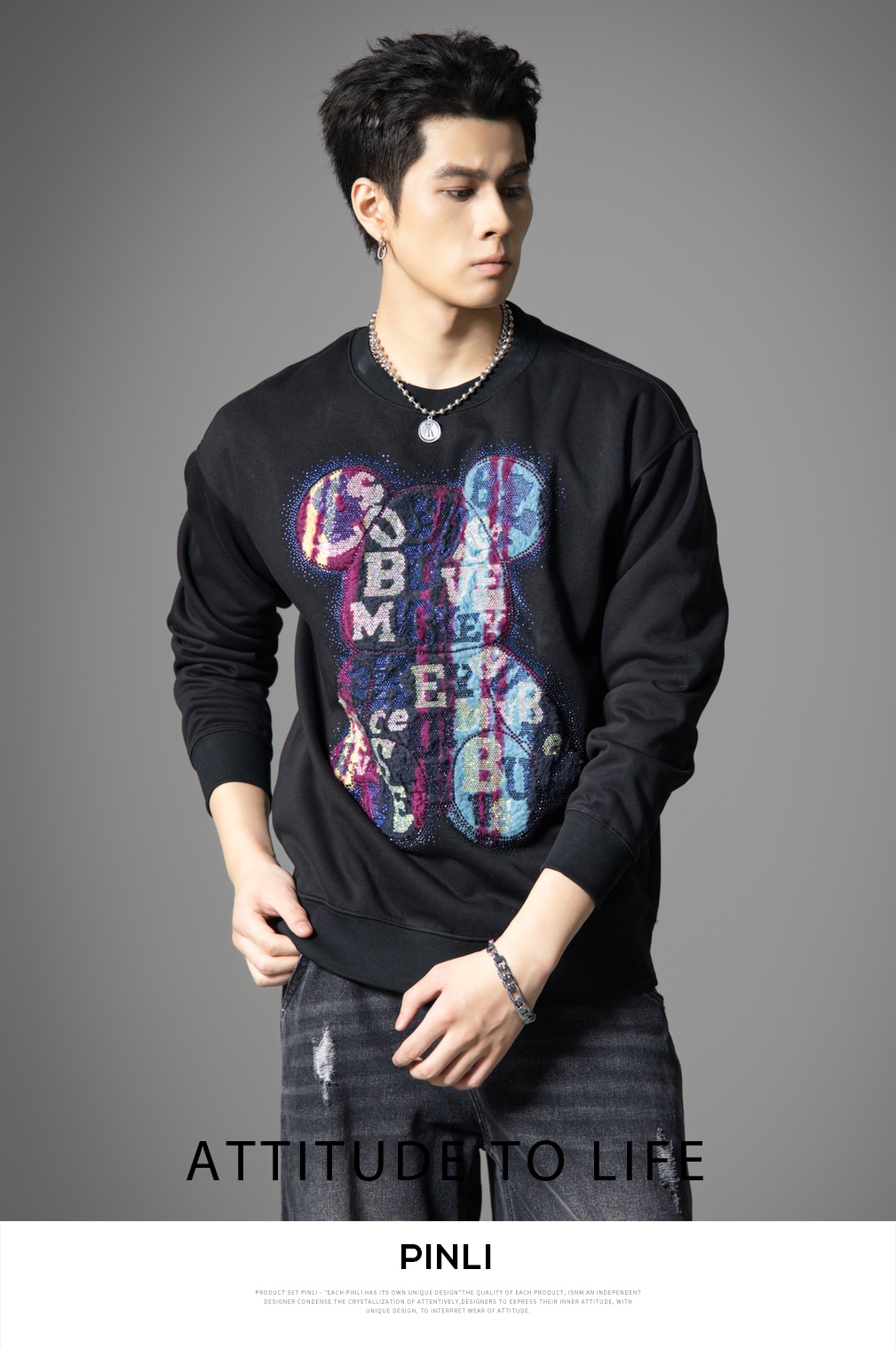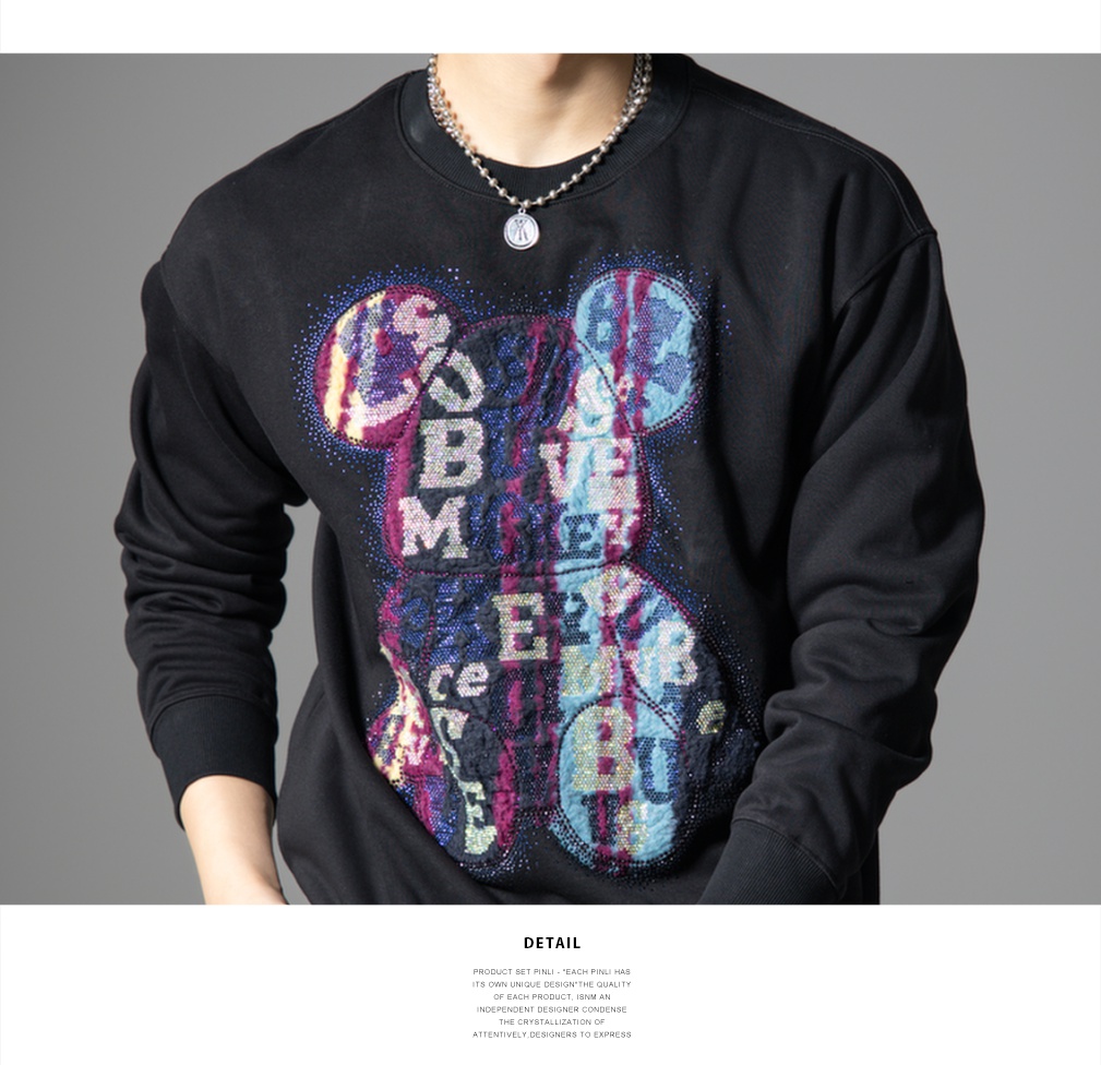 PINLI品立2025秋季新款男宽松圆领卫衣美式潮牌小熊烫钻长袖上衣BG251109003