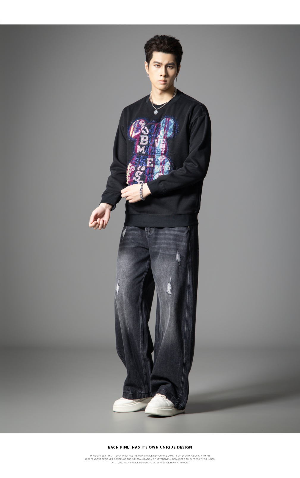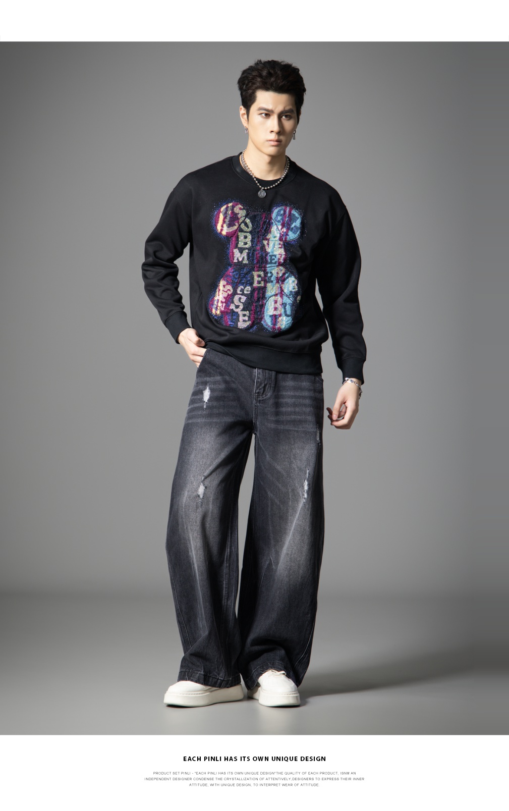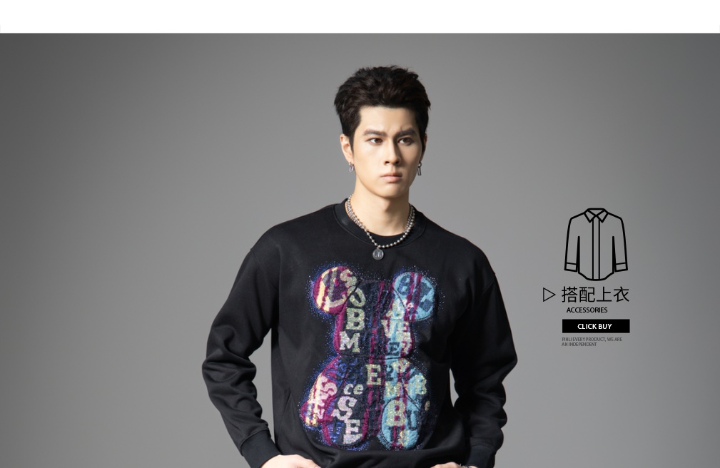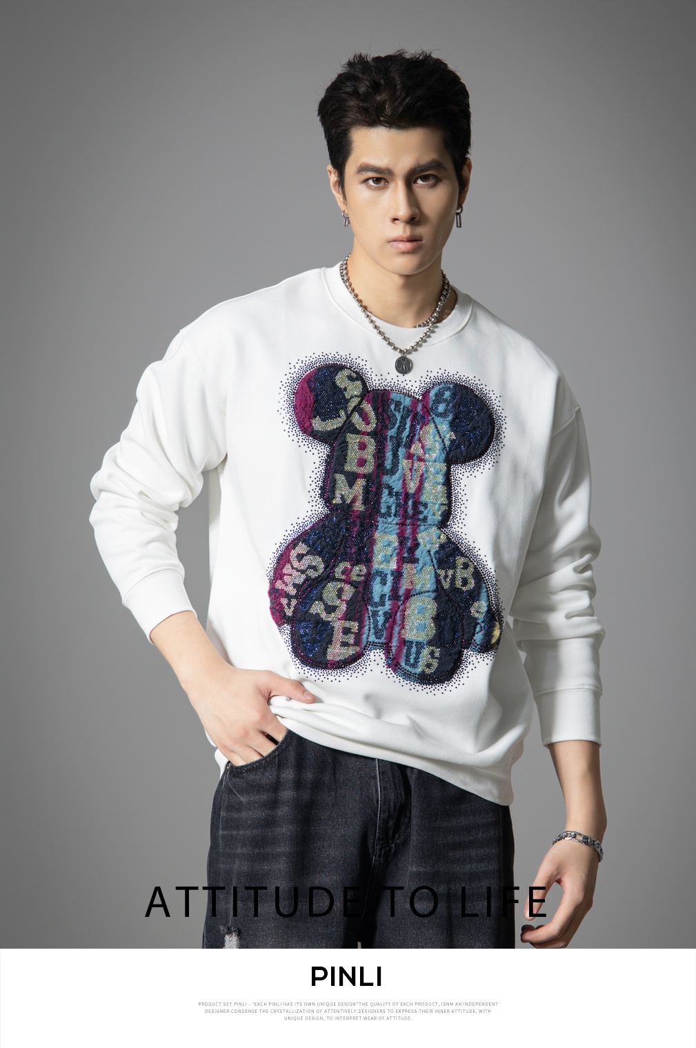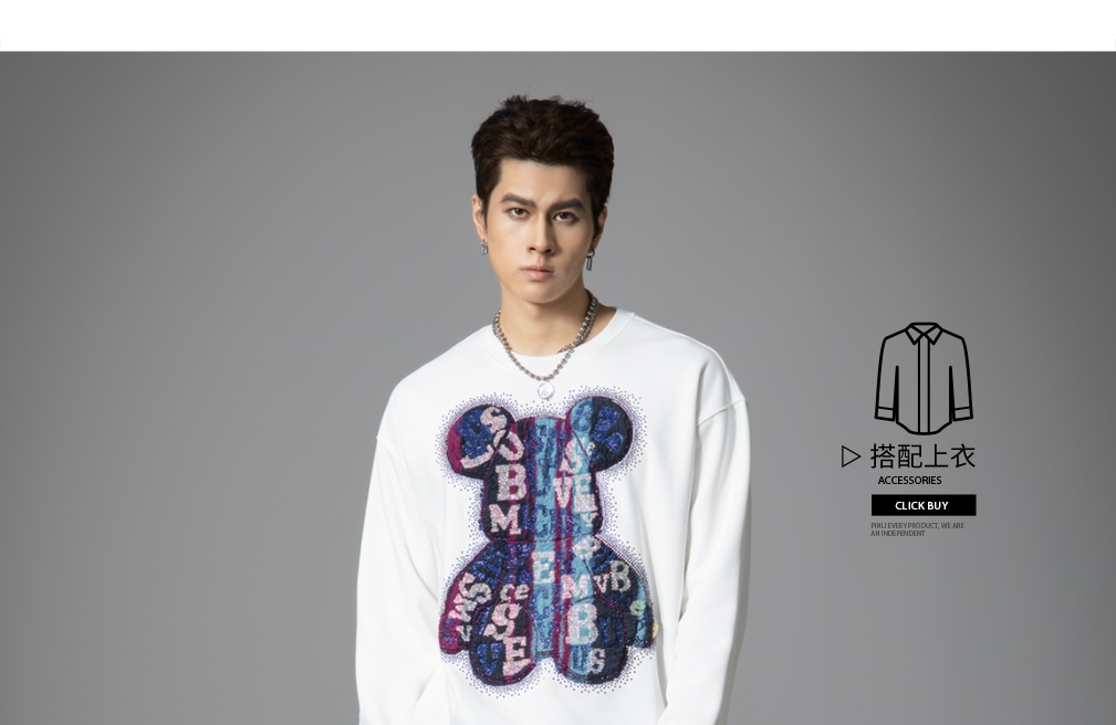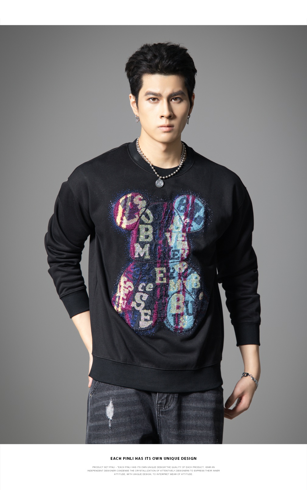 PINLI品立2025秋季新款男宽松圆领卫衣美式潮牌小熊烫钻长袖上衣BG251109003