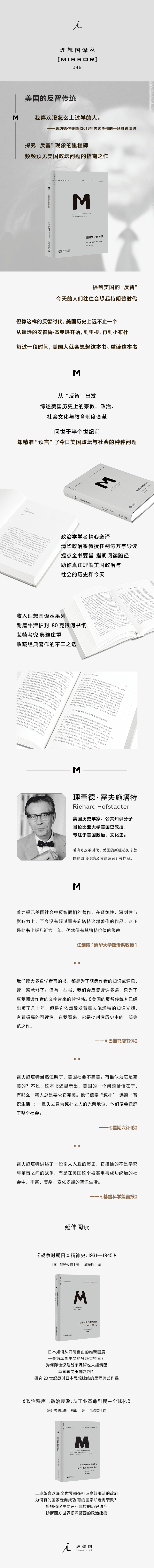 在本书中,霍夫施塔特以“反智”为切入口,综述美国的政治、宗教、社会、文化和商业历史,或回顾学者政客的唇枪舌剑,或罗列扎实可信的数据材料,在严肃批评中信手夹入三五行诙谐的掌故,于紧凑叙述后顺带跟上一两句辛辣的讽刺;须微观时,则描摹政坛商界之怪状,须宏观时,则鞭辟信仰思想之腠理。这本书流传数十年,不啻为介绍美国反智传统的经典之作,更是呈现出一副鲜为人知、入木三分的美利坚面孔。