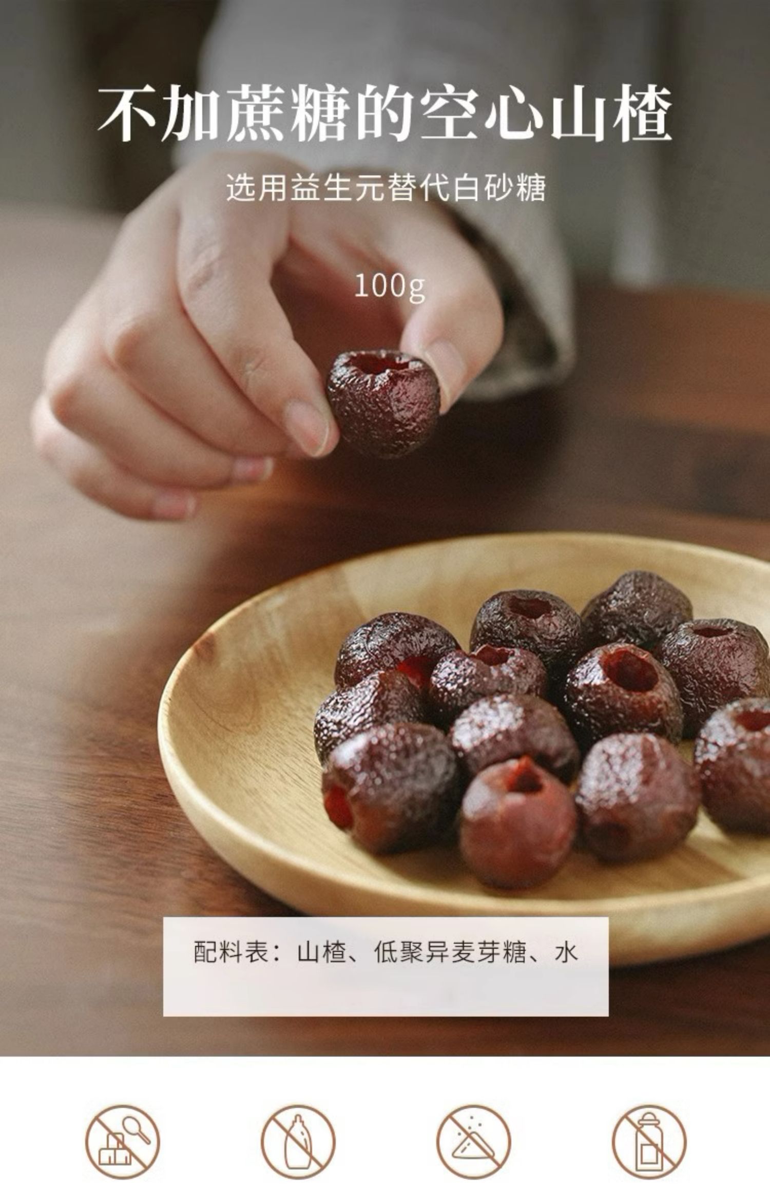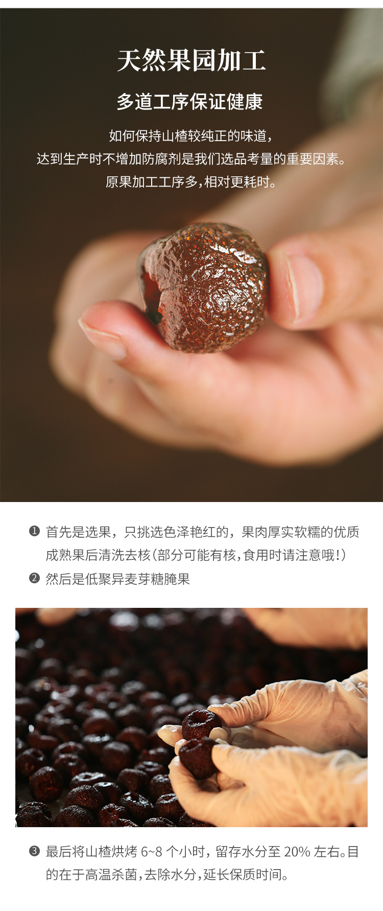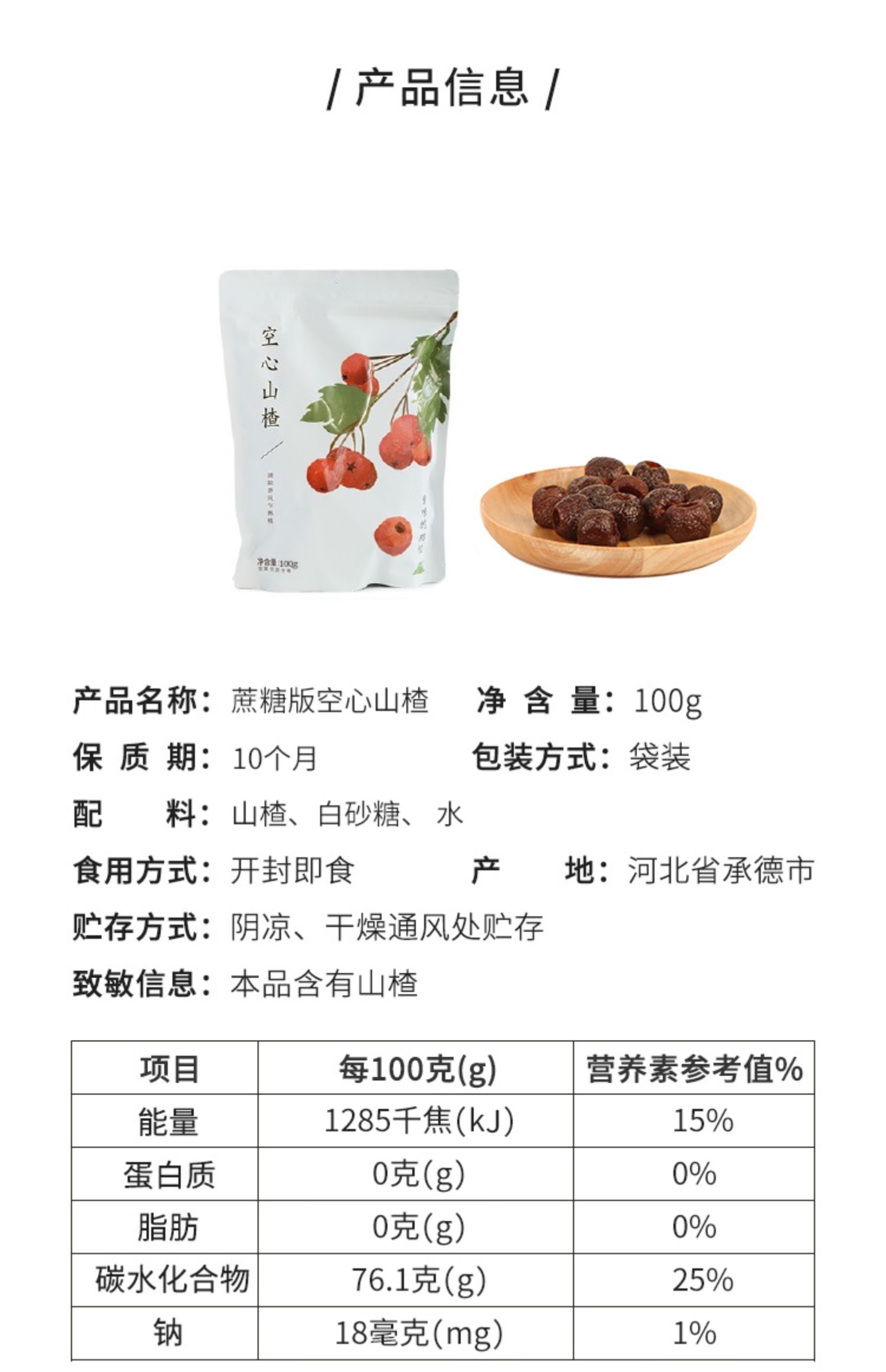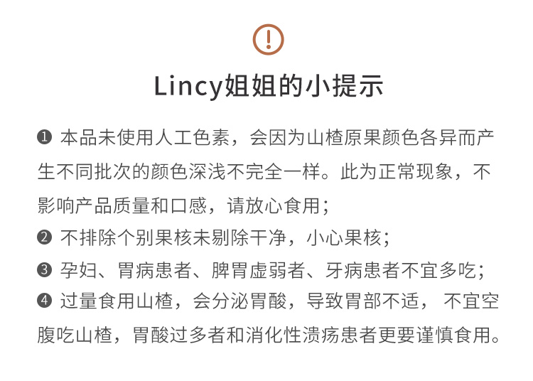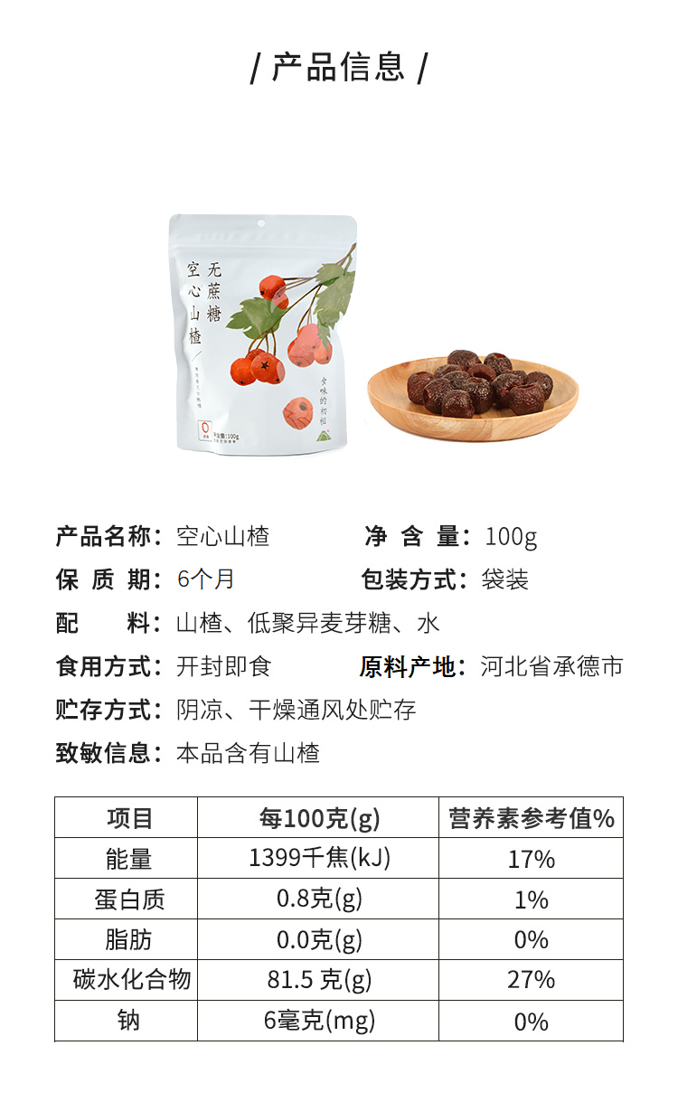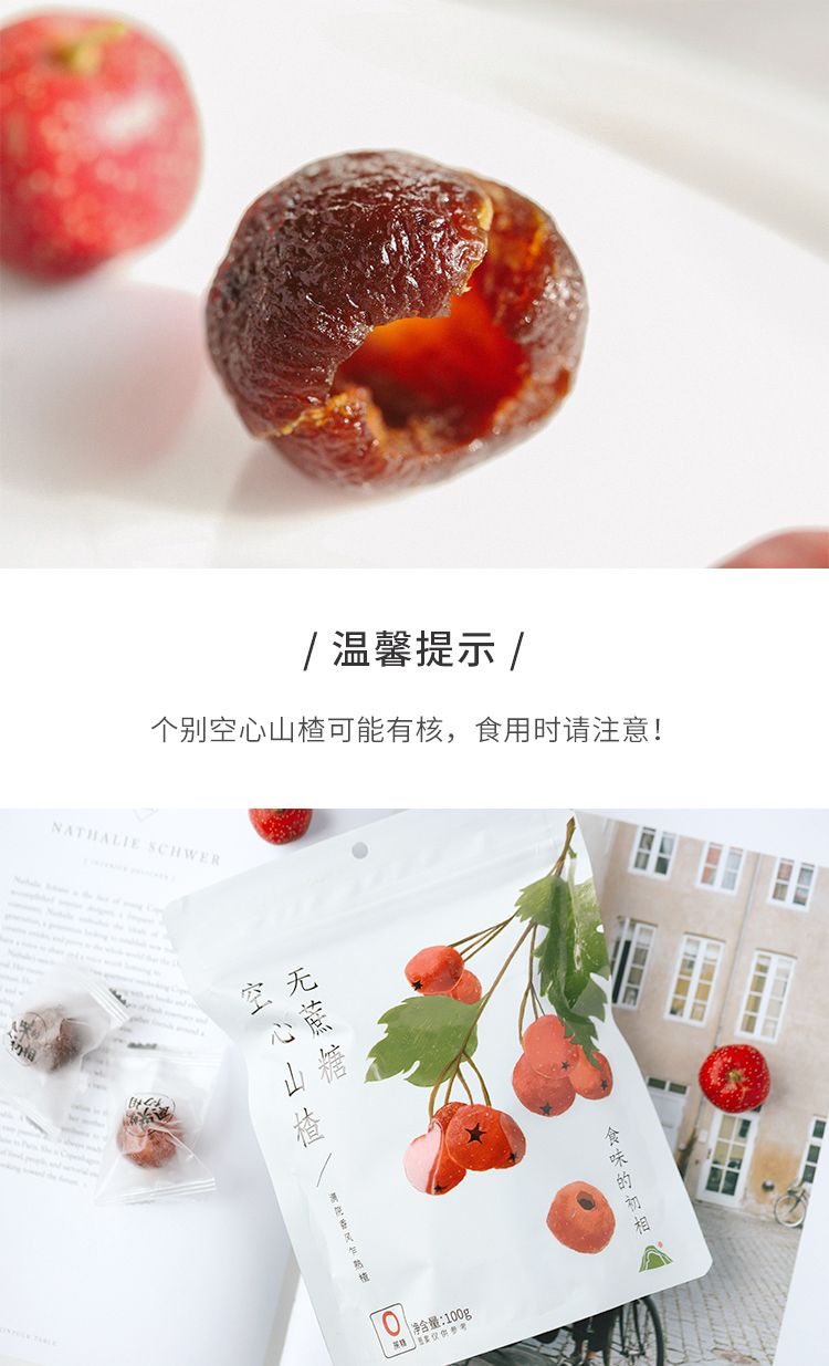 备注:空心山楂100g约14小颗哟~为使空心山楂口感更为软糯,制作工艺升级,包装袋上会有少量糖液附着,为正常现象,不影响品质。