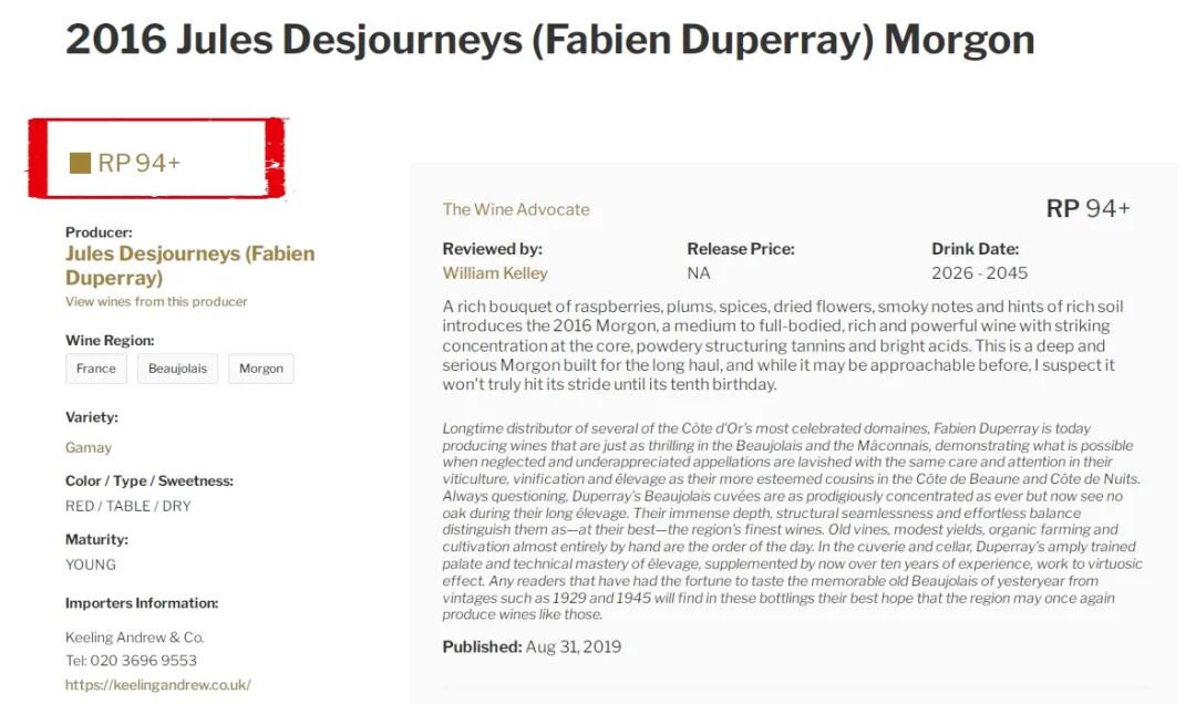 不出意外,Jules Desjourney的干红直接横扫Wine Advocate博若莱前九高分,酒神Allen Meadows也全给予90+高分及“小红心”推荐,人送外号“博若莱的DRC”。