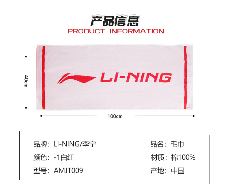 李宁羽毛球毛巾纯棉透气AMJT007吸汗运动毛巾